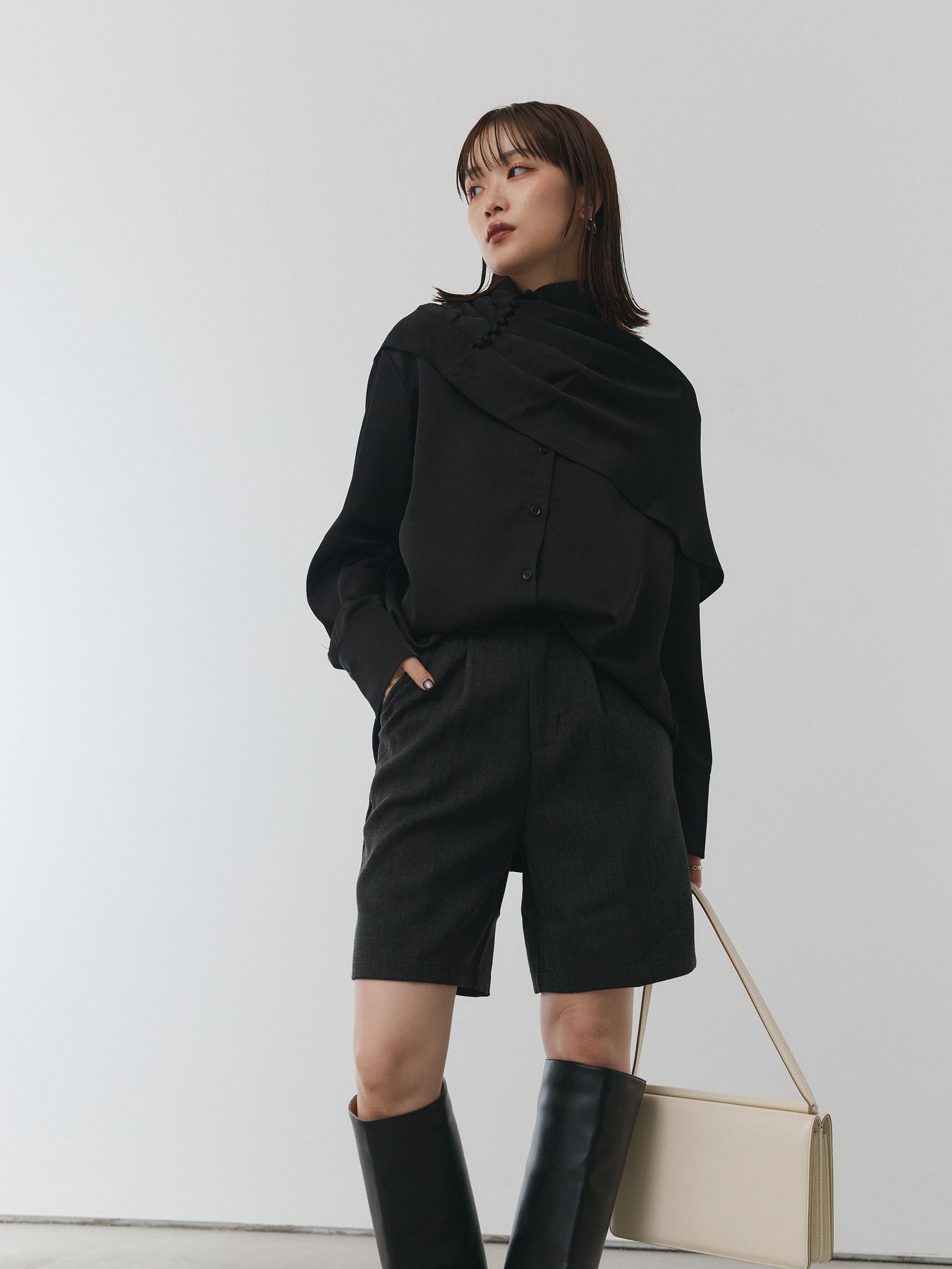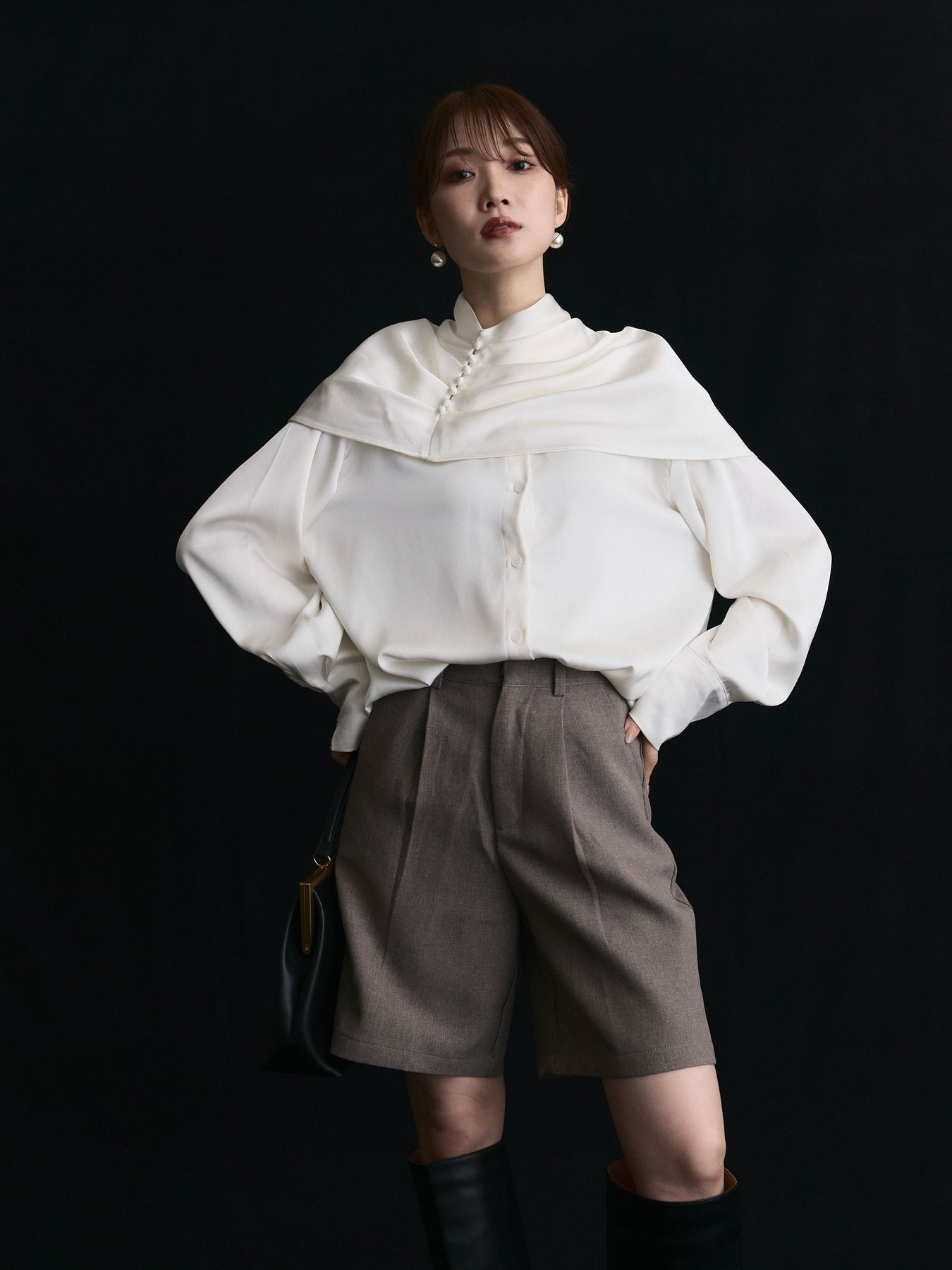 【Allure】[SET]ケープ付サテンシャツ+ウールライクハーフパンツ(2set)