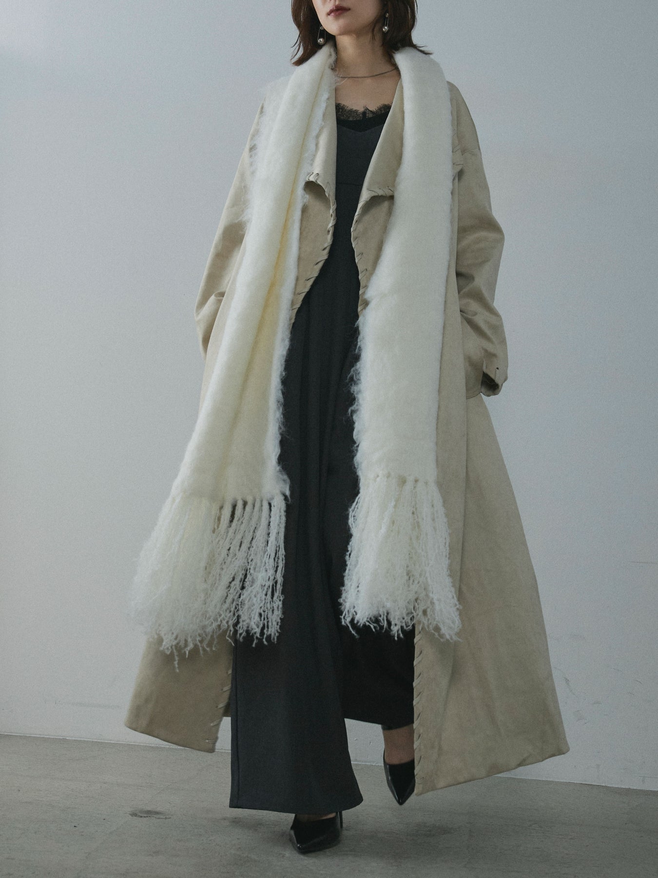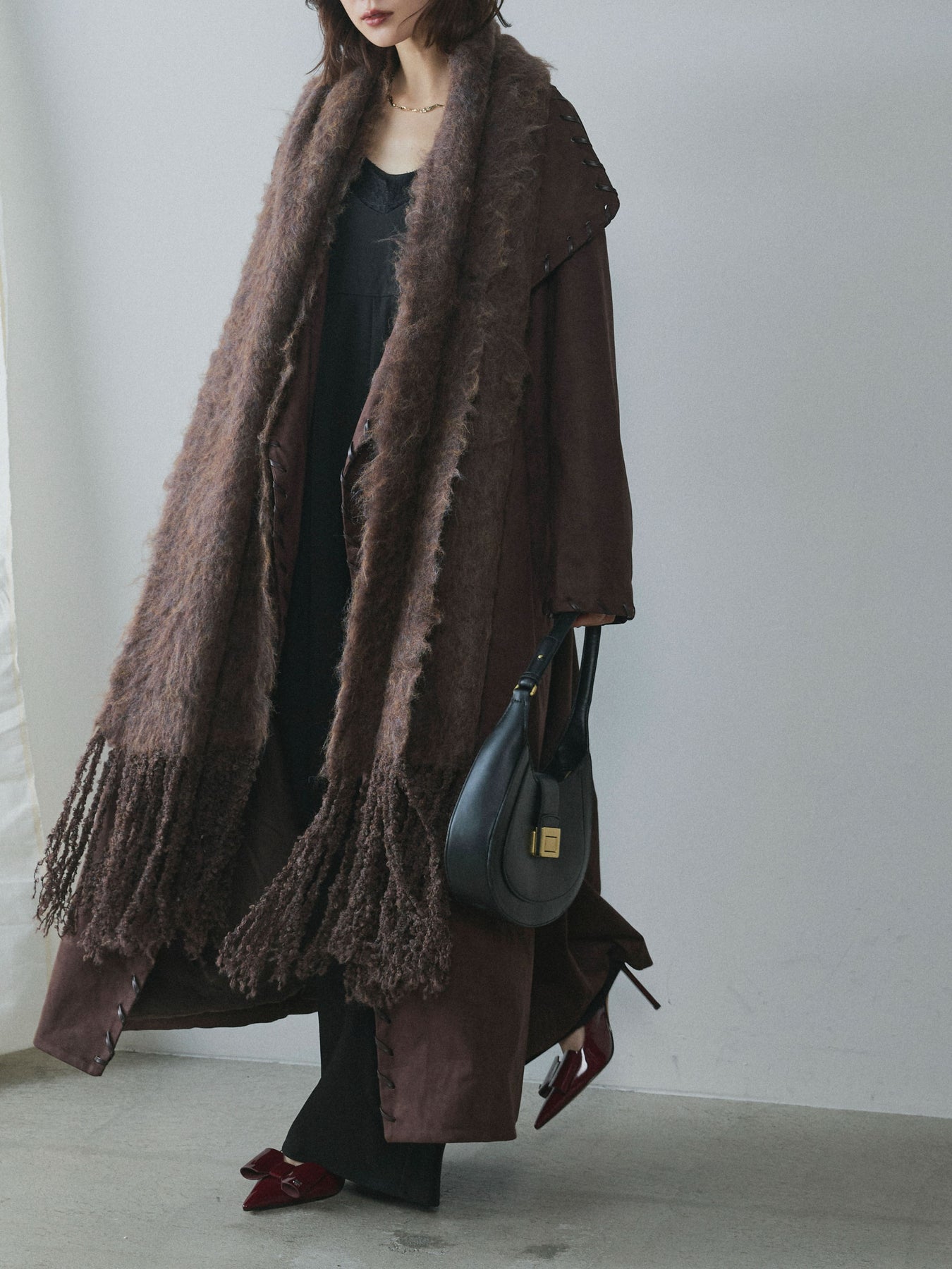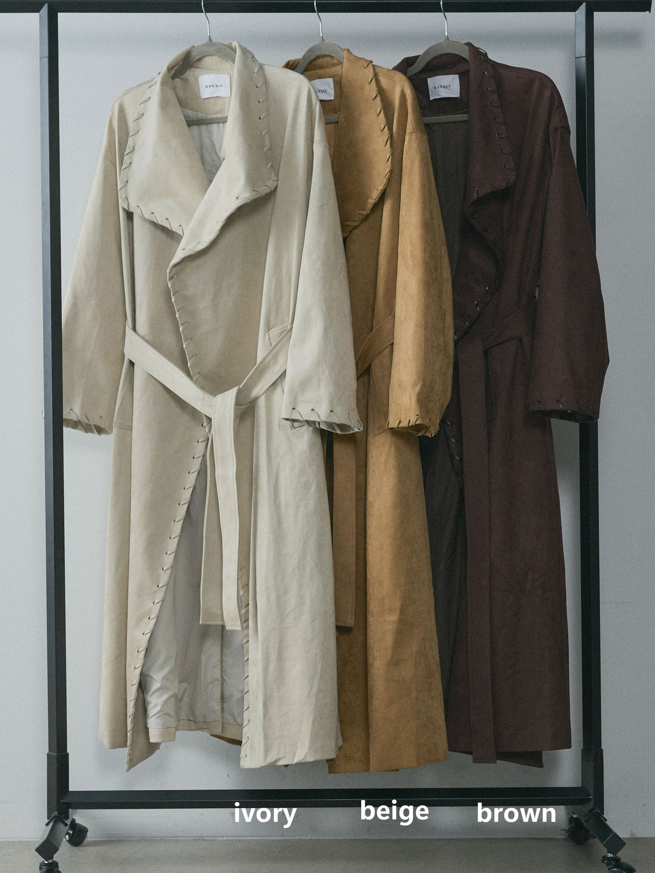 柔らかな風合いと上品なマット感が魅力のスウェード調素材を使用したロングコート。全体に施されたハンドステッチが、クラフト感と温かみを添え、羽織るだけでスタイルのアクセントに。程よい厚みと軽やかな着心地で、秋から冬にかけてロングシーズン活躍。ウエストベルト付きでシルエットの変化も楽しめ、カジュアルからきれいめまで幅広い着こなしにマッチします。