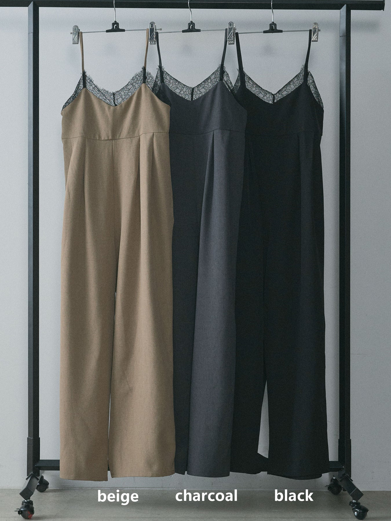 繊細なレースをあしらった胸元のデザインが、シンプルながらも女性らしさを引き立てるキャミオールインワン。華奢な肩紐と広がりすぎないストレートシルエットで、スタイルアップも叶うバランスに仕上げました。インナー次第でシーズンレスに活躍し、ジャケットやカーディガンとのレイヤードにもおすすめな一着です。