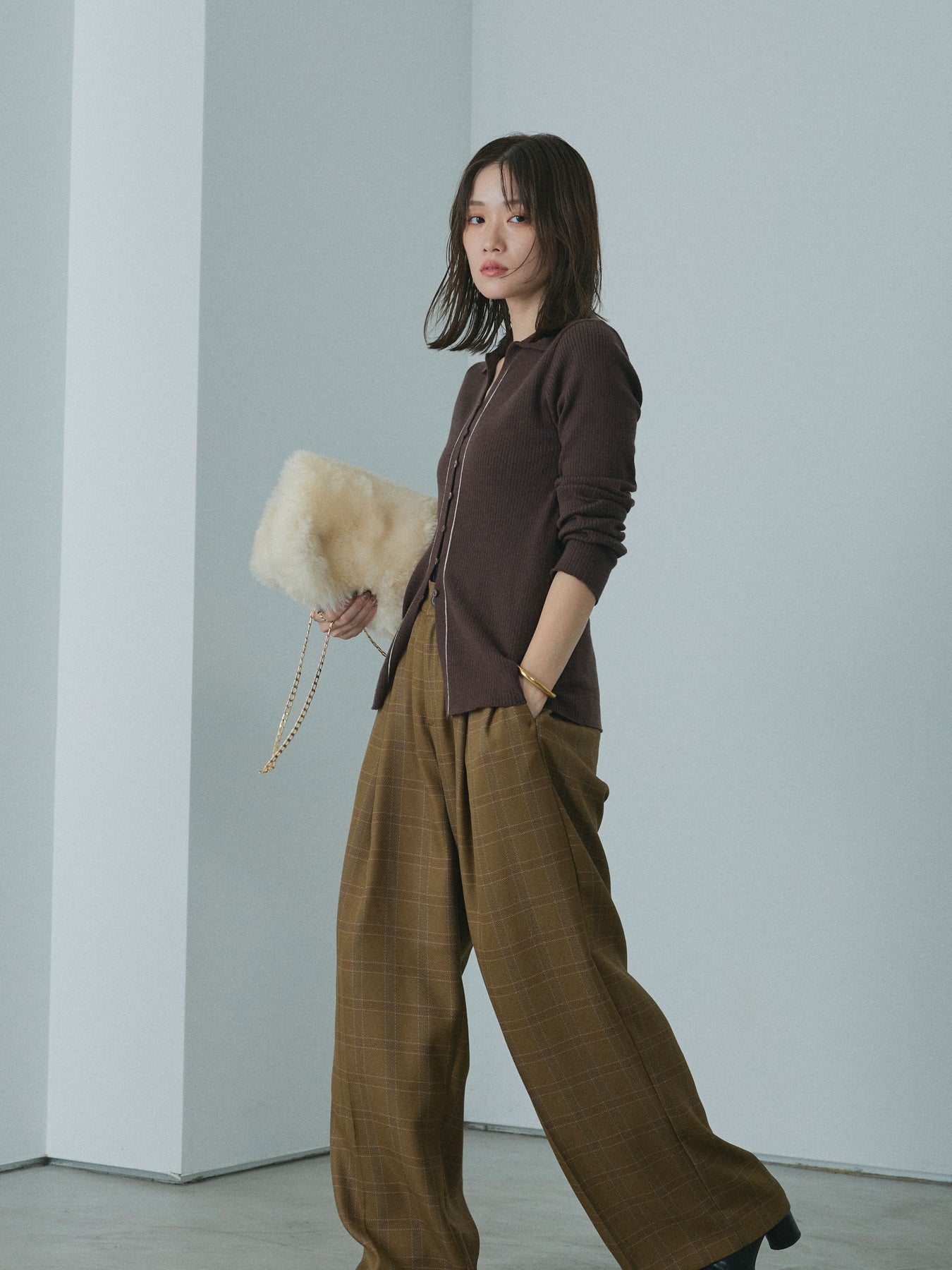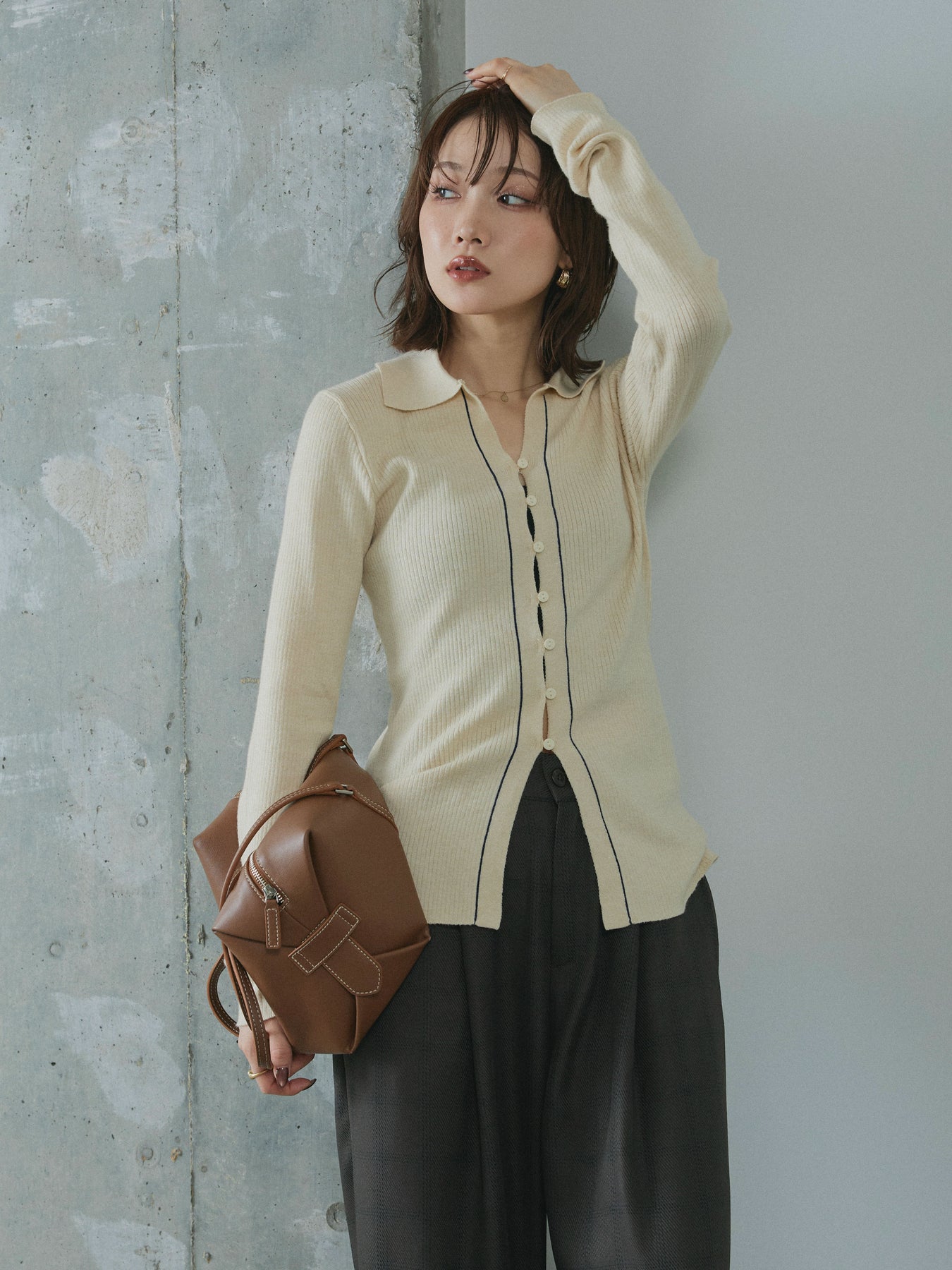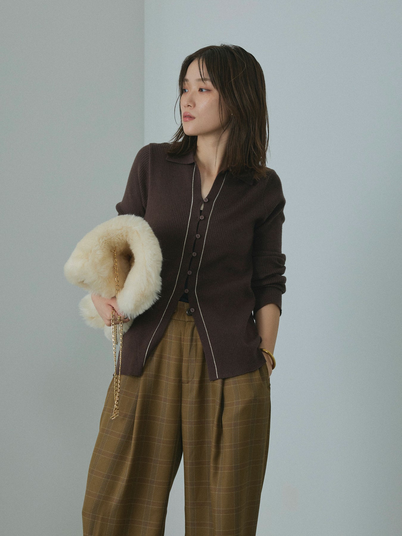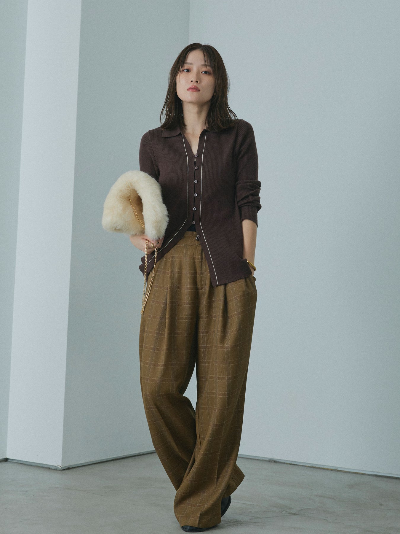 【Allure】[SET]リブ配色ラインポロニットカーディガン+杢チェックタックパンツ(2set)