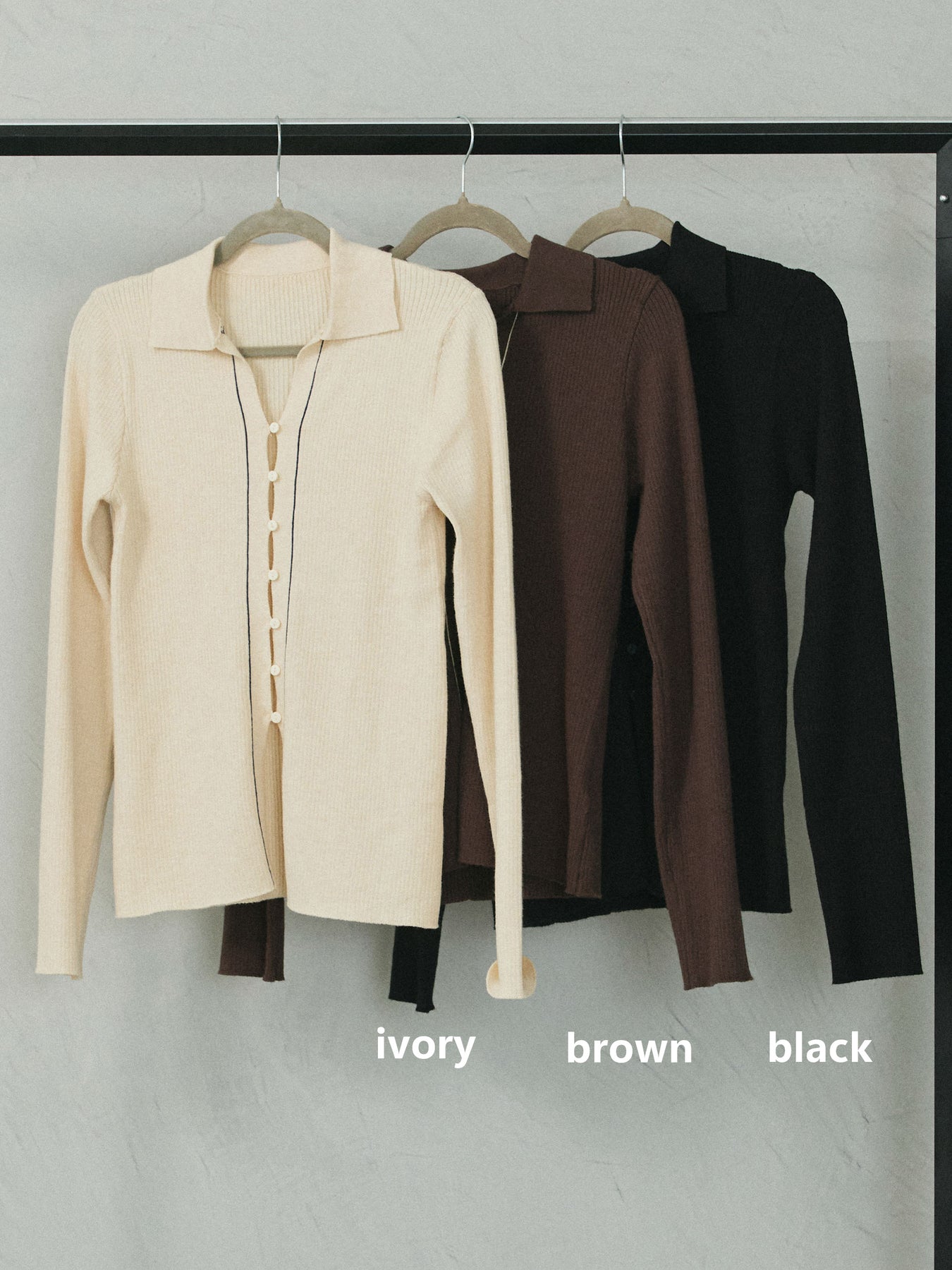 リブの縦ラインがすっきりとした印象を与えるポロニットカーディガン。 程よい厚みと伸縮性のある素材で、身体に優しくフィットしながらも窮屈さを感じさせない着心地です。 襟付きデザインが上品さをプラスし、フロントのボタンラインに配したさりげない配色がスタイリングのアクセントに。 一枚でトップスとしても、羽織としても活躍する万能アイテムです。 デニムやスラックスなど、どんなボトムとも相性が良く、シーズンを問わず長く愛用できる一着。 ※ボトムス、キャミソール(インナー)以外の商品は一律でインナーは付属していません。