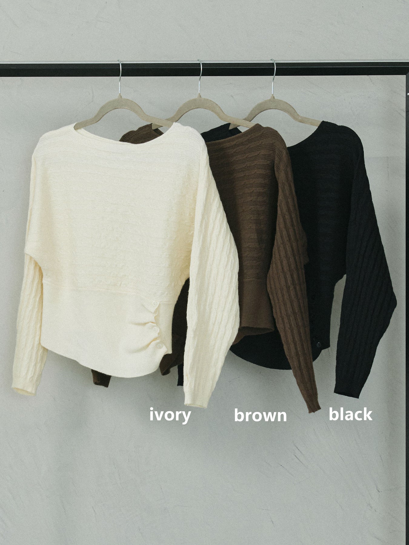片方の肩をさりげなく覗かせるデザインが魅力のワンショルダーニット。 ケーブル編みの立体感がほどよく存在感を放ち、シンプルながらもスタイリングの主役になる一枚です。 柔らかく伸縮性のある素材で着心地が良く、ボディラインを拾いすぎない絶妙なシルエットに仕上げました。 デニムでカジュアルに、スカートで女性らしくと、幅広い着こなしを楽しめます。 シーズンムードを高める素材感とデザインで、トレンドライクな抜け感を演出するアイテムです。 ※ボトムス、キャミソール(インナー)以外の商品は一律でインナーは付属していません。