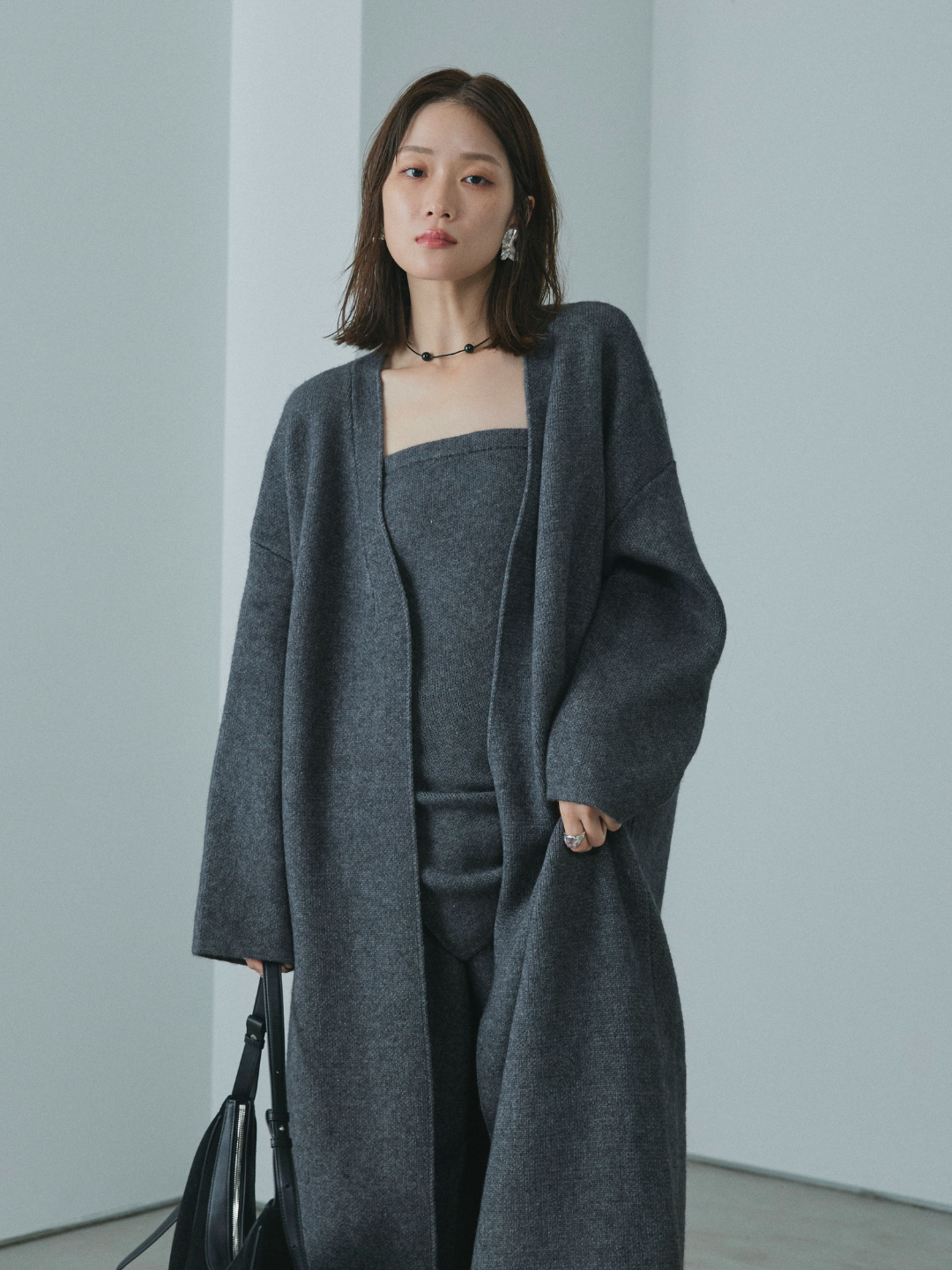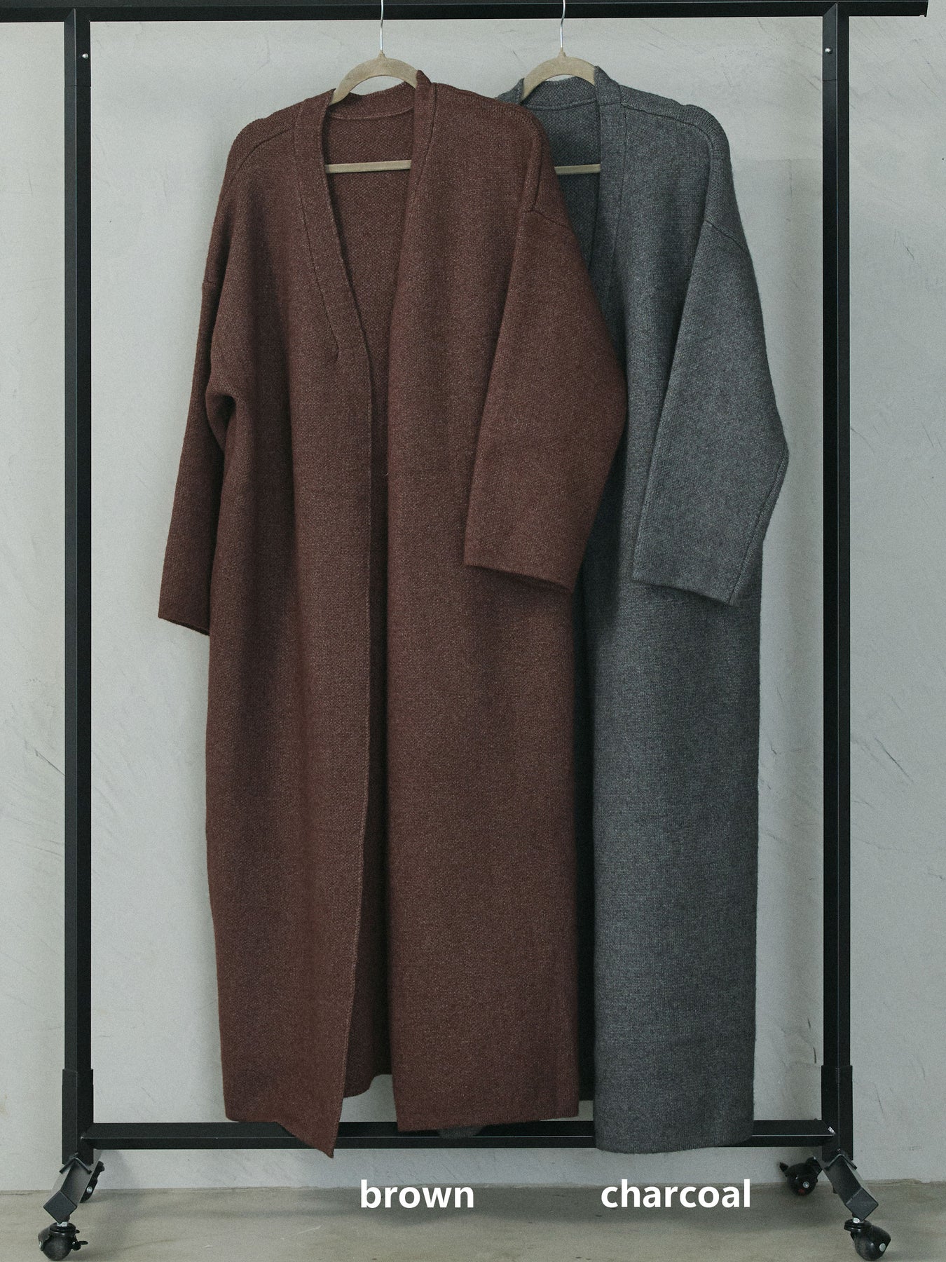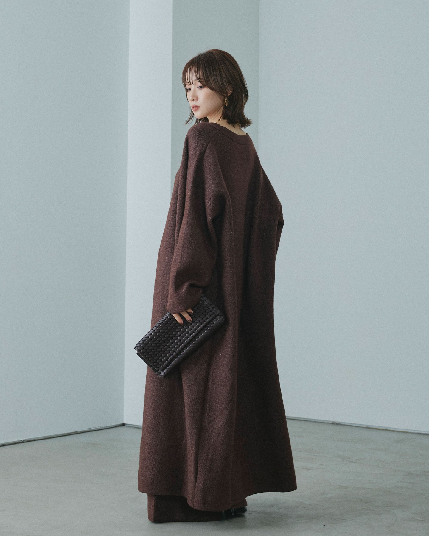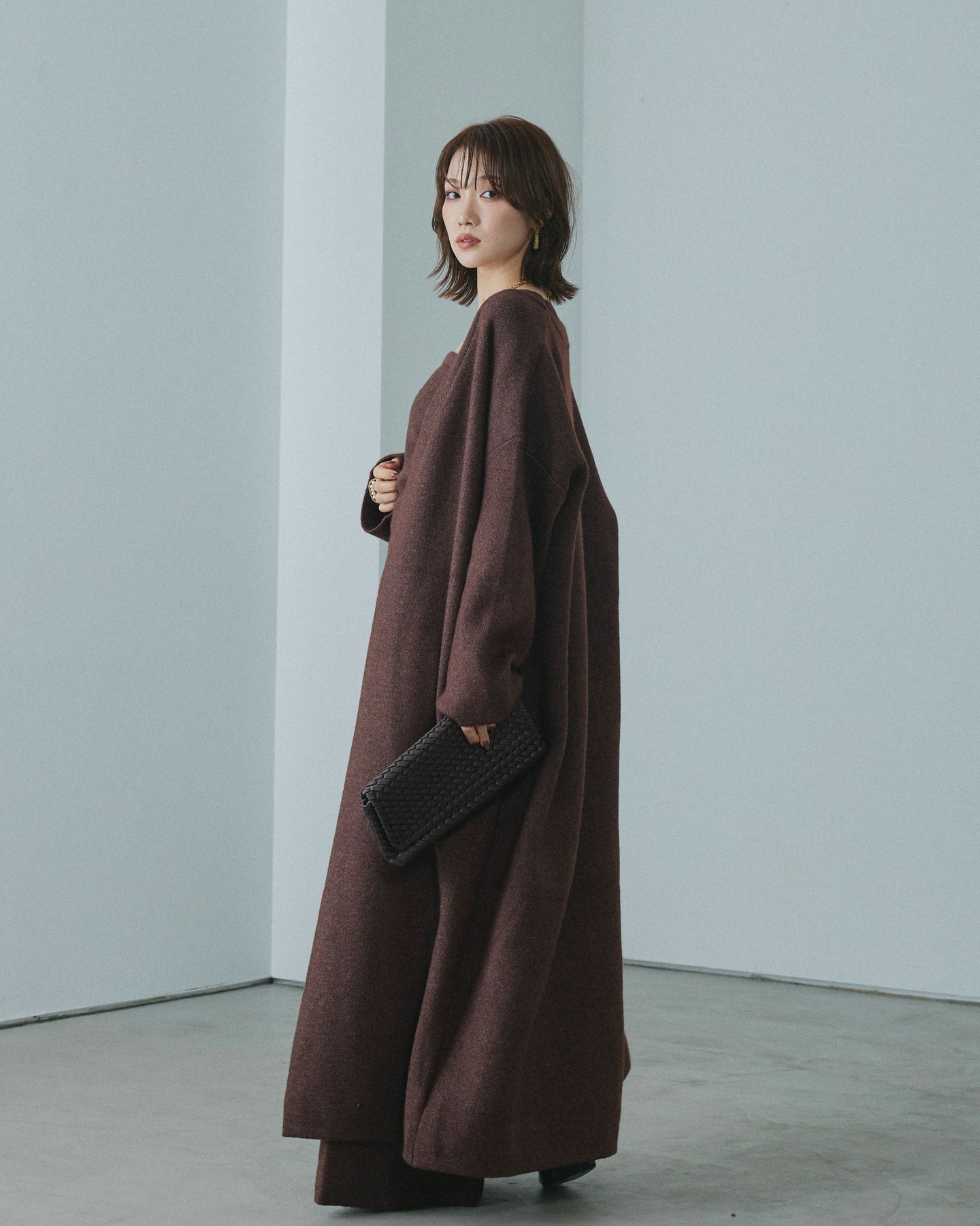 ふんわりと包み込むような着心地が魅力のニットロングガウン。 落ち感のあるシルエットが体のラインを美しく見せ、羽織るだけでこなれた雰囲気を演出します。 やや厚みのある編地で暖かく、軽やかな着心地も嬉しいポイント。 サイドスリットを入れることで動きやすさをプラスし、長時間の着用でも快適に過ごせます。 シンプルながらも存在感のあるデザインで、デイリーにもオフィスにもマッチする万能アイテムです。