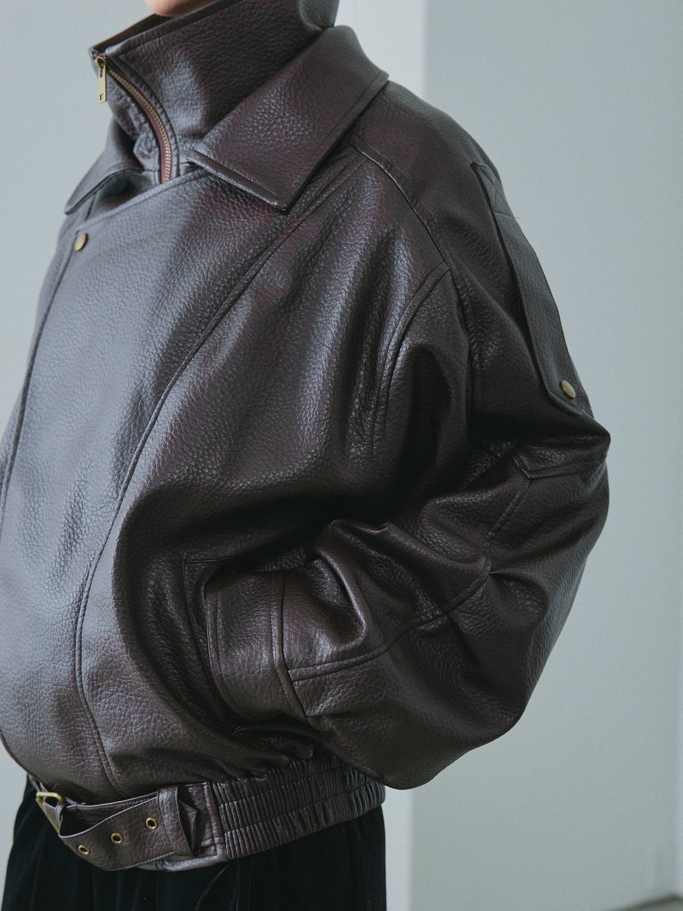 程よい艶感と重厚感のあるフェイクレザーを使用したスタンドカラーブルゾン。 ややオーバーサイズなシルエットで、羽織るだけでモードな雰囲気を演出します。 柔らかく馴染むフェイクレザー素材が、メンズライクな印象の中にも女性らしさを引き立てる一着。 首元までしっかり閉められるスタンドカラー仕様で、防寒性とデザイン性を両立。 裾や袖口のベルトディテールがアクセントとなり、シンプルなスタイリングに深みを加えます。 デイリーから特別な日のコーディネートまで幅広く活躍するアイテムです。 ※ボトムス、キャミソール(インナー)以外の商品は一律でインナーは付属していません。