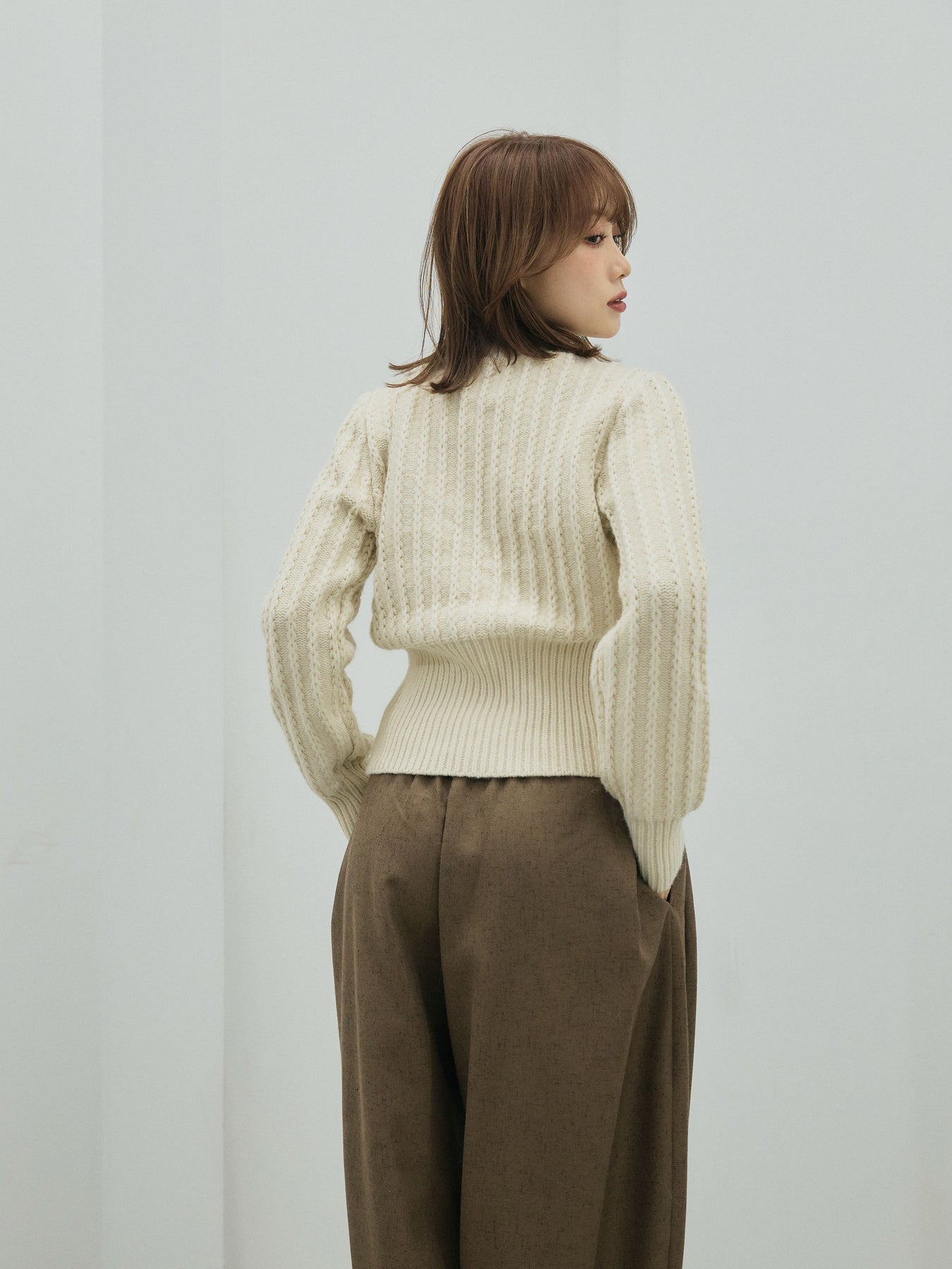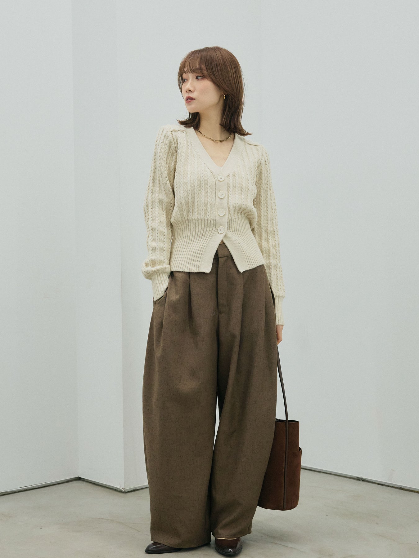 【Allure】[SET]編みこみVネックニットカーディガン+モックスカルゼサイドタックコクーンパンツ(2set)