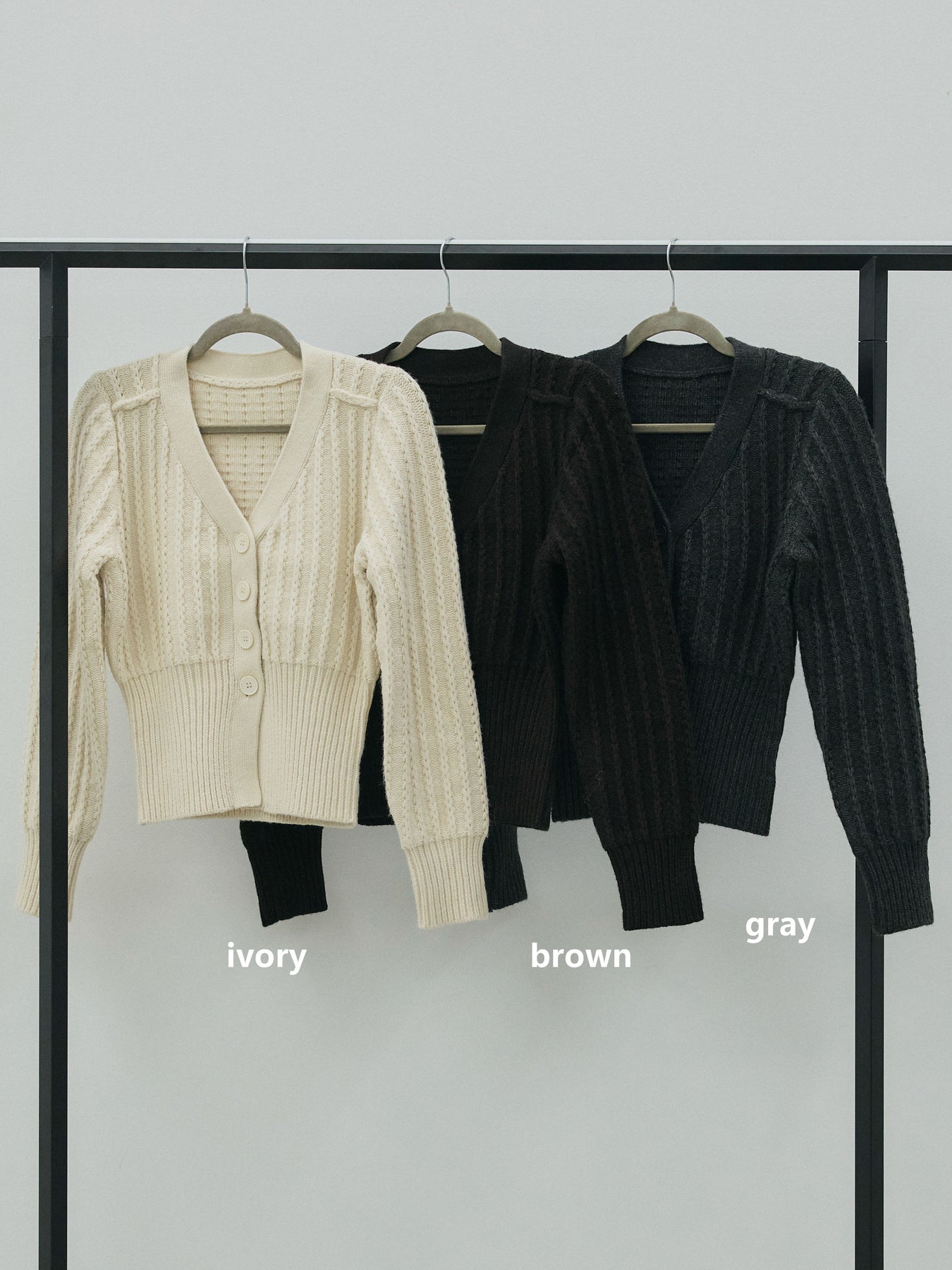 編み模様が立体的に浮かび上がる表情豊かなVネックカーディガン。 身体に程よくフィットするシルエットと、太めのリブがウエストラインを自然にマークし、スタイルアップ効果も期待できます。 重くなりがちな秋冬の装いを引き締めるようなディープトーンで、大人の女性らしさを引き立てる1枚。 フロントを閉じてトップスのように着るのはもちろん、羽織りとしても活躍する着回し力の高さが魅力です。