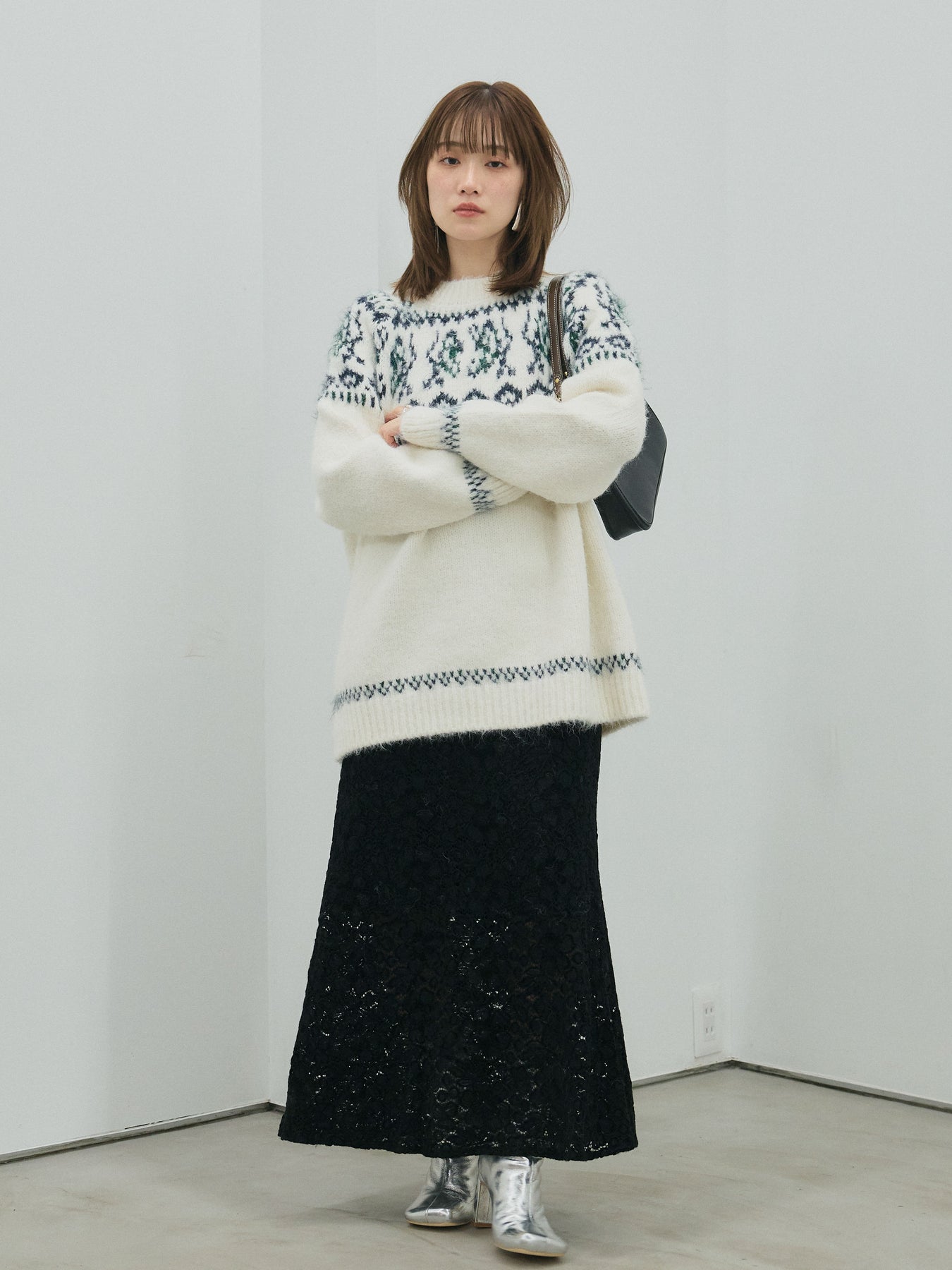【Allure】[SET]ノルディック柄モックネックオーバニットプルオーバー+起毛レースストレッチナロースカート(2set)