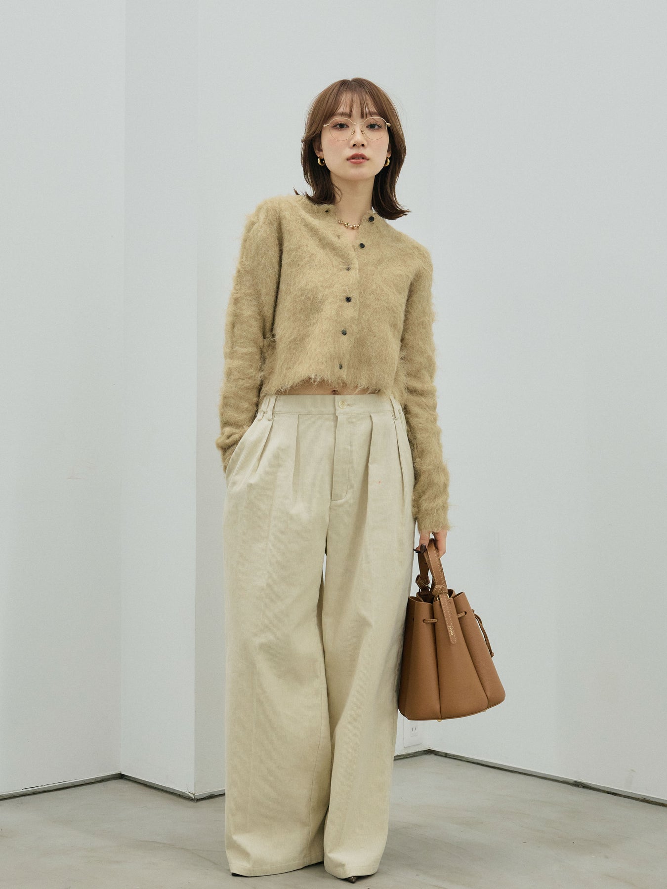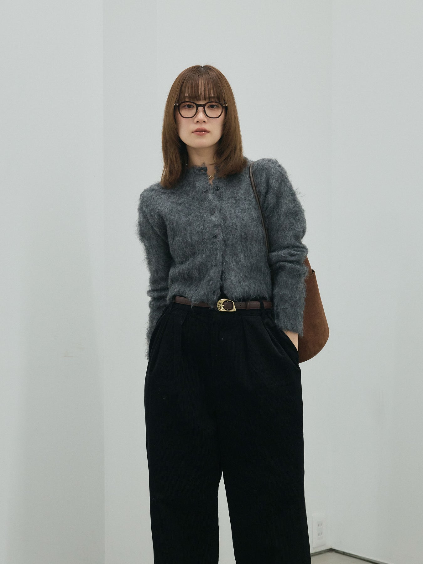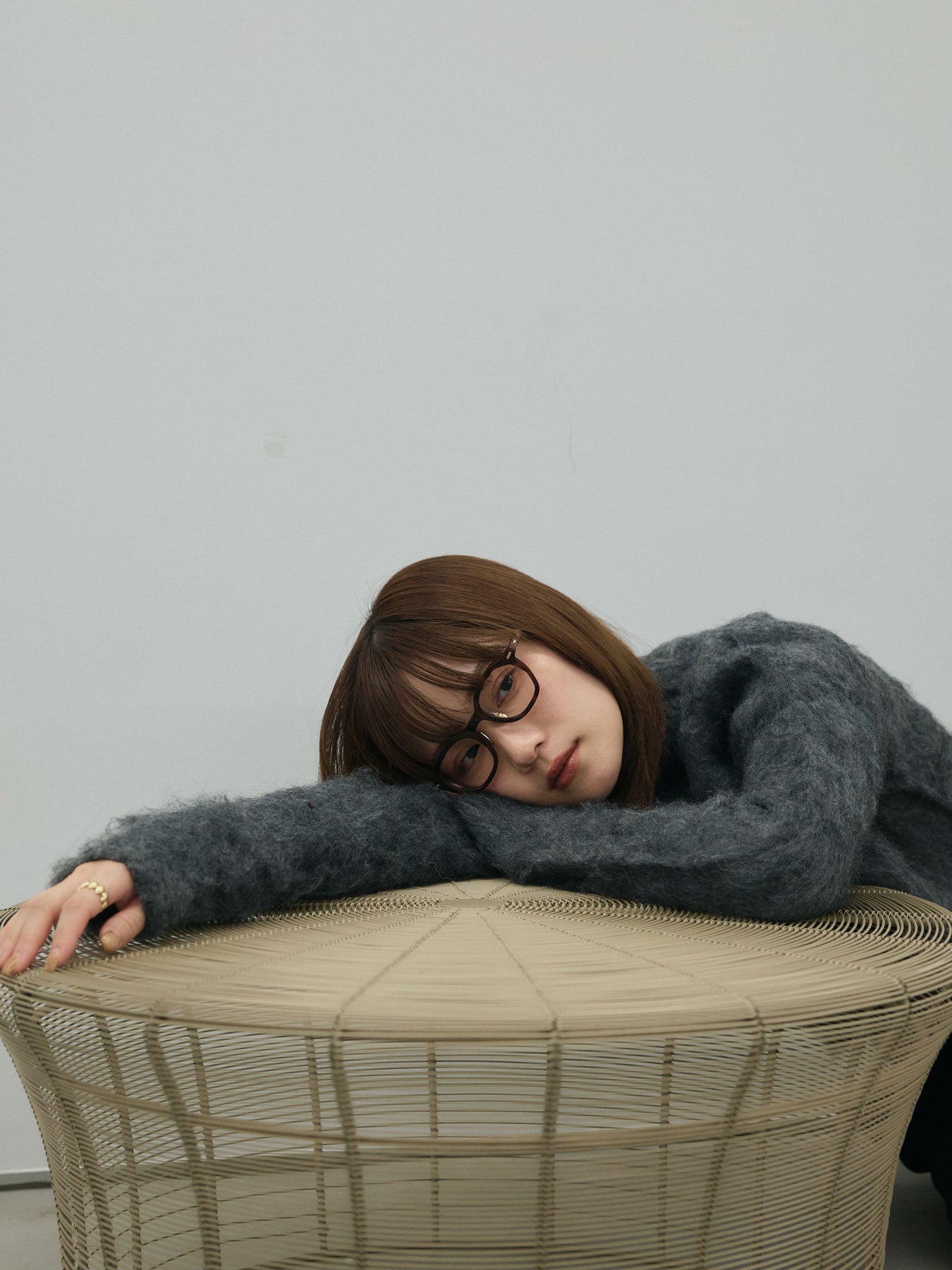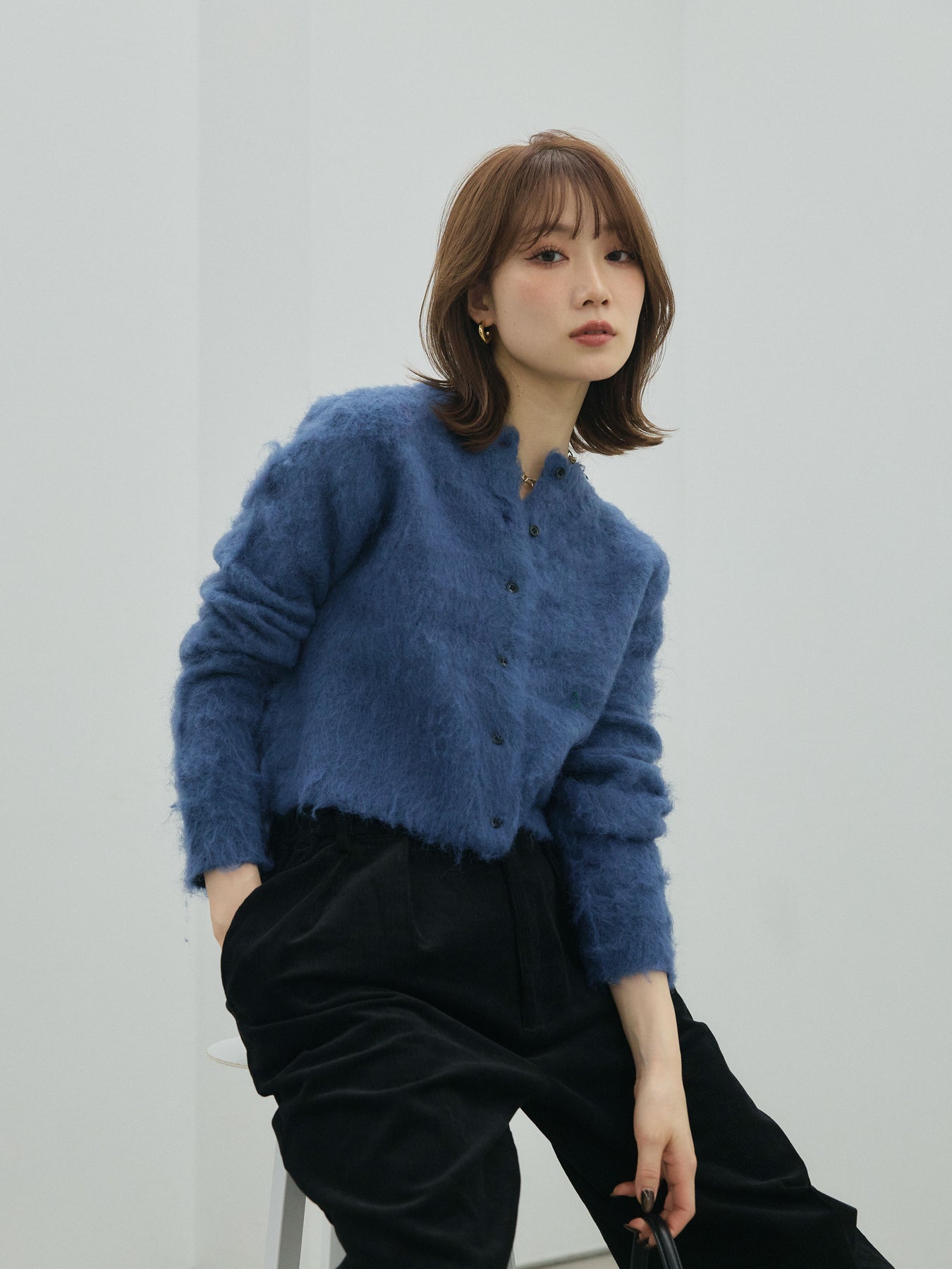 毛足の長いふんわりとしたモヘアタッチ素材が魅力のニットプルオーバー。 短めのクロップド丈とコンパクトなシルエットが今年らしく、ボリュームのあるボトムスとも好相性。 ベーシックながらもフロントの小さめボタンがアクセントになり、シンプルながら程よく抜け感のあるスタイルに仕上がります。 軽やかな着心地でありながら暖かく、秋冬シーズンの着回しアイテムとして重宝する一枚です。