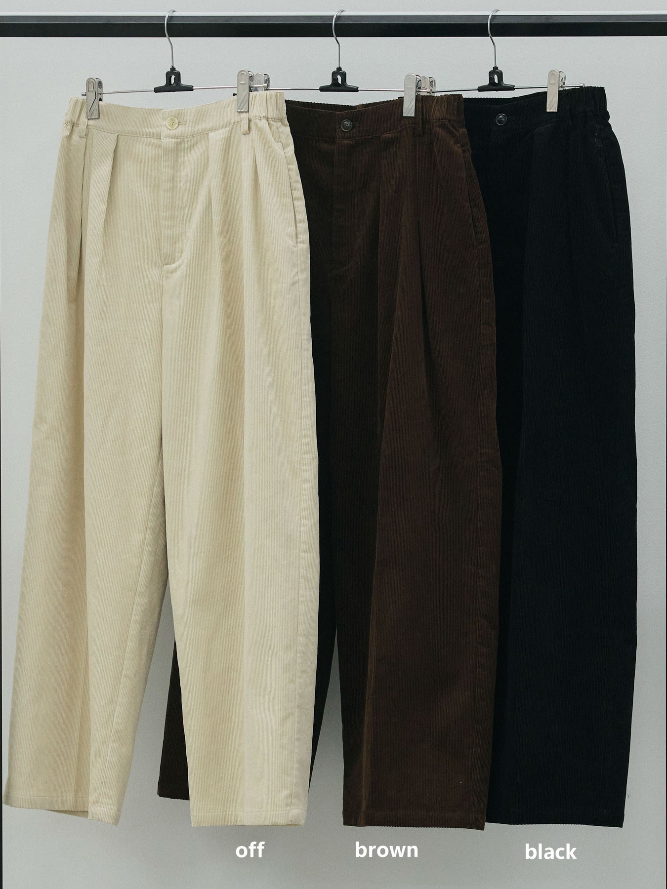 温かみのあるコーデュロイ素材を使用したワイドシルエットパンツ。 深めのタックとゆったりとしたワイドラインが、程よくリラクシーかつ洗練された印象に。 ウエスト後ろ部分はゴム仕様で、快適な穿き心地を実現しつつ、トップスインもきれいに決まります。 スウェットやニットを合わせたカジュアルな着こなしから、ブラウスとのミックススタイルまで幅広く活躍します。