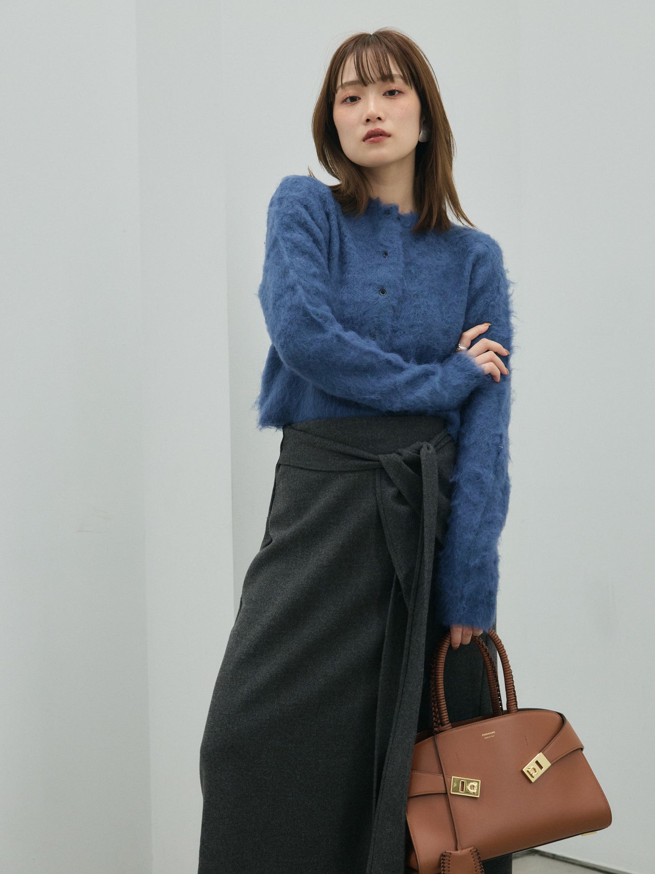 【Allure】[SET]モヘアタッチクロップドニットプルオーバー+ウールタッチウエスト巻きスカート(2set)