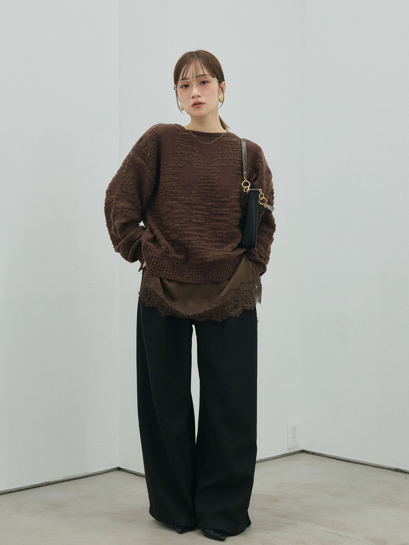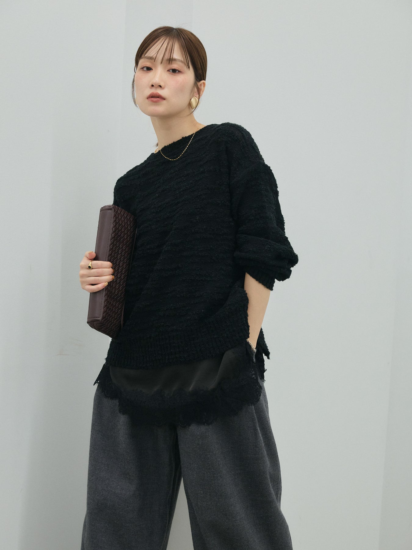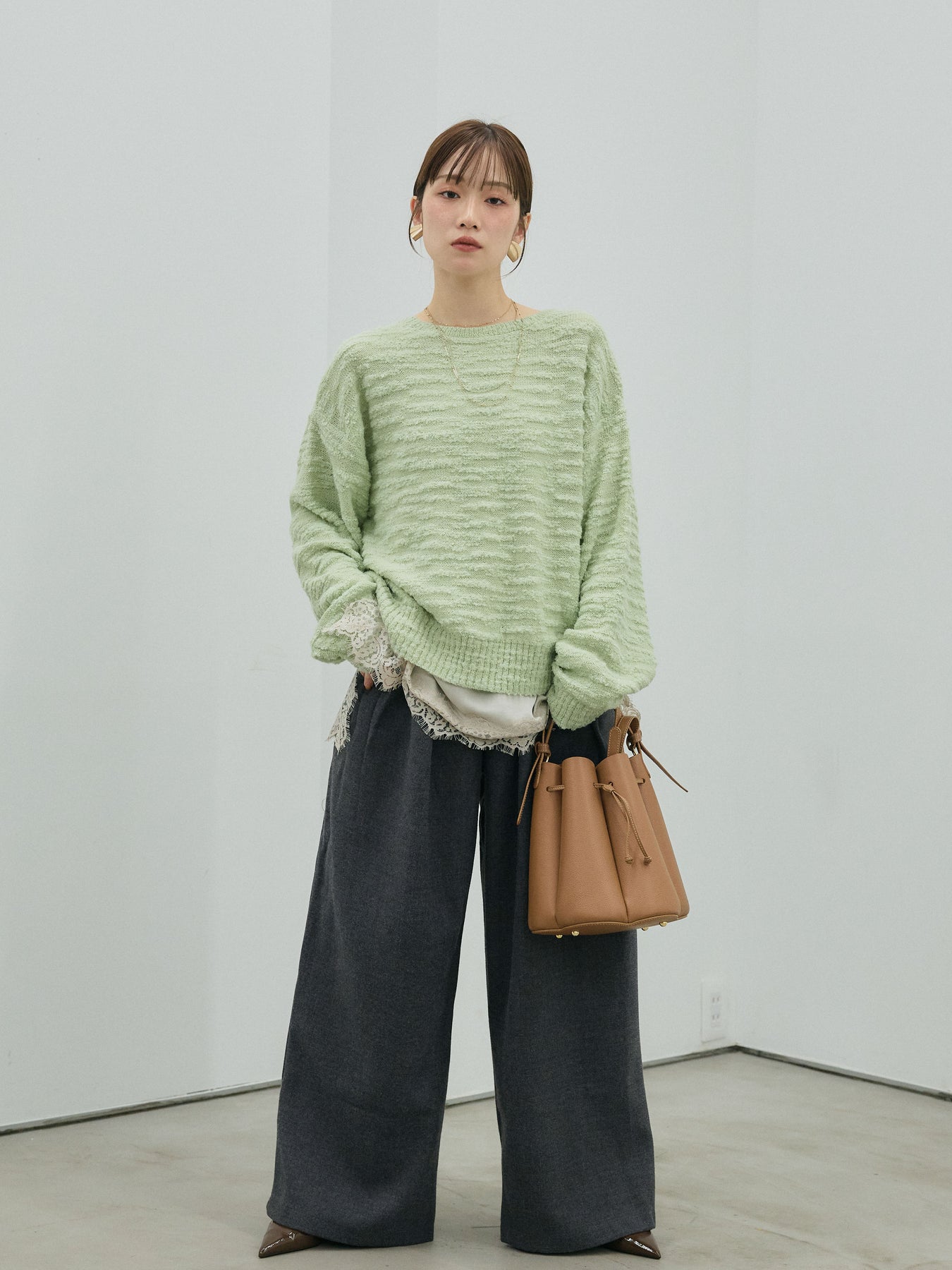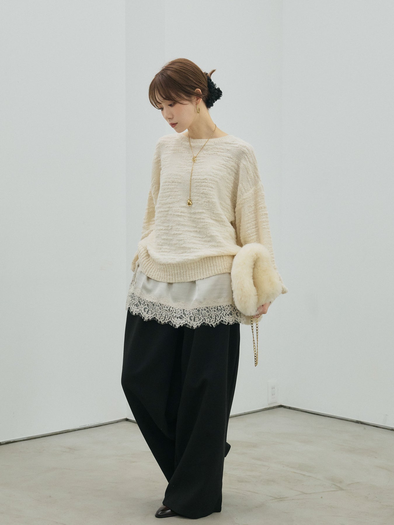 【Allure】[SET]バックリボンニュアンスブークレニットプルオーバー+ループデザインツイルワイドパンツ(2set)