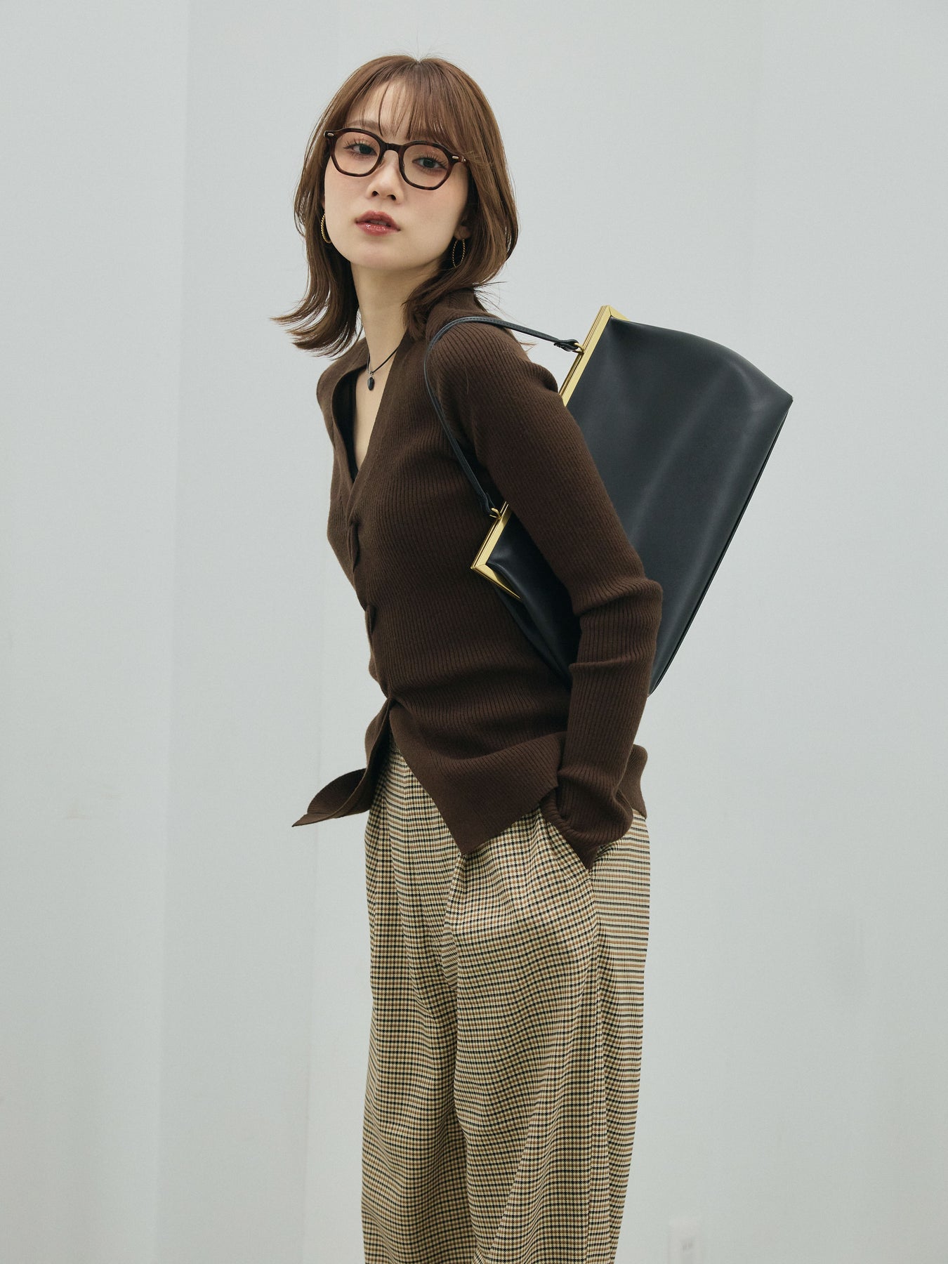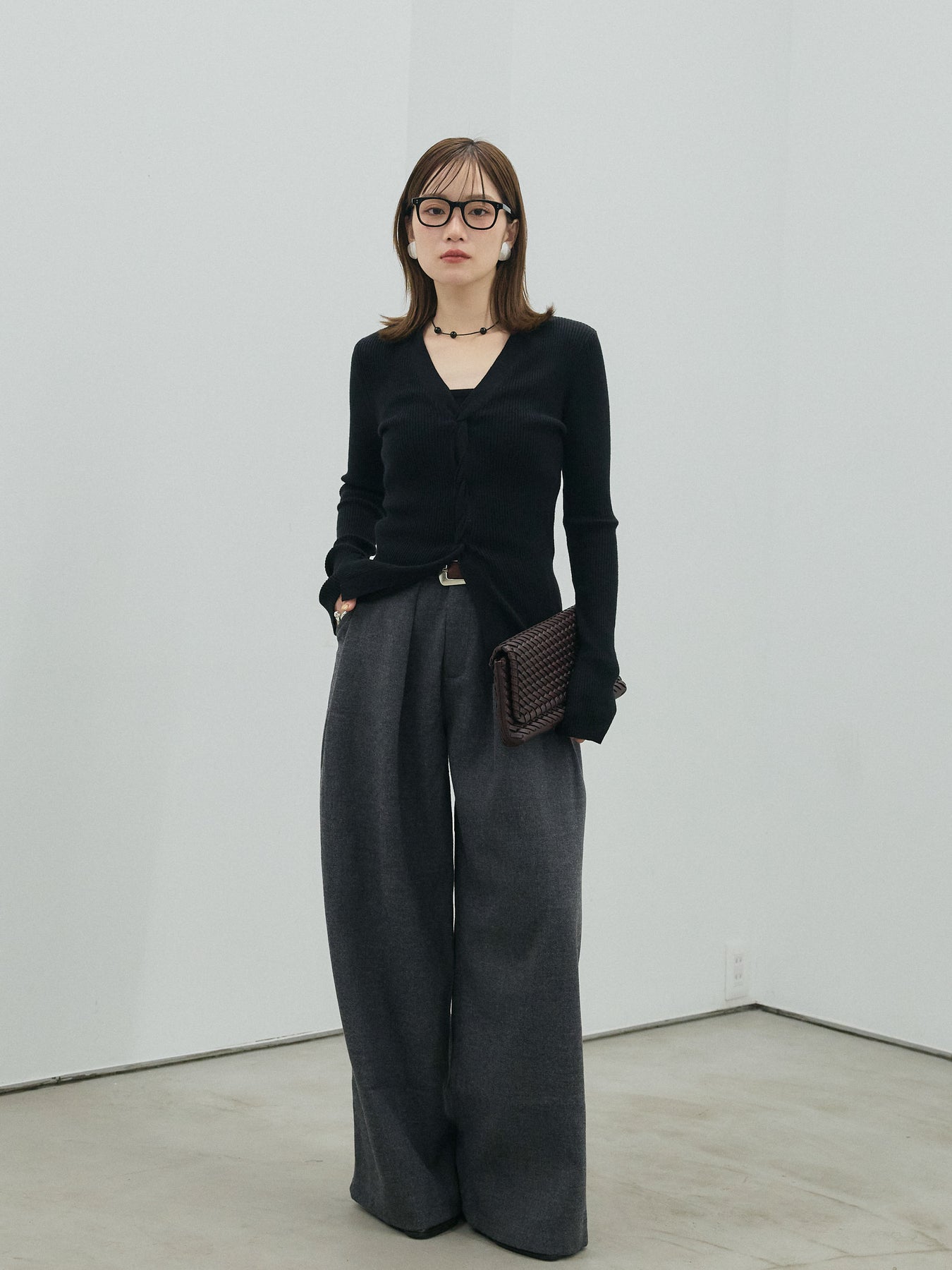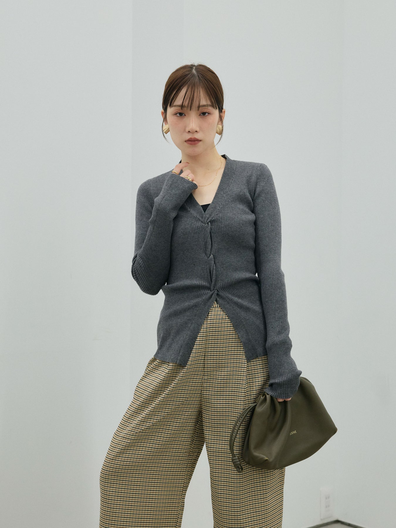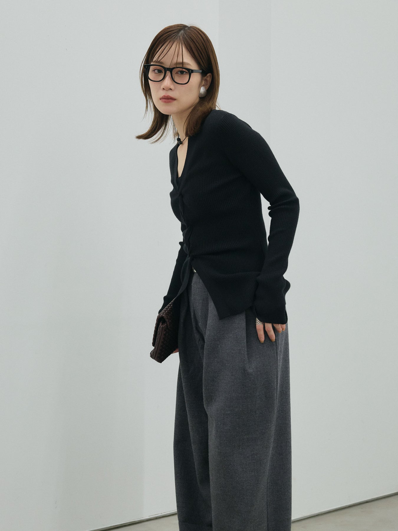 身体にフィットするリブ編みとフロントのツイストデザインが目を惹くニットトップス。デコルテを美しく見せる絶妙なカッティングと、立体感のあるフロントディテールが女性らしさを引き立てます。伸縮性のある素材で着心地も良く、ジャケットやカーディガンのインナーとしても映えるアイテム。ボトムスを選ばず、きれいめからカジュアルまで幅広く活躍します。
