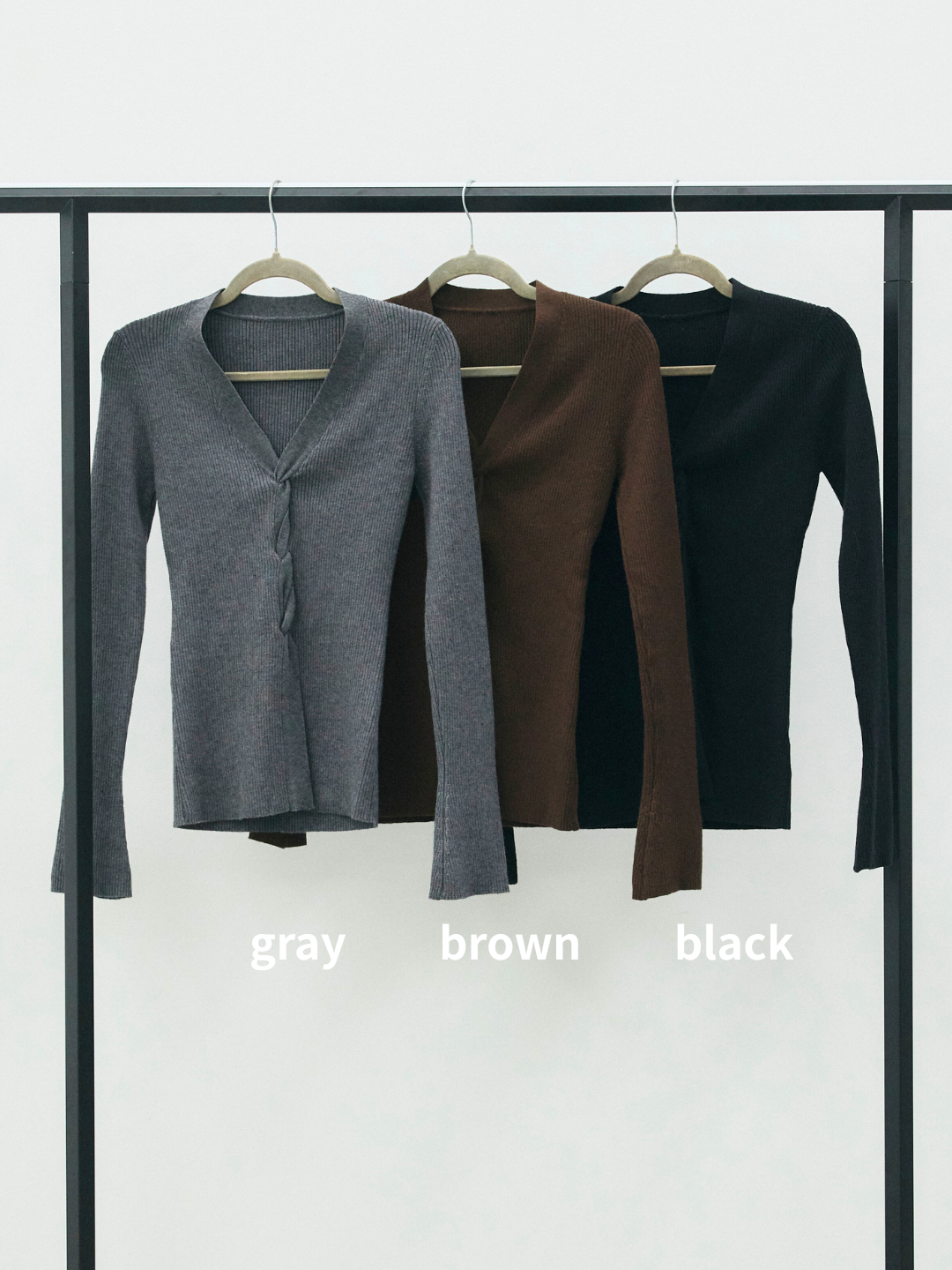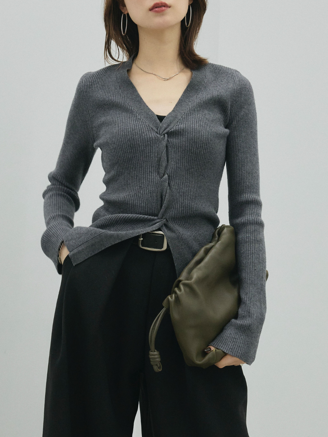 身体にフィットするリブ編みとフロントのツイストデザインが目を惹くニットトップス。デコルテを美しく見せる絶妙なカッティングと、立体感のあるフロントディテールが女性らしさを引き立てます。伸縮性のある素材で着心地も良く、ジャケットやカーディガンのインナーとしても映えるアイテム。ボトムスを選ばず、きれいめからカジュアルまで幅広く活躍します。