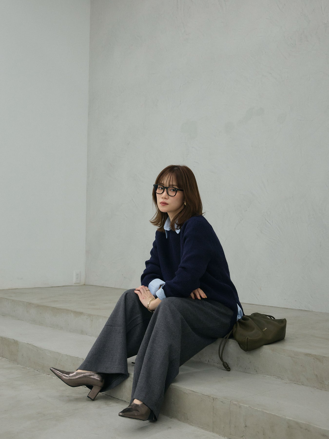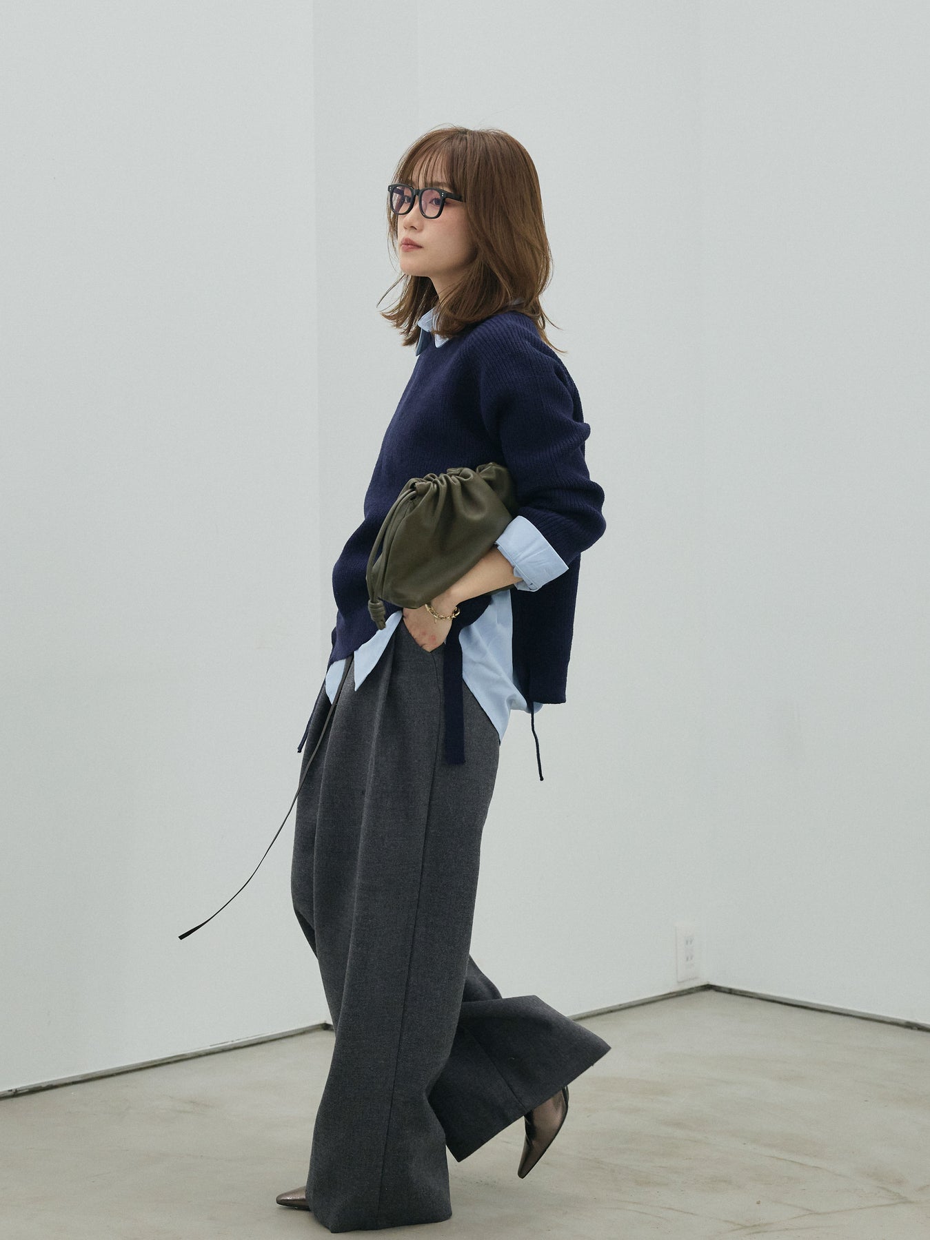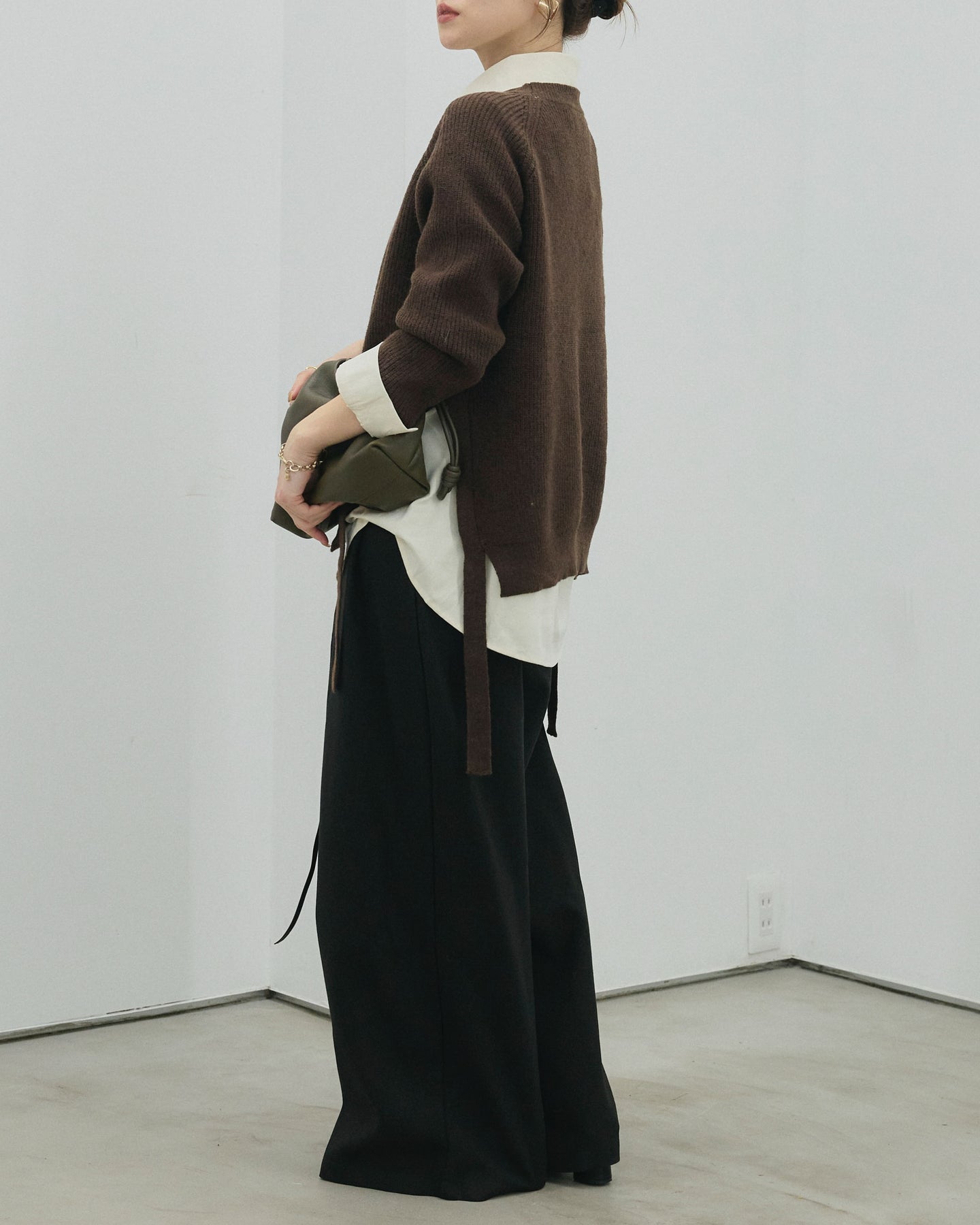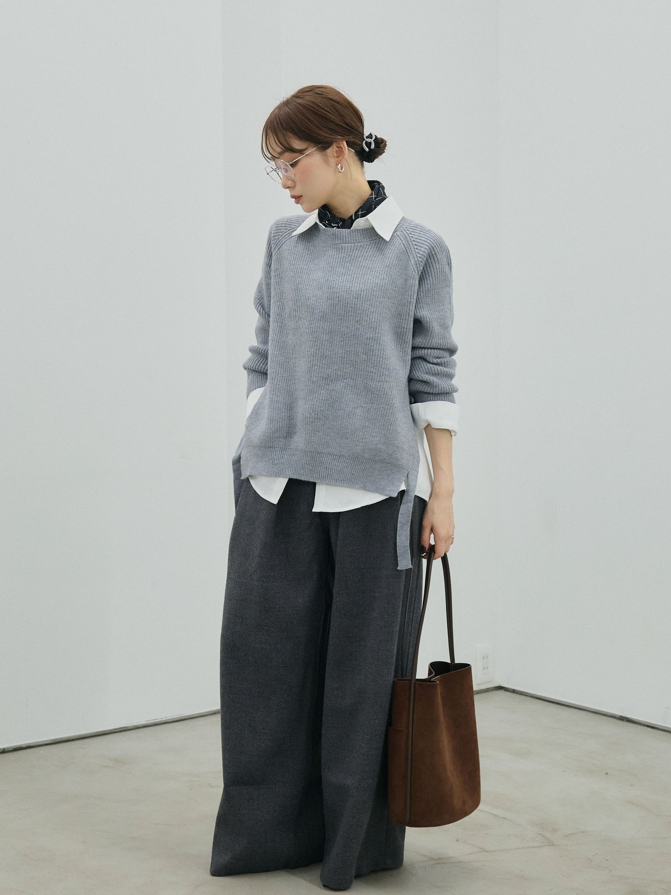 【Allure】[SET]サイドスリット畦編みニットプルオーバーシャツアンサンブル+ループデザインツイルワイドパンツ(2set)