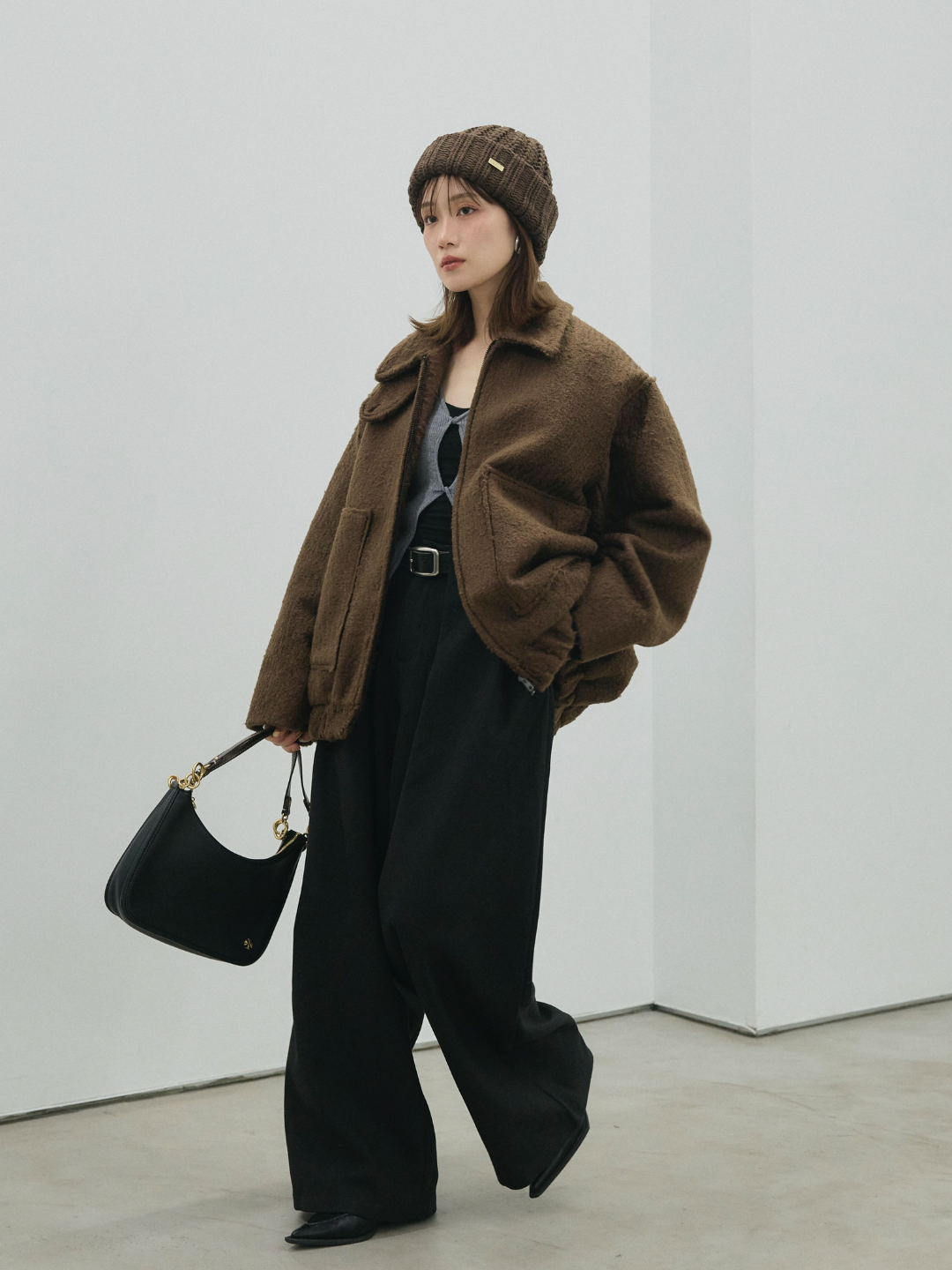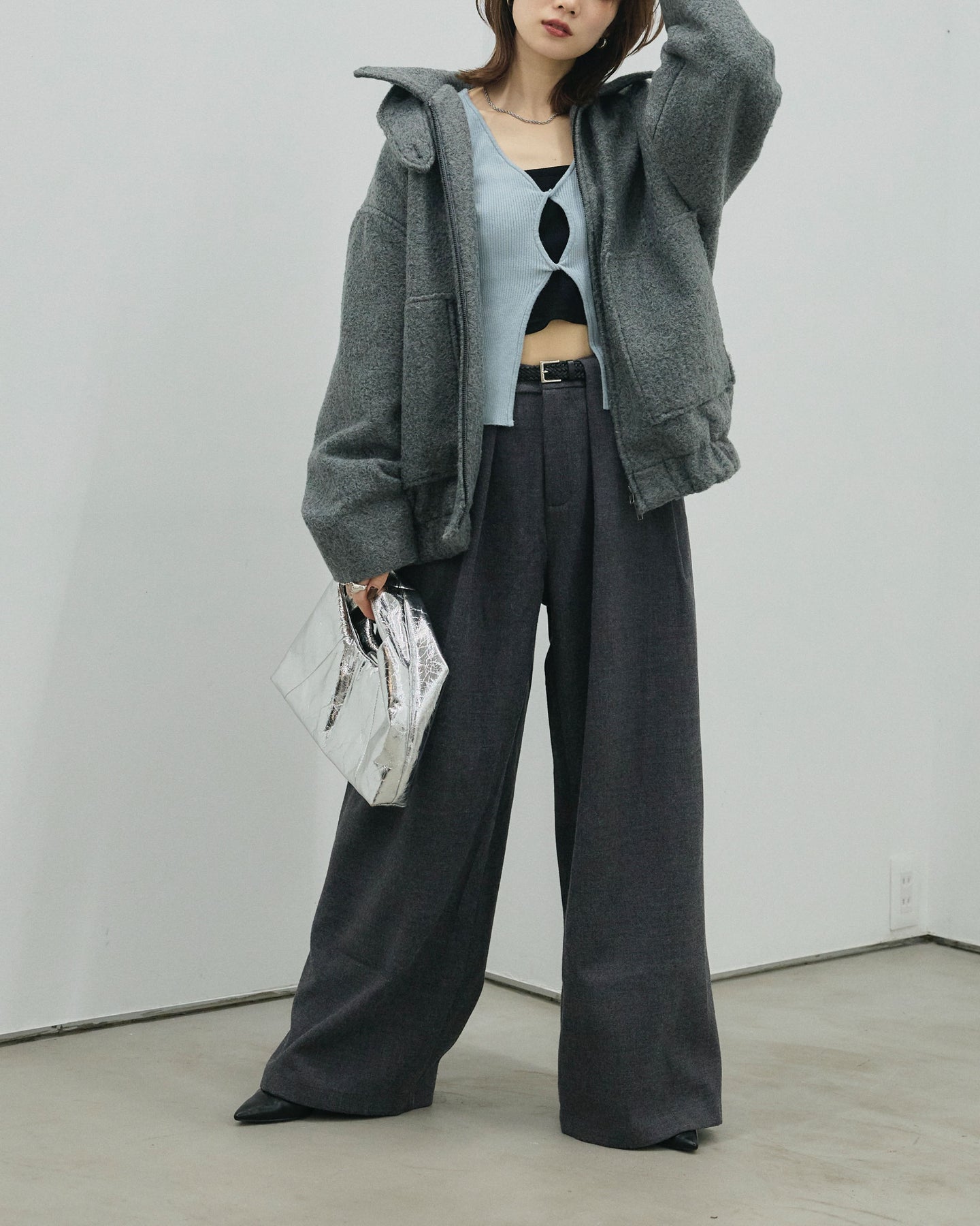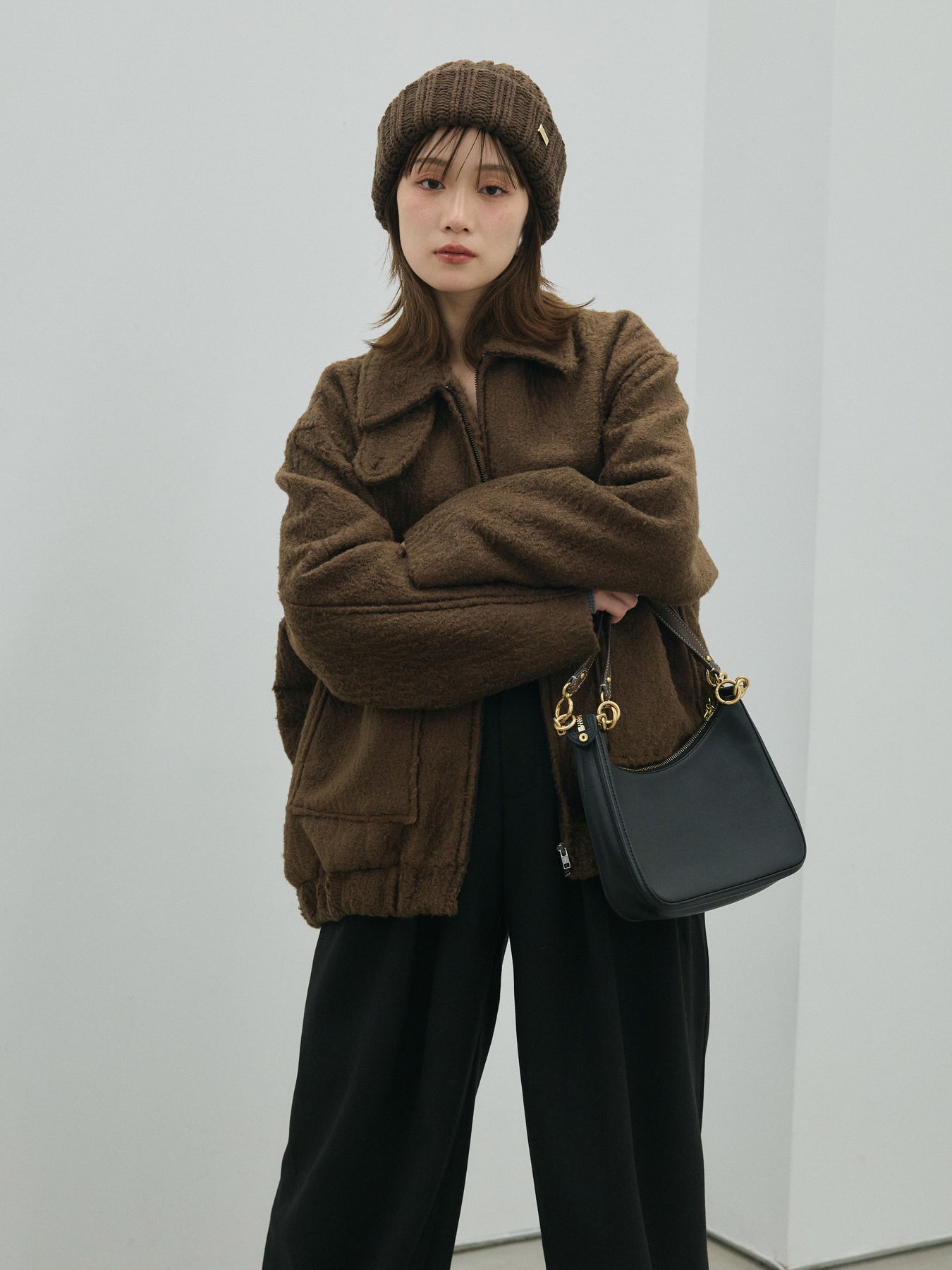 【Allure】[SET]スタンドカラーシャギーフライトジャケット+ループデザインツイルワイドパンツ(2set)