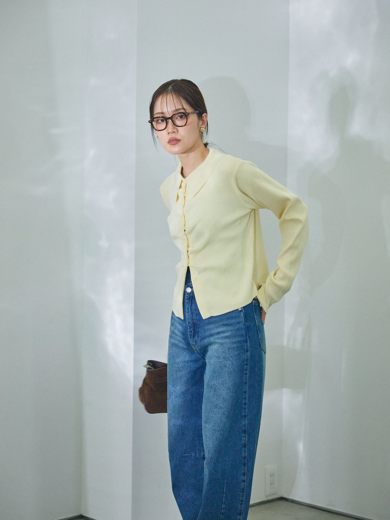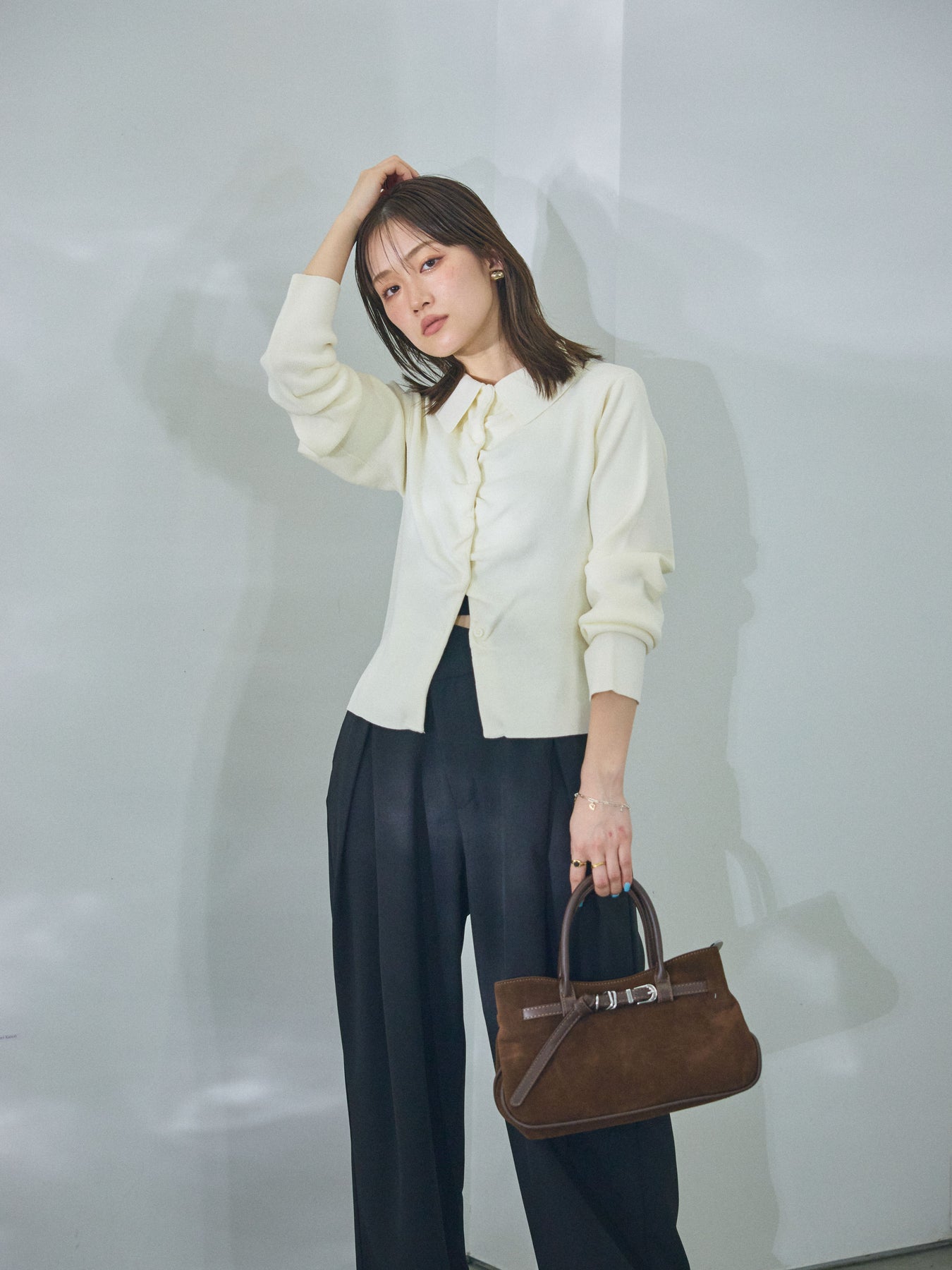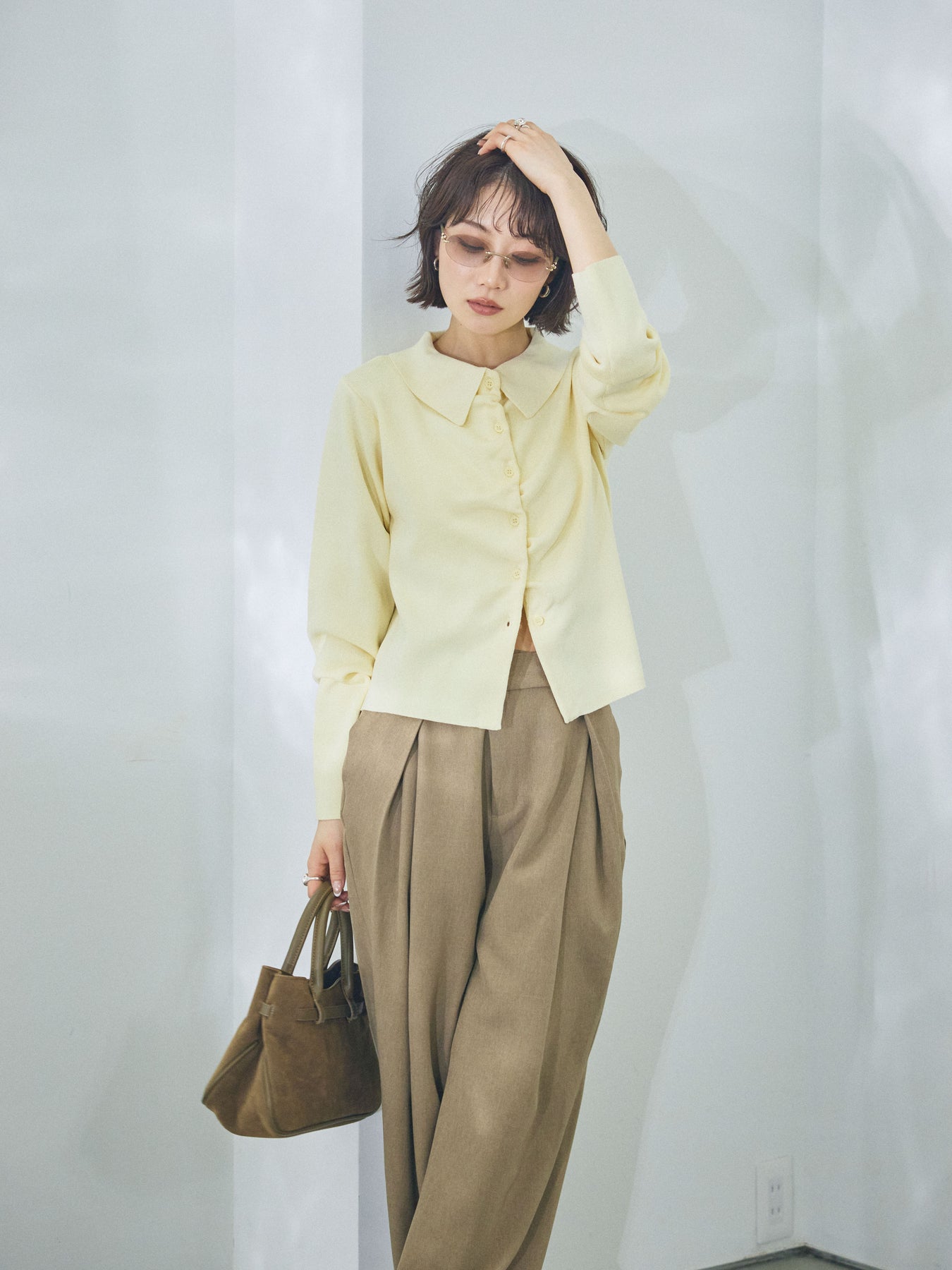 柔らかな表情を添える襟付きデザインが印象的な、ギャザーニットカーディガン。 首元に程よい存在感をもたせる襟と、フロントに施したギャザーが、シンプルな中に奥行きを生み出します。 身体のラインに寄り添いすぎないシルエットで、前を閉じてトップスのように着用しても、羽織として取り入れてもバランスよくまとまる一枚。ニットならではのやわらかな風合いが、コーディネート全体に自然な抜け感をプラスします。 デニムやスカートなど幅広いボトムスと相性が良く、日常使いからきれいめなスタイリングまで幅広く活躍するアイテムです。 ※ボトムス、キャミソール(インナー)以外の商品は一律でインナーは付属していません。