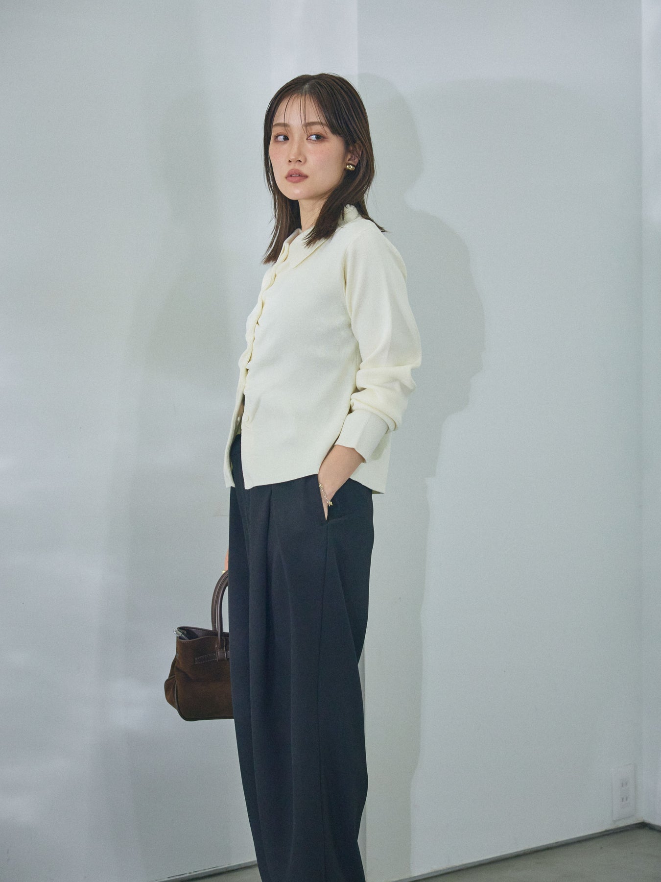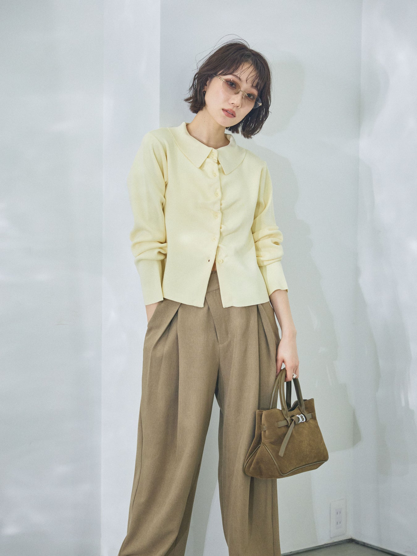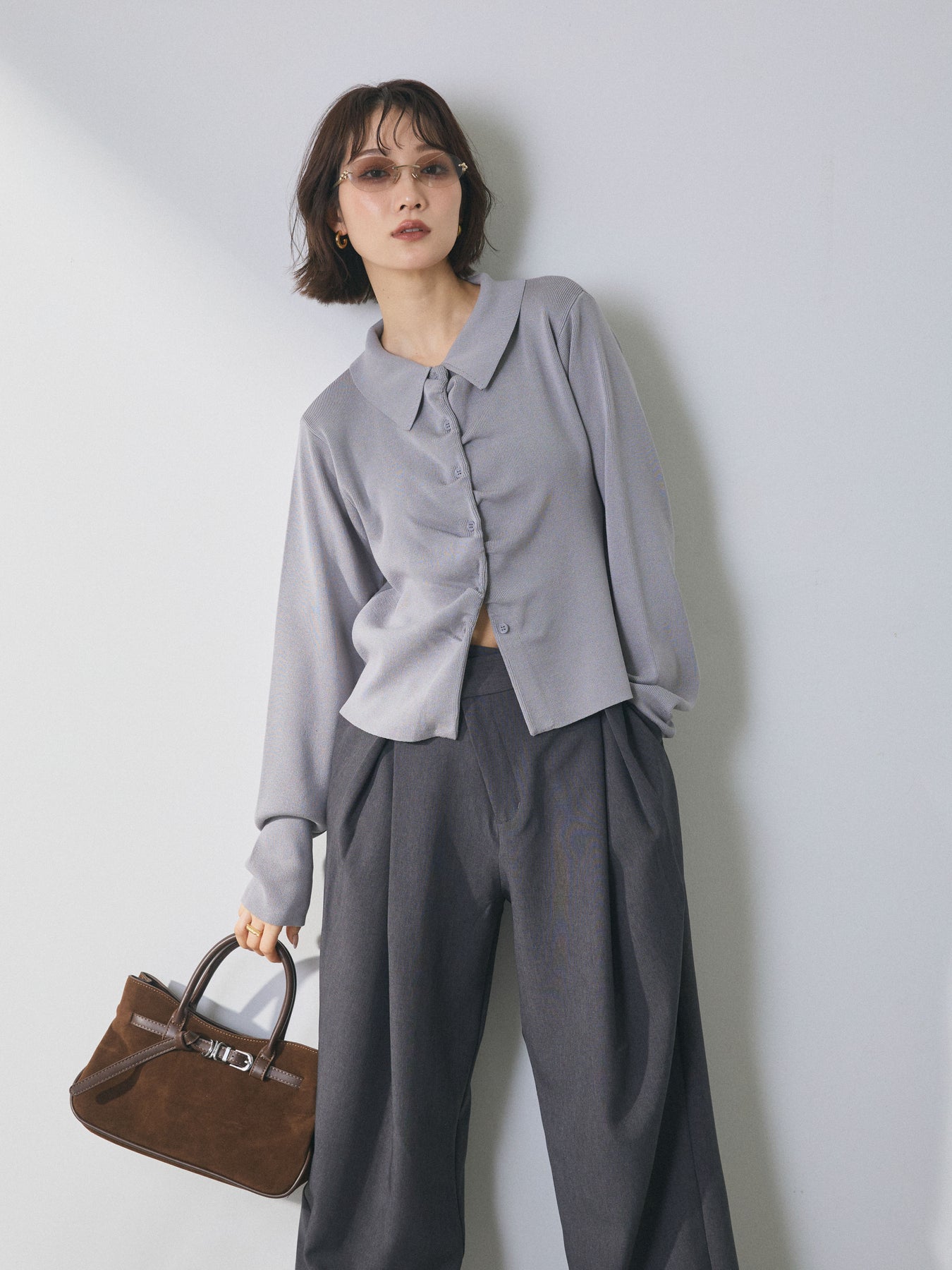 【Allure】[SET]襟付きギャザーニットカーディガン+アシンメトリーウエストタックパンツ(2set)