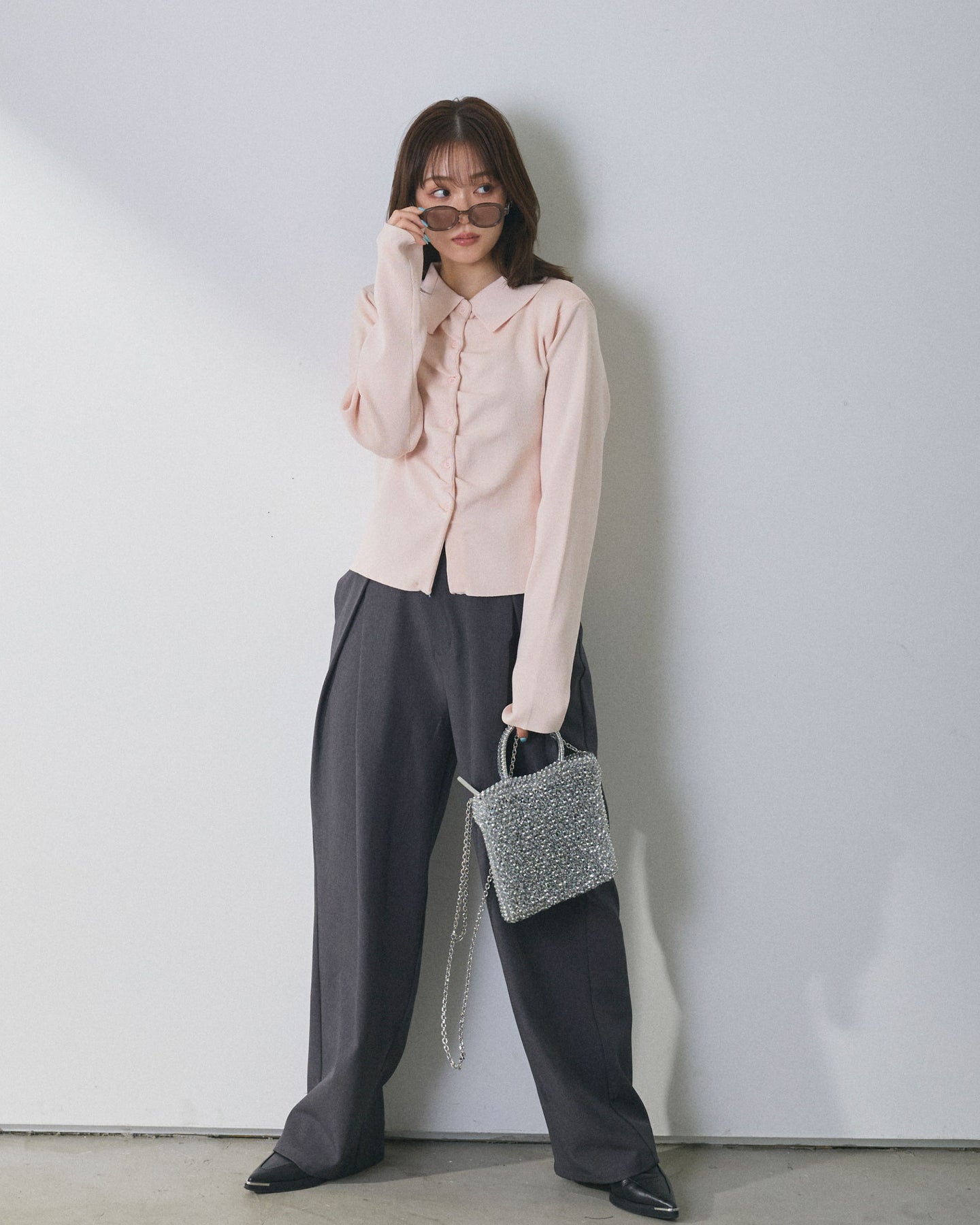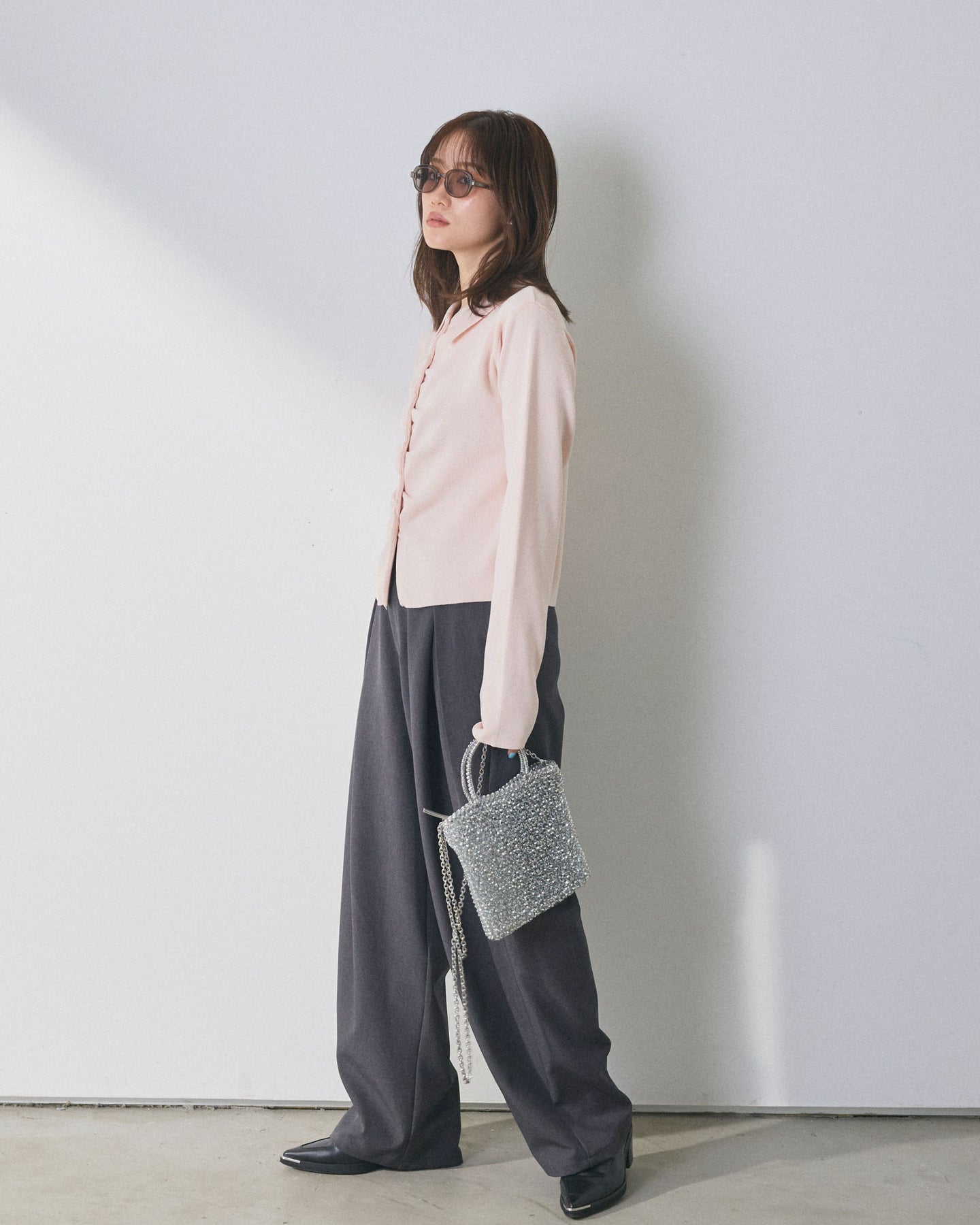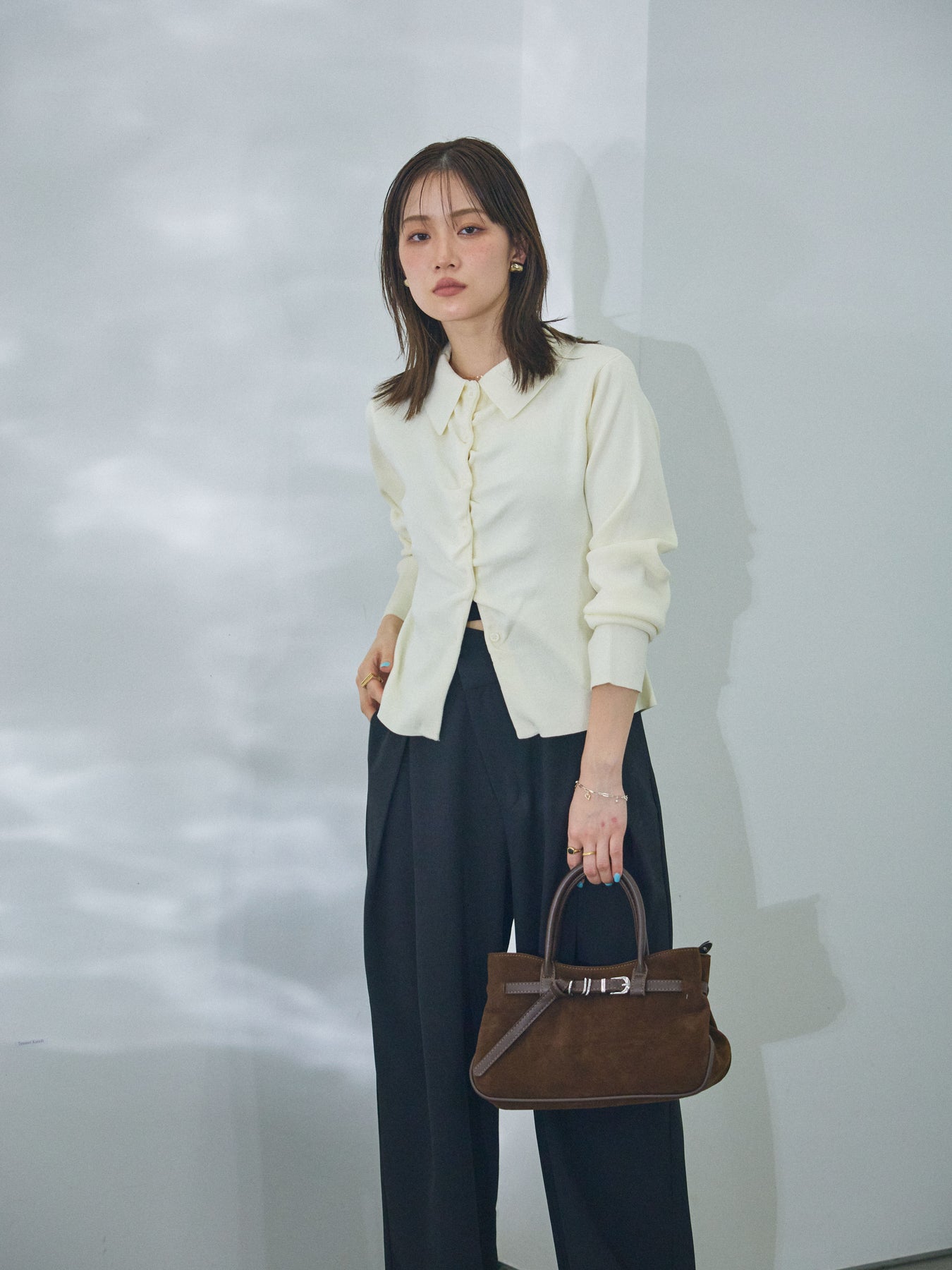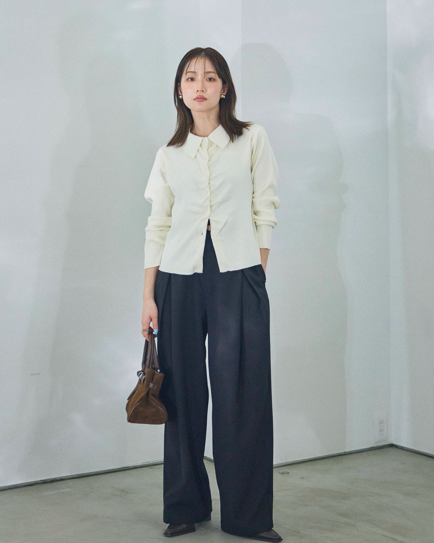 【Allure】[SET]襟付きギャザーニットカーディガン+アシンメトリーウエストタックパンツ(2set)
