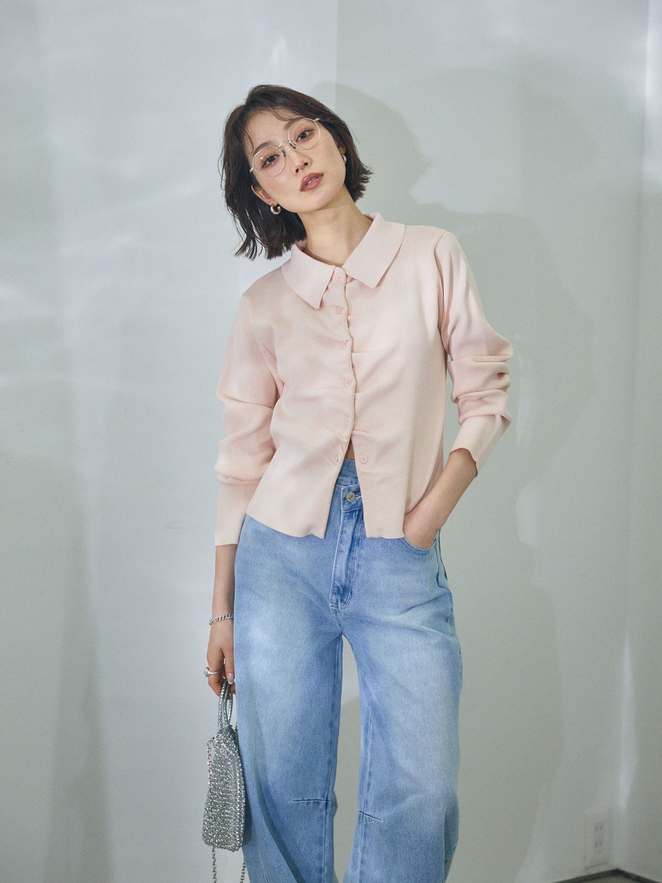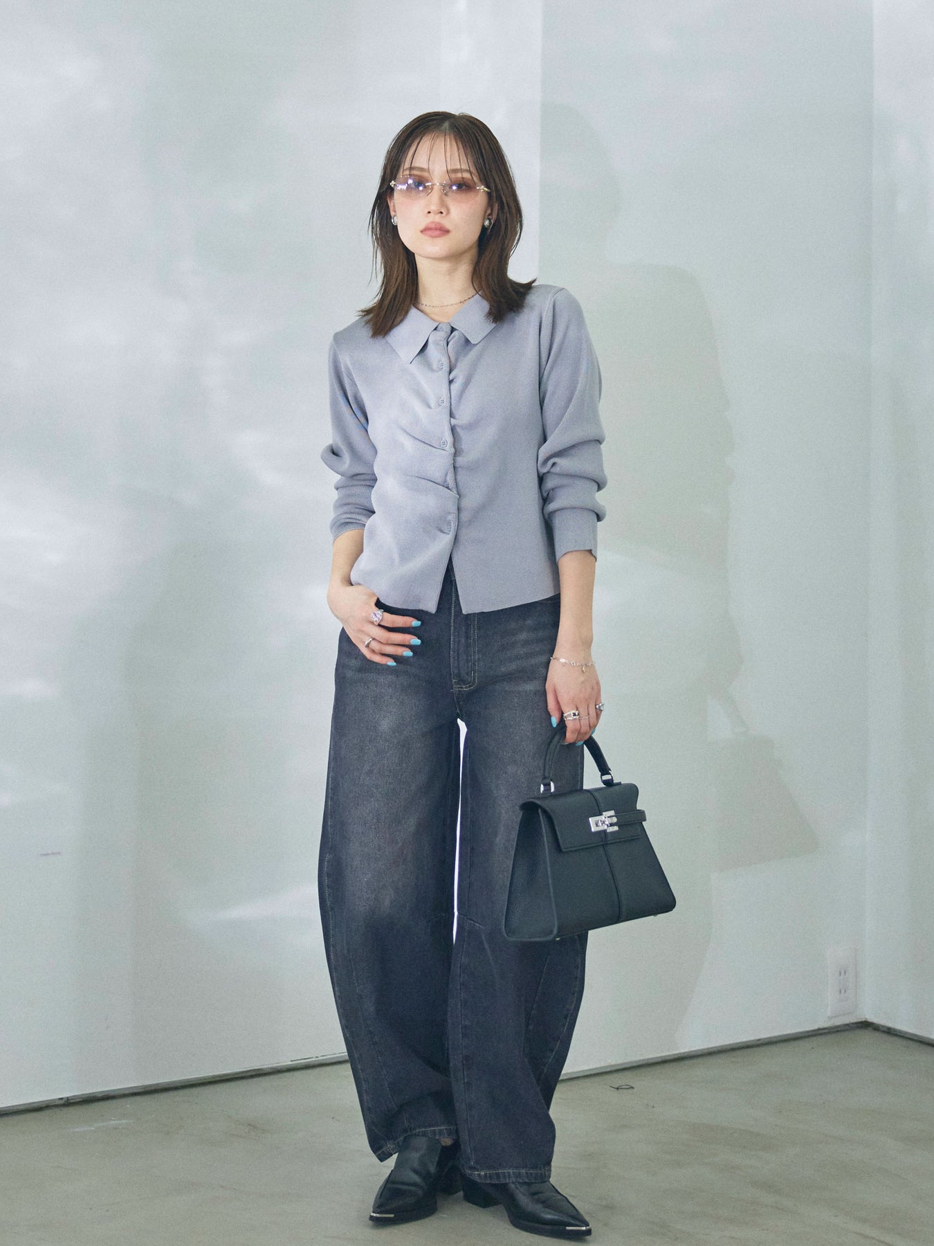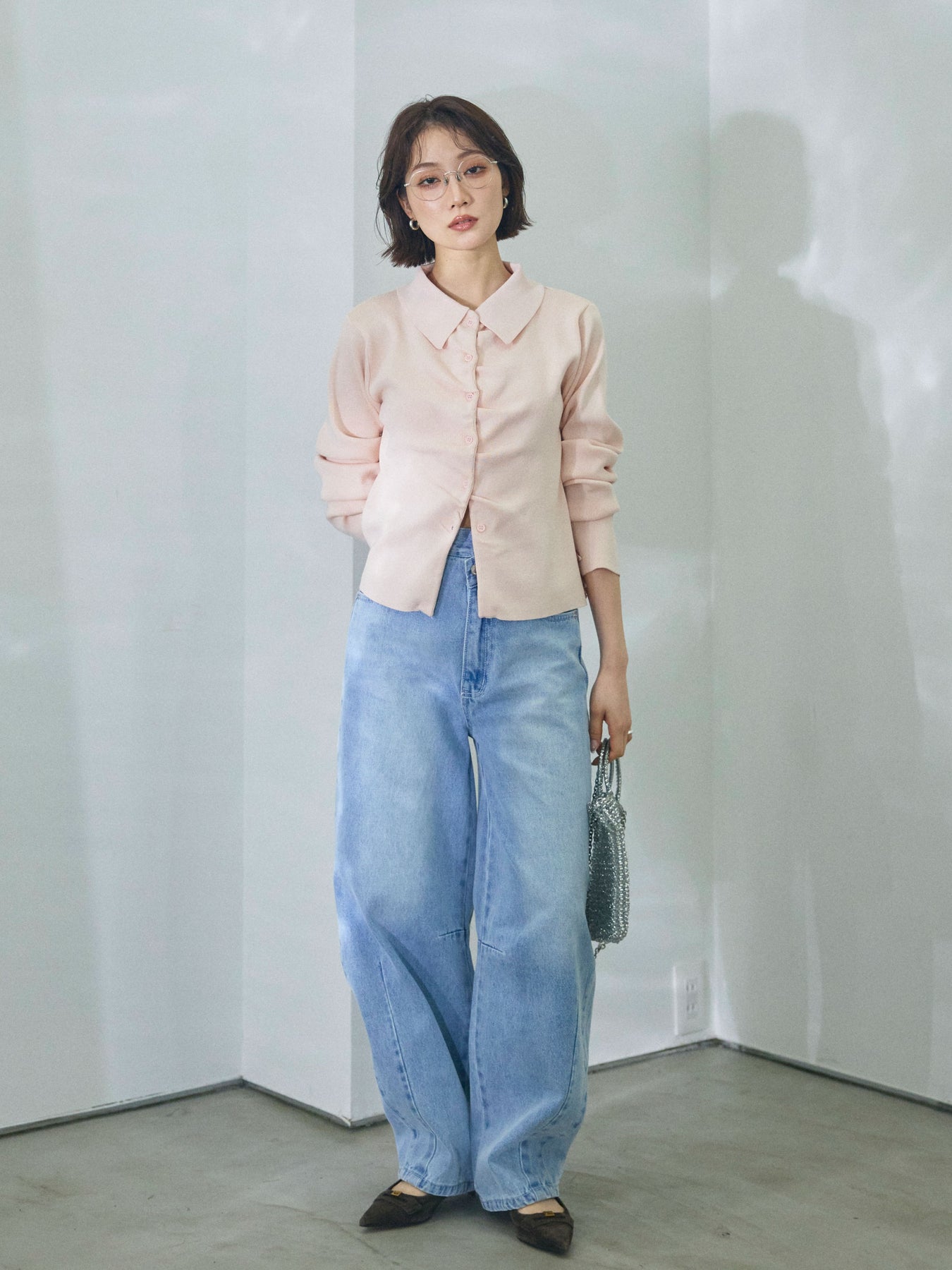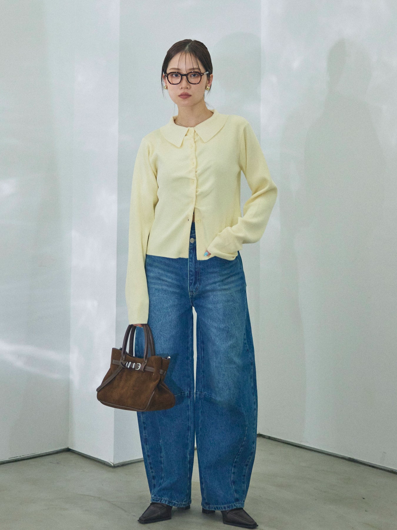 【Allure】[SET]襟付きギャザーニットカーディガン+アシメカーブデニムパンツ(2set)