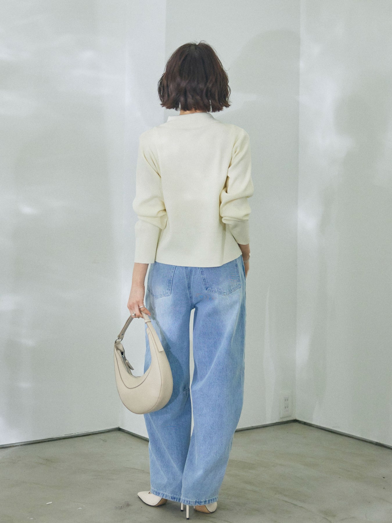 立体的なカーブラインが目を引く、アシメデザインのデニムパンツ。 ウエストまわりにさりげなく変化をつけたアシンメトリー仕様が、ベーシックなデニムに新鮮な表情を加えます。 腰から裾にかけて描く緩やかなカーブシルエットが、程よいボリューム感を持たせつつ、全体のバランスをすっきりと見せてくれる一本。シンプルなトップスと合わせるだけでもスタイリングに奥行きが生まれ、デイリーコーデを自然にアップデートしてくれます。 トップスをインしてウエストデザインを引き立てたり、ゆったりとしたニットやシャツと合わせてラフに着こなすのもおすすめ。幅広いテイストに取り入れやすく、長く活躍するデニムパンツです。 ※ボトムス、キャミソール(インナー)以外の商品は一律でインナーは付属していません。