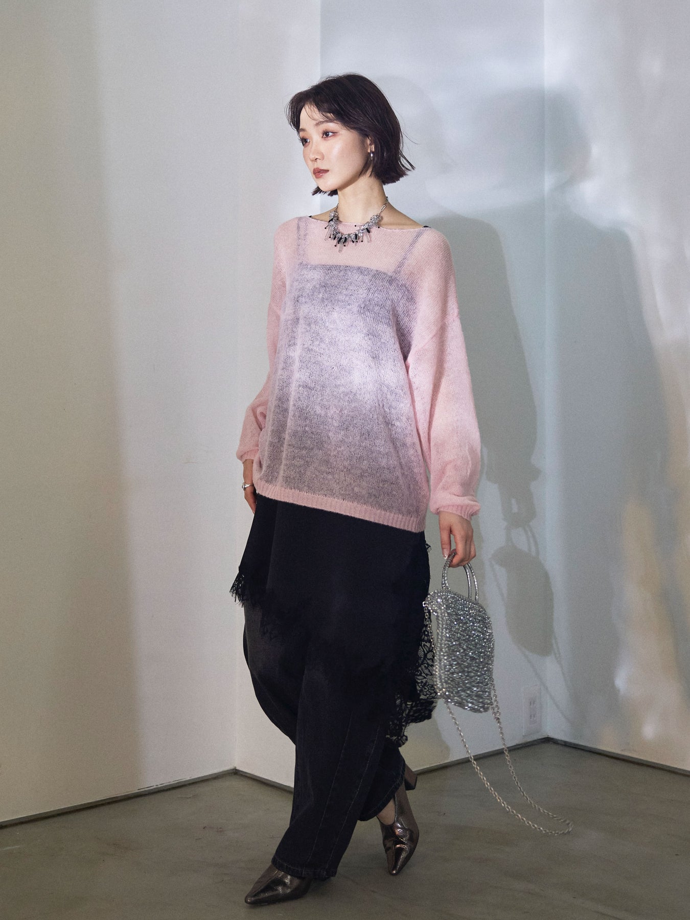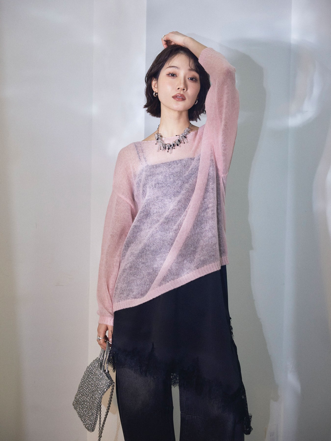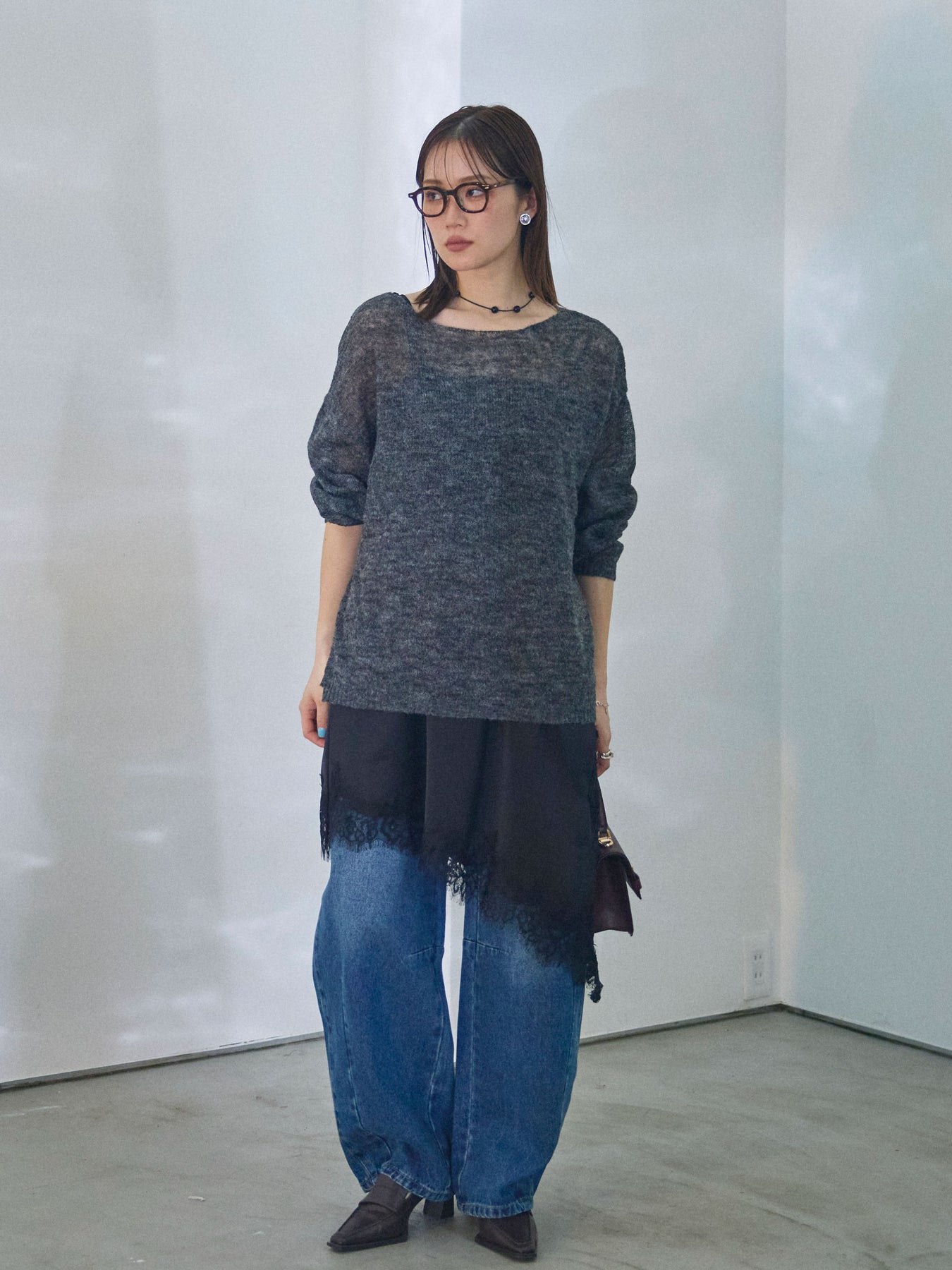 【Allure】[SET]モヘアタッチ透かし編みボートネックニットプルオーバー+アシメカーブデニムパンツ(2set)