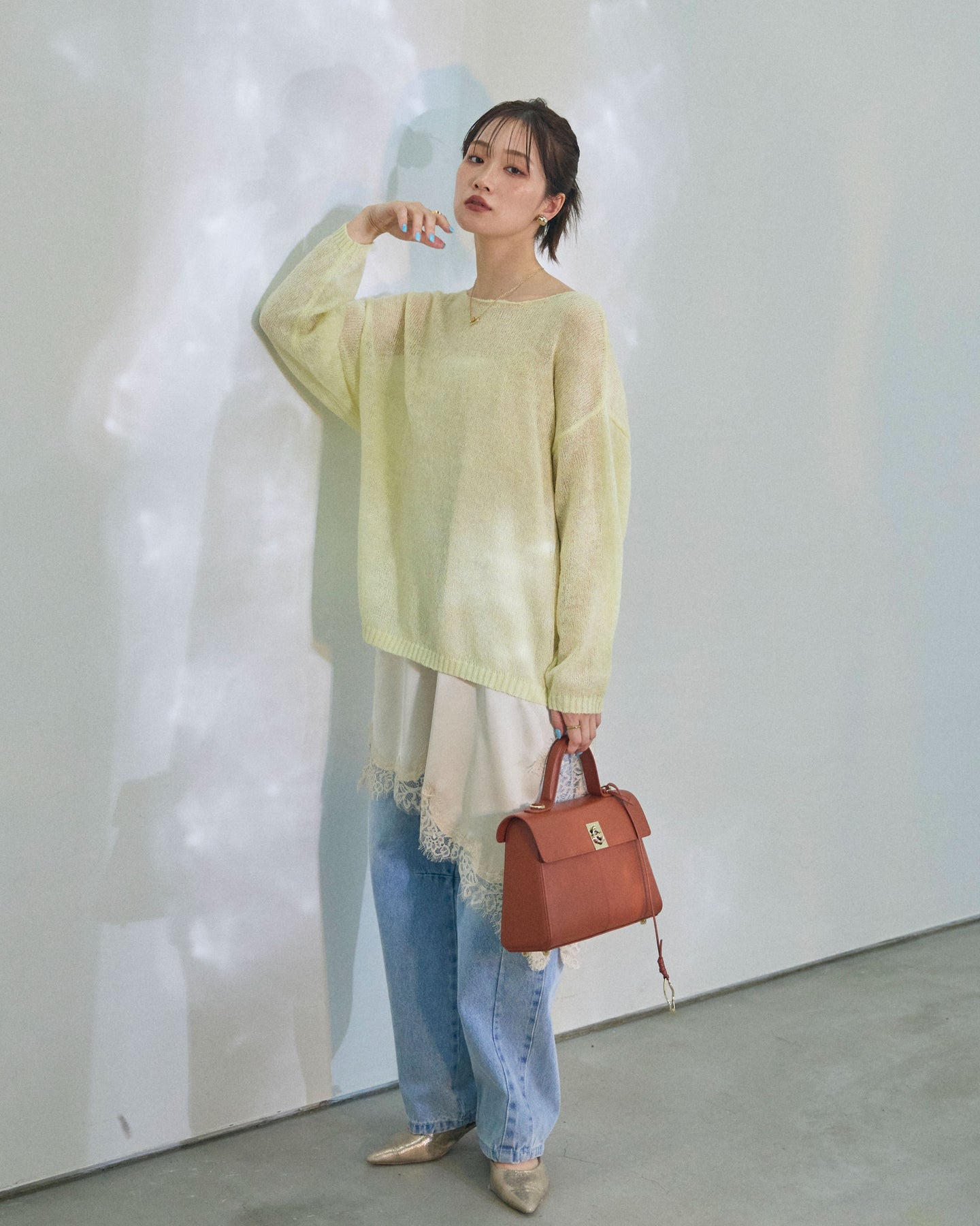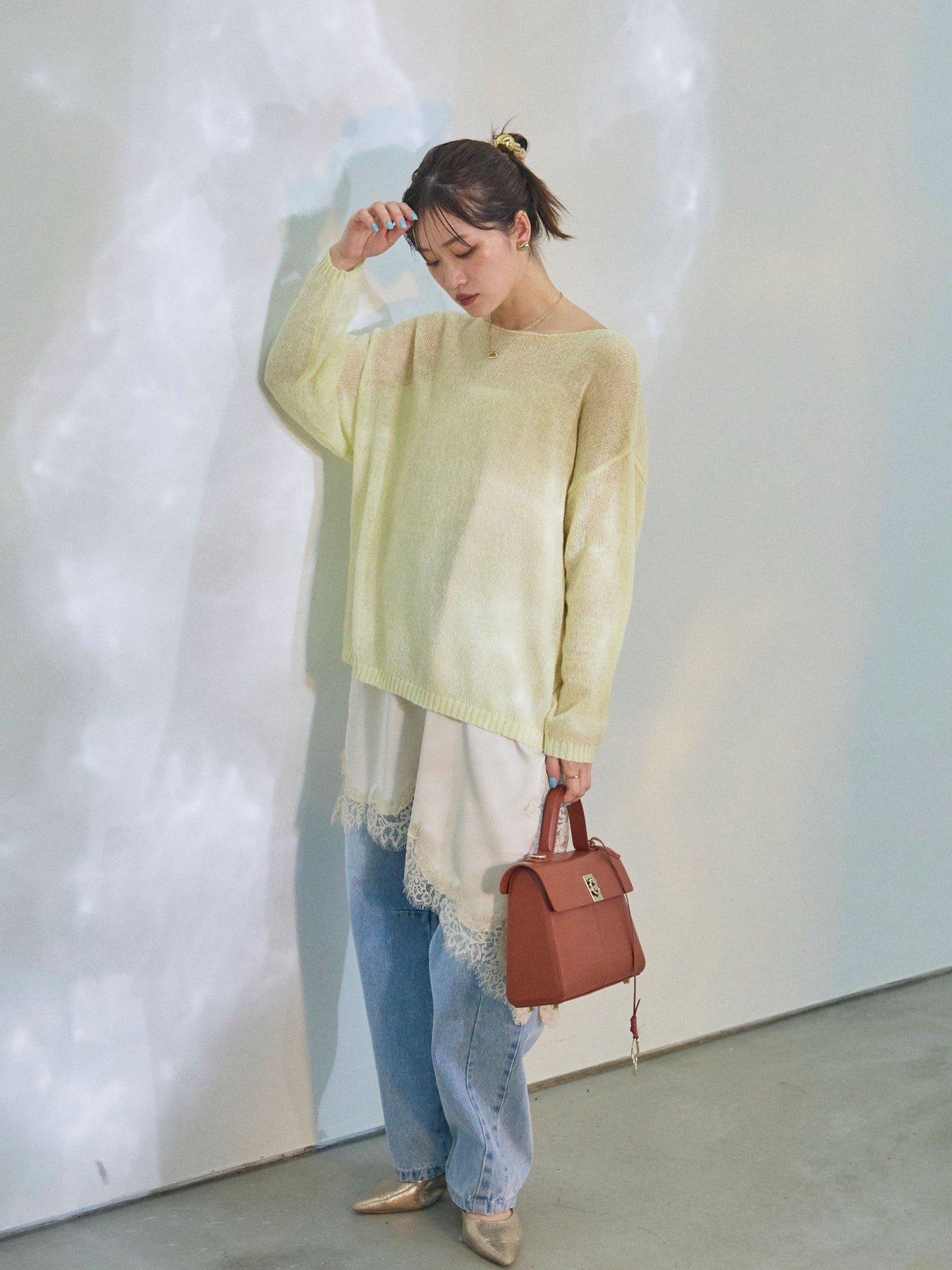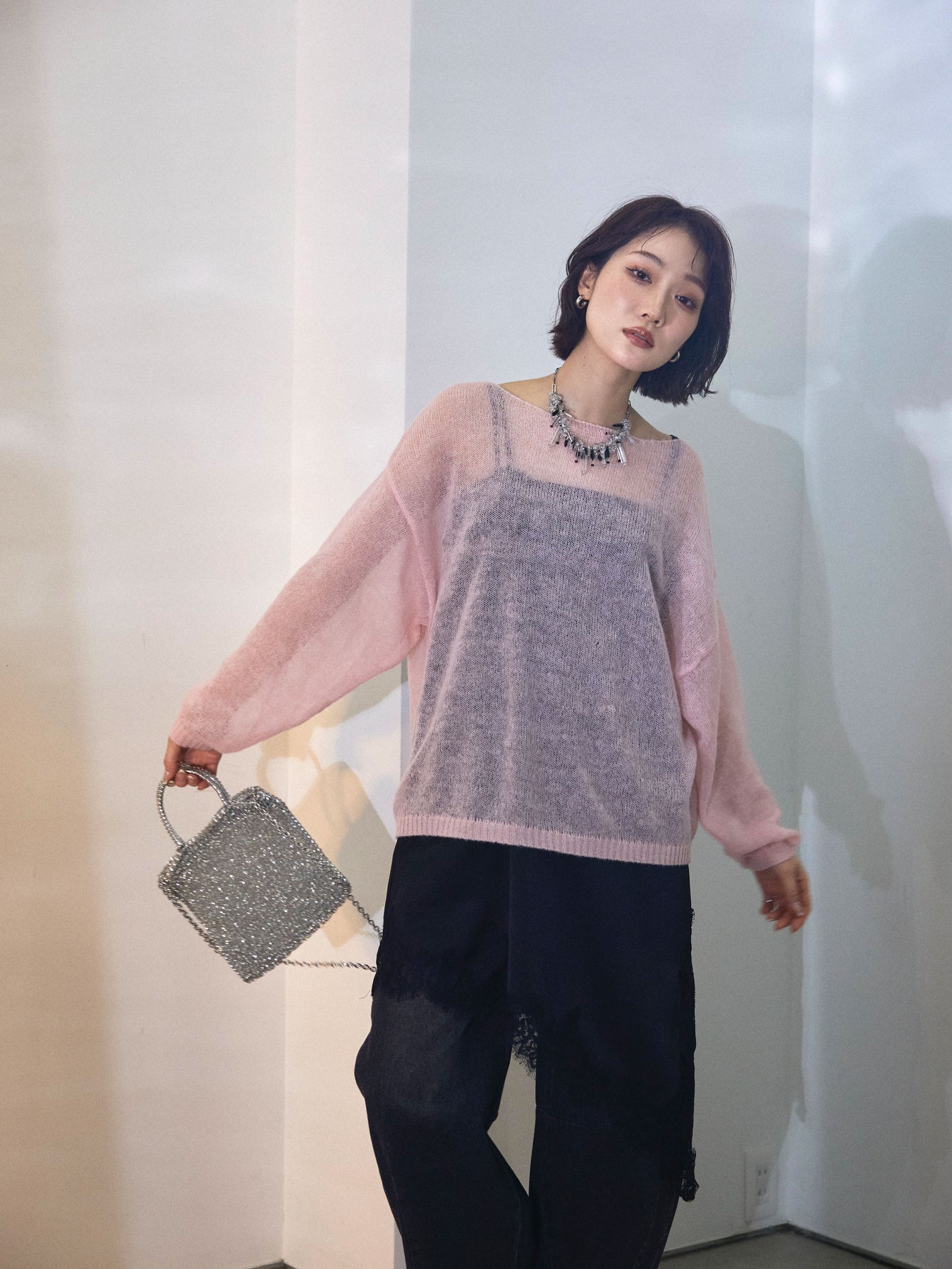【Allure】[SET]モヘアタッチ透かし編みボートネックニットプルオーバー+アシメカーブデニムパンツ(2set)