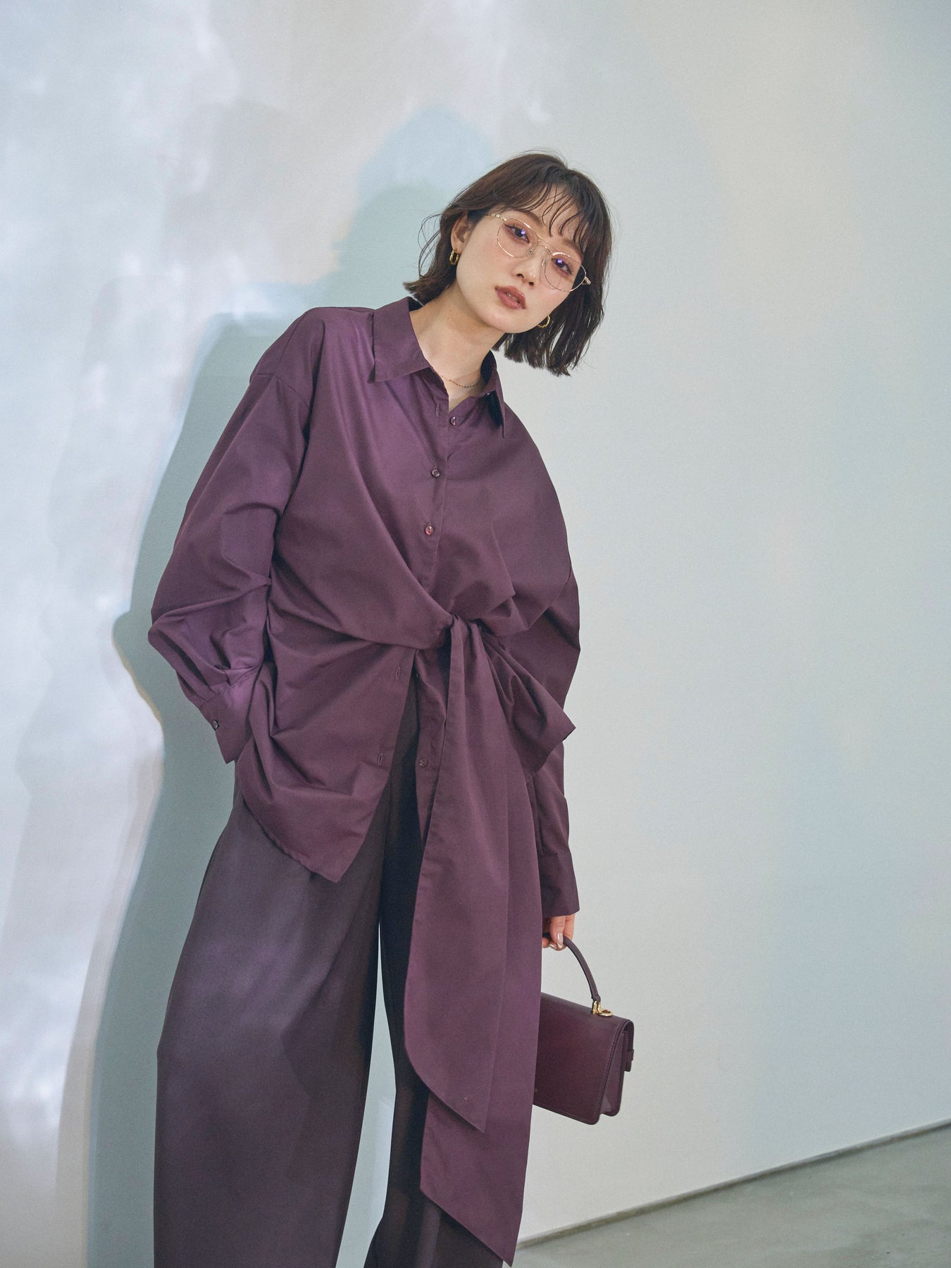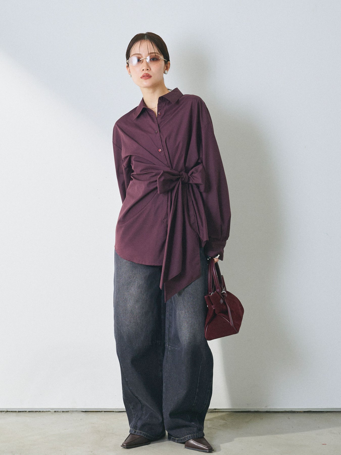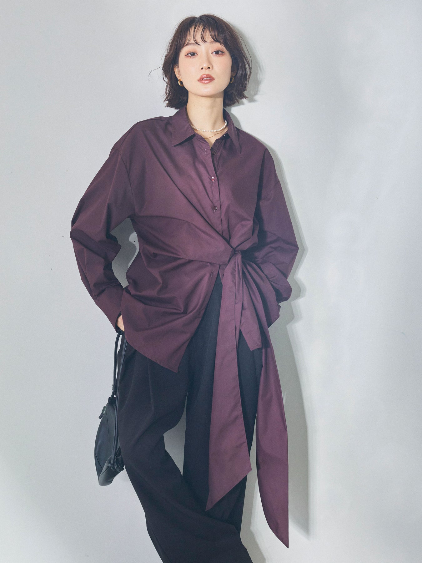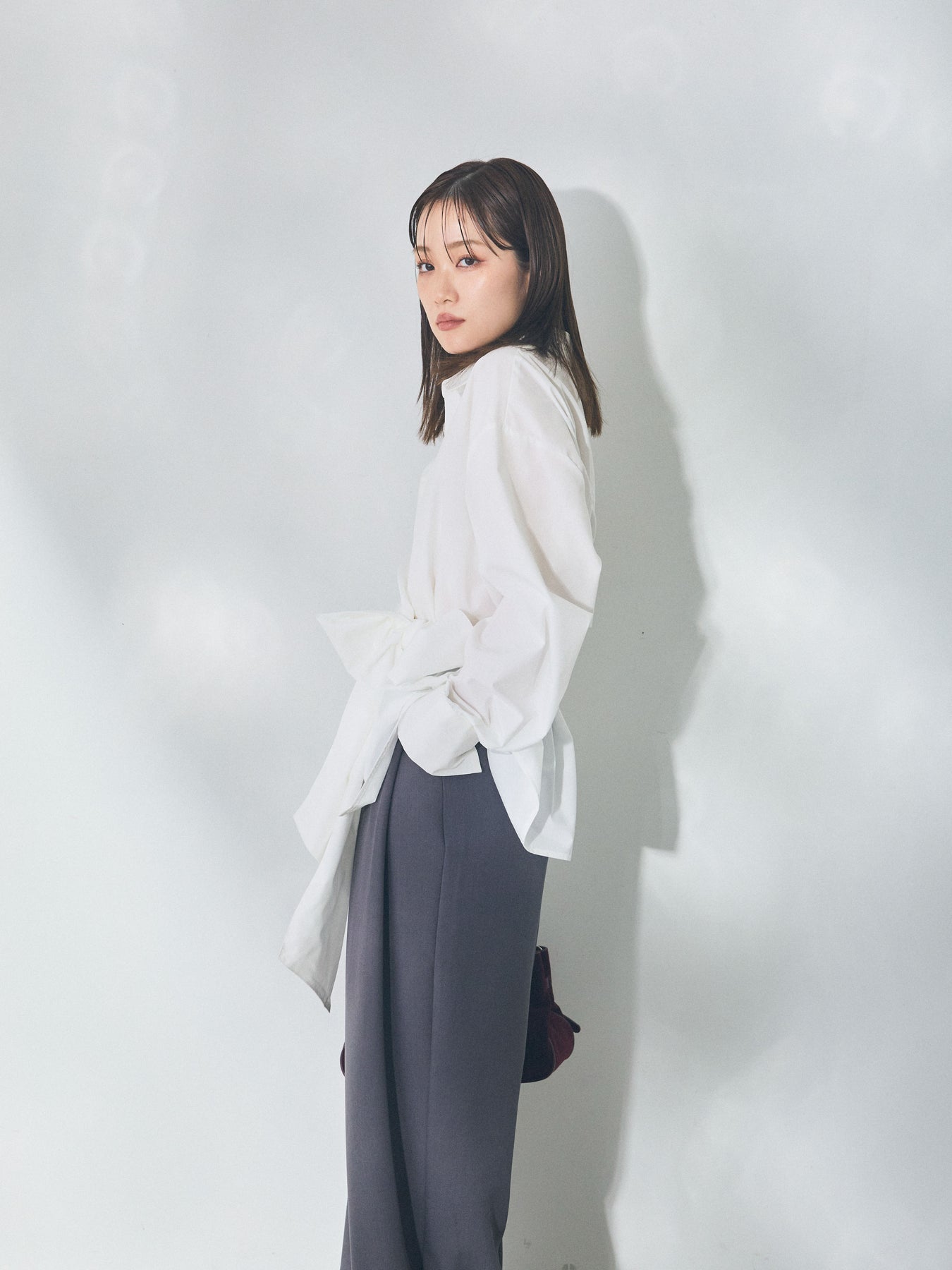 ウエストにあしらったアシンメトリーリボンが、着こなしに自然な動きを添えるデザインシャツ。 シンプルなシャツベースに、ひとひねり効かせたディテールを加えることで、スタイリングに程よい奥行きを生み出します。 フロントの重なりとリボン使いが立体感をつくり、ボトムスにインせずともバランスよくまとまるのがポイント。パンツ合わせではすっきりとした印象に、スカートと合わせれば柔らかなニュアンスも楽しめます。 一枚で存在感がありながら、着回しやすさも兼ね備えたアイテム。ベーシックなシャツに変化を加えたい方におすすめです。 ※ボトムス、キャミソール(インナー)以外の商品は一律でインナーは付属していません。