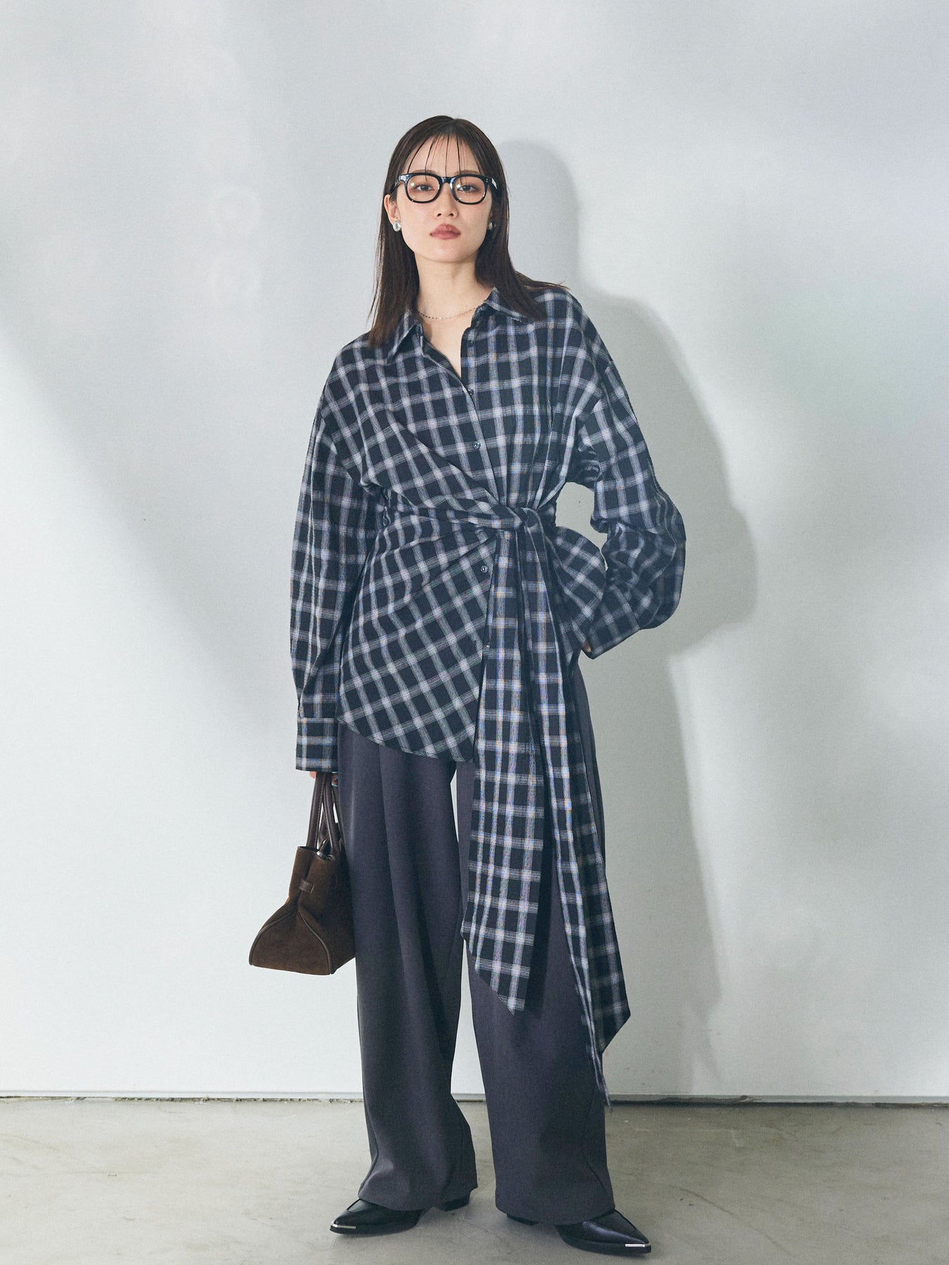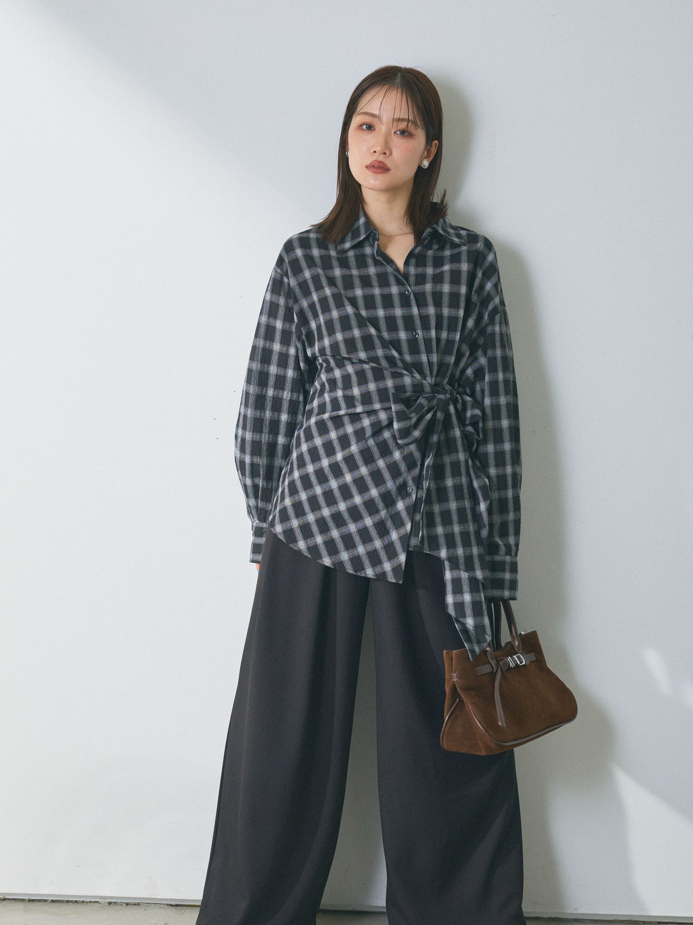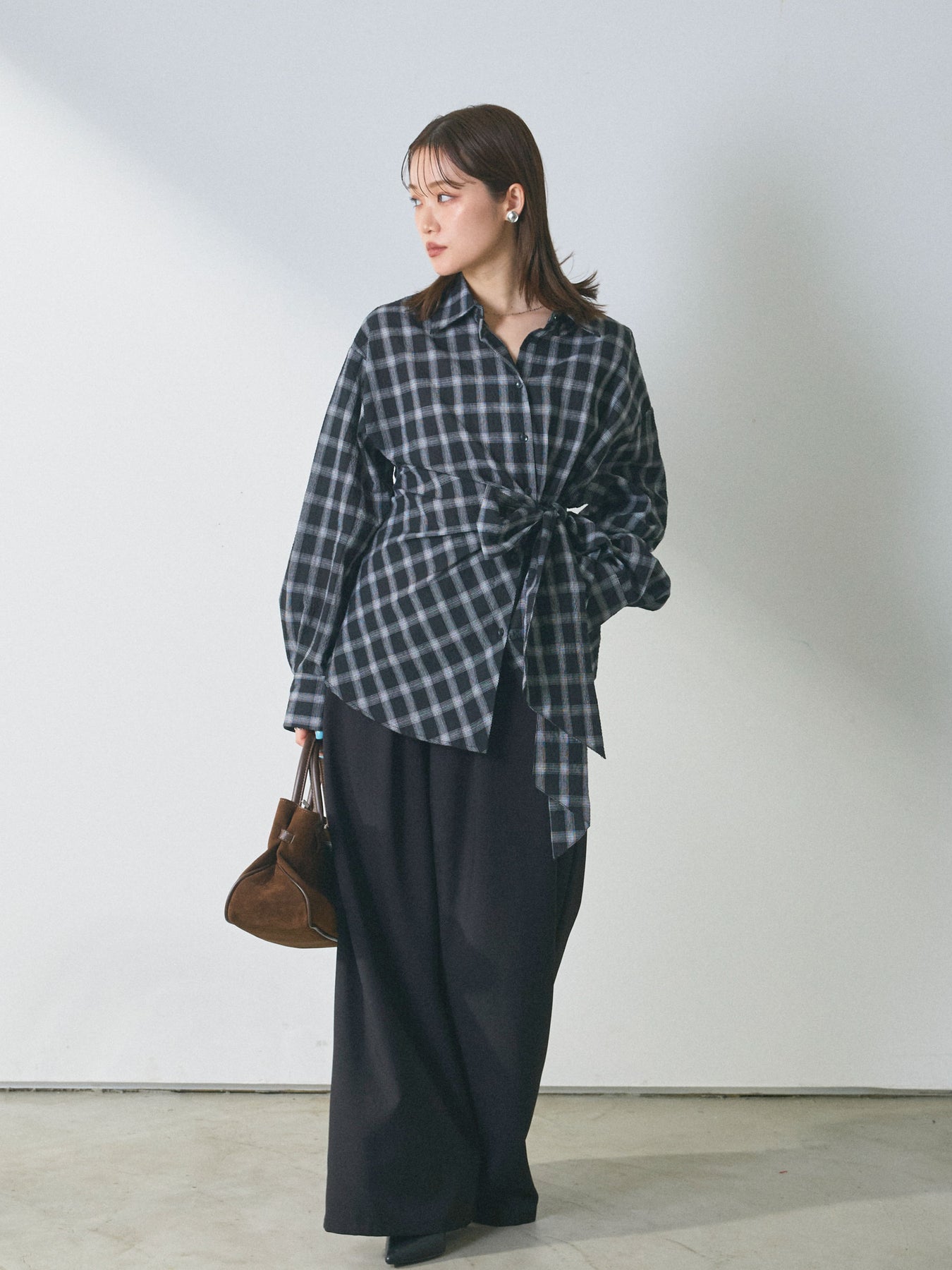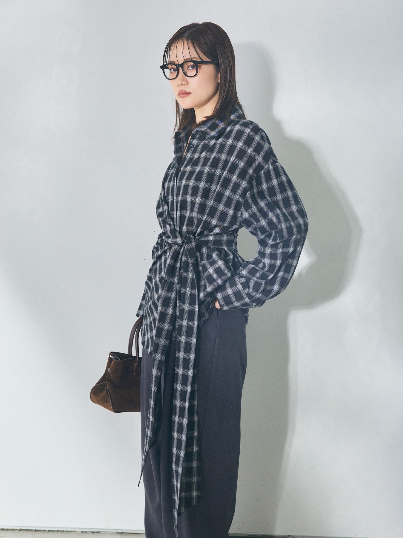 ウエストにあしらったアシンメトリーリボンが、着こなしに自然な動きを添えるデザインシャツ。 シンプルなシャツベースに、ひとひねり効かせたディテールを加えることで、スタイリングに程よい奥行きを生み出します。 フロントの重なりとリボン使いが立体感をつくり、ボトムスにインせずともバランスよくまとまるのがポイント。パンツ合わせではすっきりとした印象に、スカートと合わせれば柔らかなニュアンスも楽しめます。 一枚で存在感がありながら、着回しやすさも兼ね備えたアイテム。ベーシックなシャツに変化を加えたい方におすすめです。 ※ボトムス、キャミソール(インナー)以外の商品は一律でインナーは付属していません。
