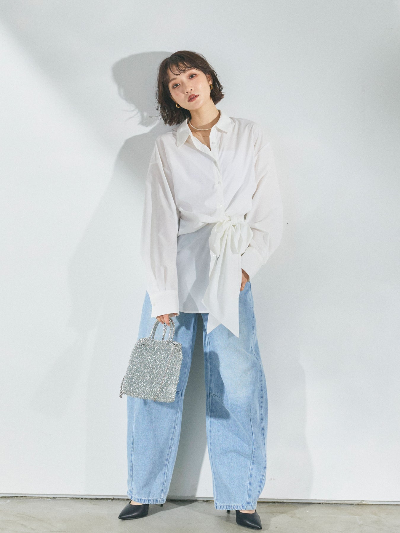 【Allure】[SET]ウエストアシメリボンシャツ+アシメカーブデニムパンツ(2set)