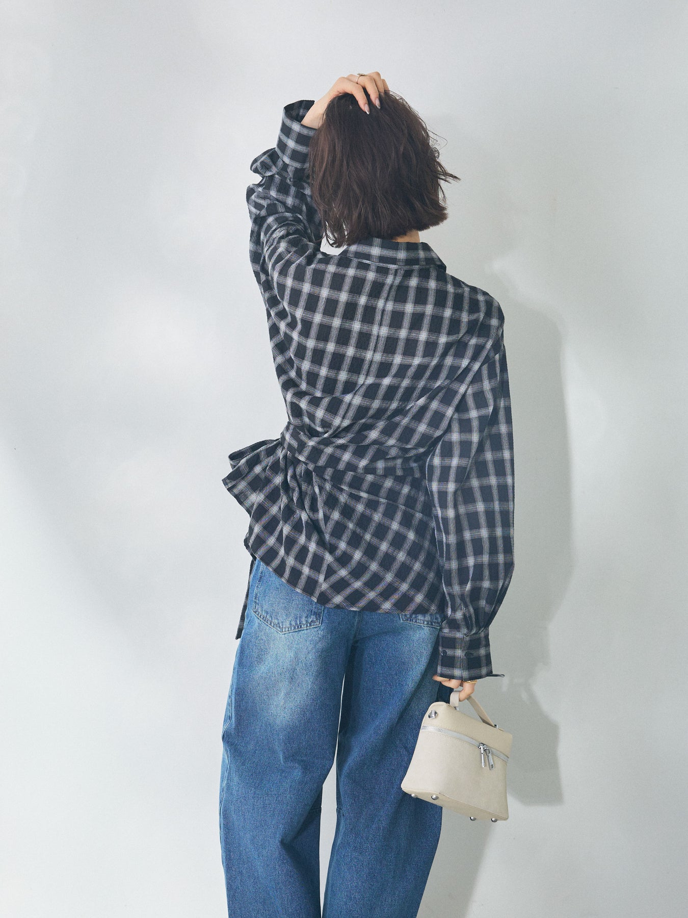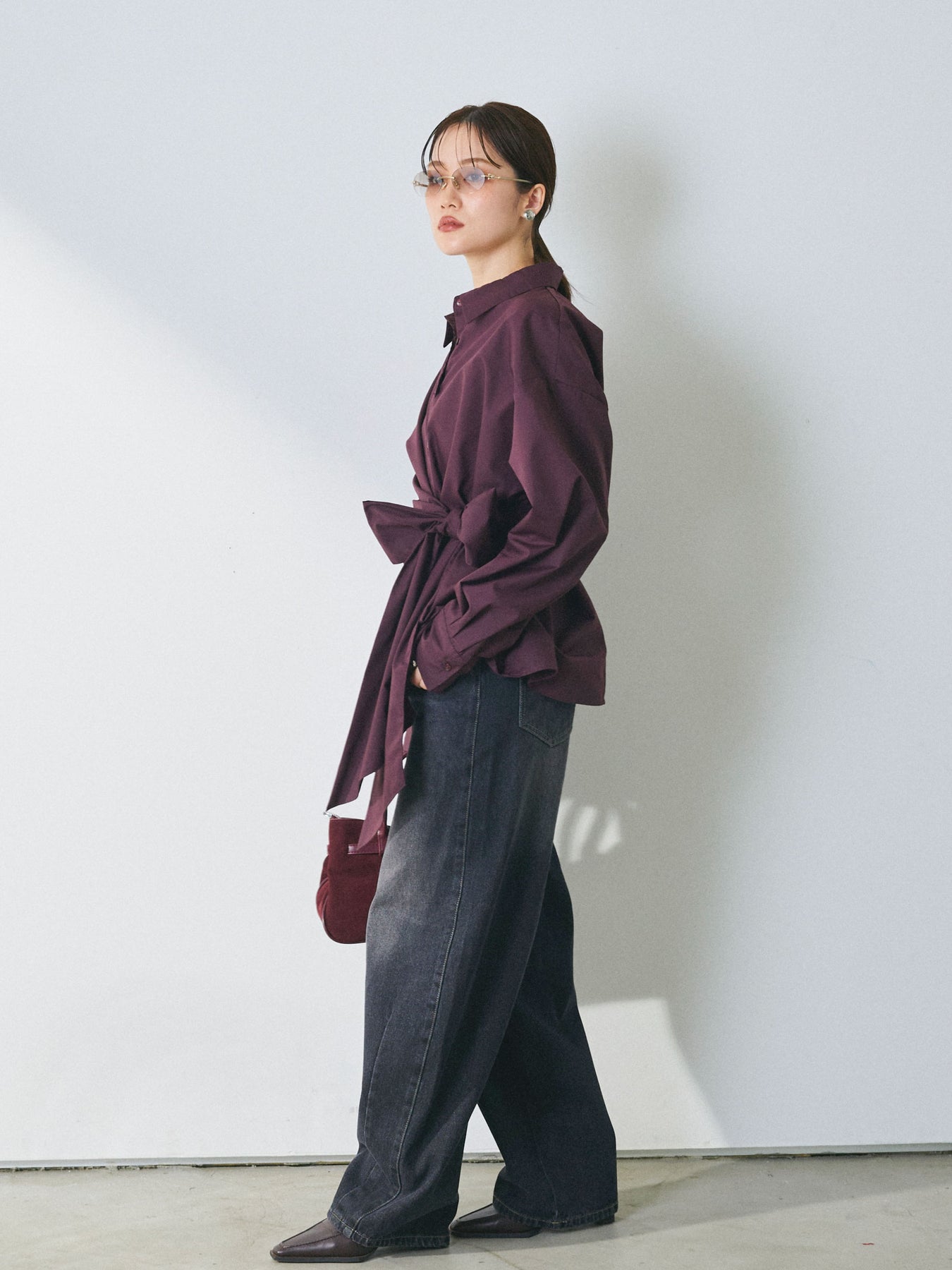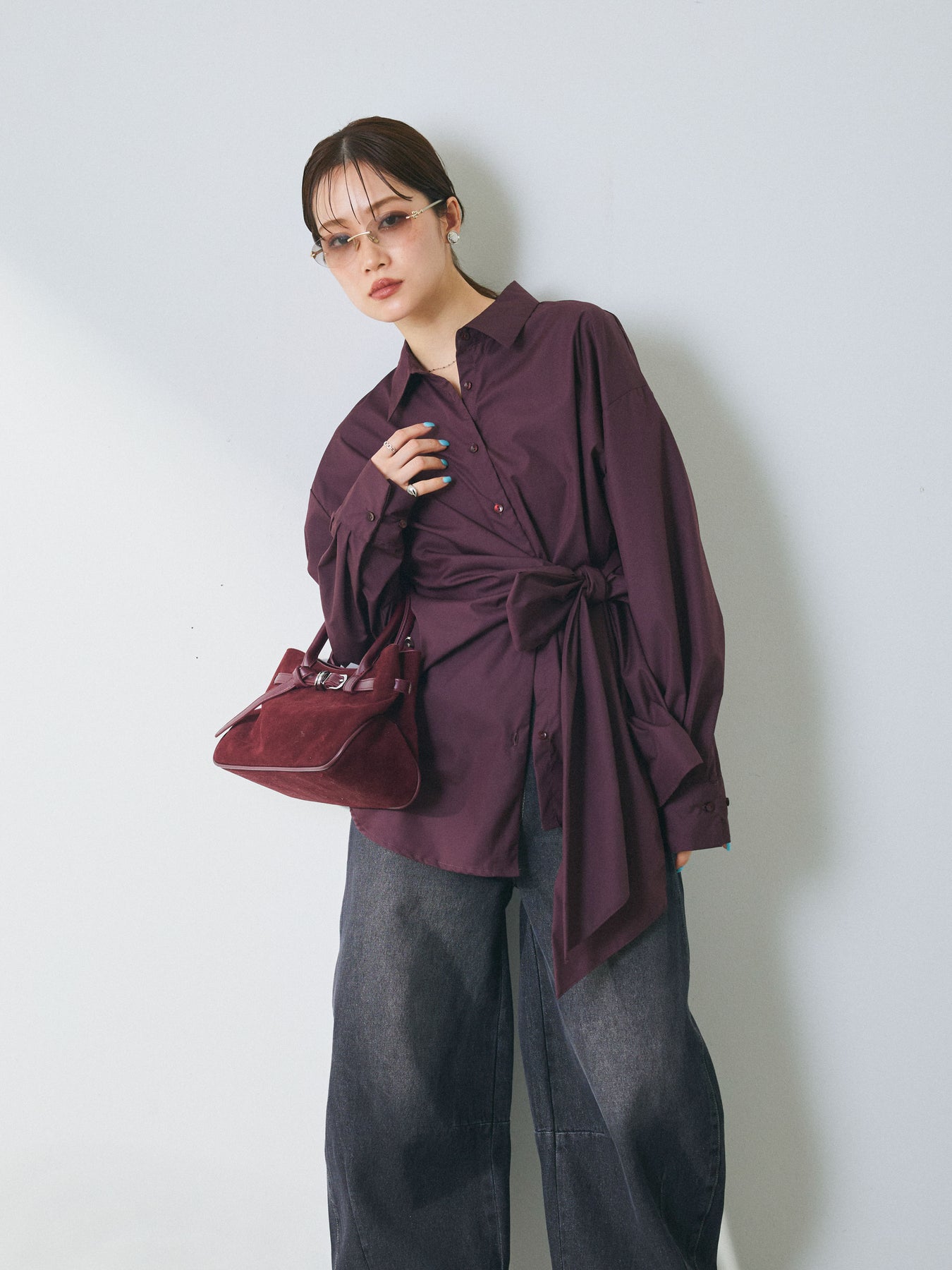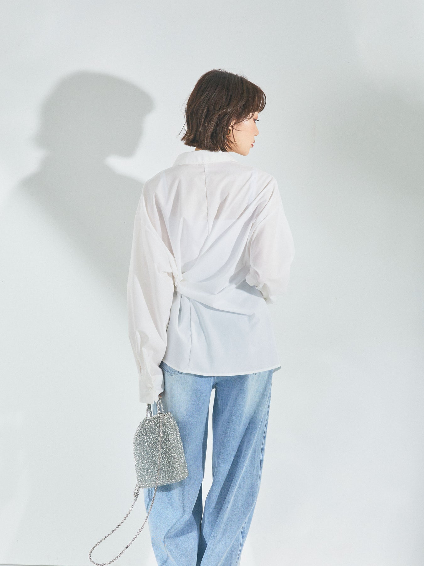 ウエストにあしらったアシンメトリーリボンが、着こなしに自然な動きを添えるデザインシャツ。 シンプルなシャツベースに、ひとひねり効かせたディテールを加えることで、スタイリングに程よい奥行きを生み出します。 フロントの重なりとリボン使いが立体感をつくり、ボトムスにインせずともバランスよくまとまるのがポイント。パンツ合わせではすっきりとした印象に、スカートと合わせれば柔らかなニュアンスも楽しめます。 一枚で存在感がありながら、着回しやすさも兼ね備えたアイテム。ベーシックなシャツに変化を加えたい方におすすめです。 ※ボトムス、キャミソール(インナー)以外の商品は一律でインナーは付属していません。