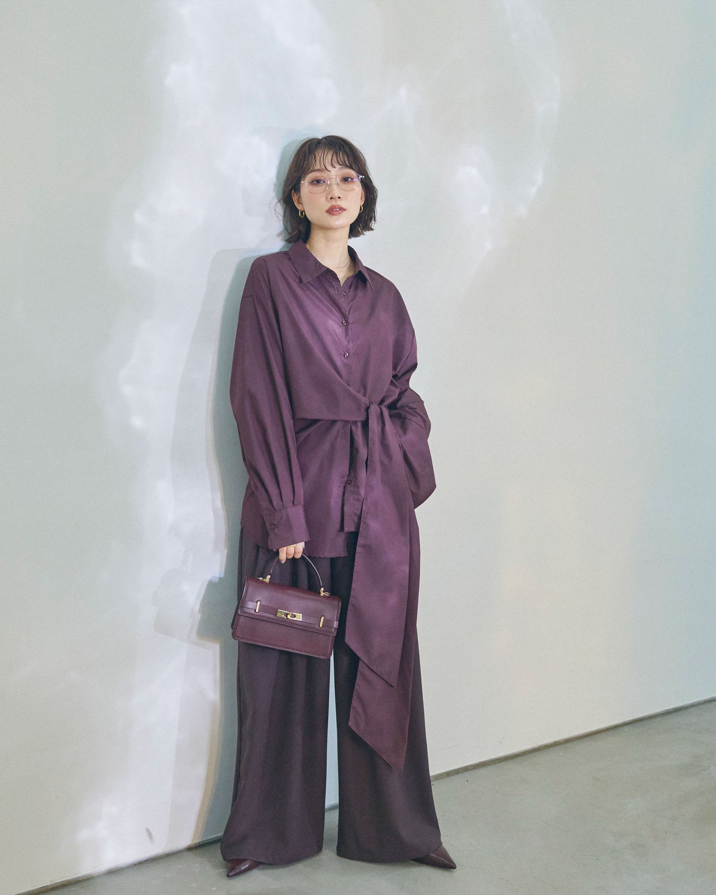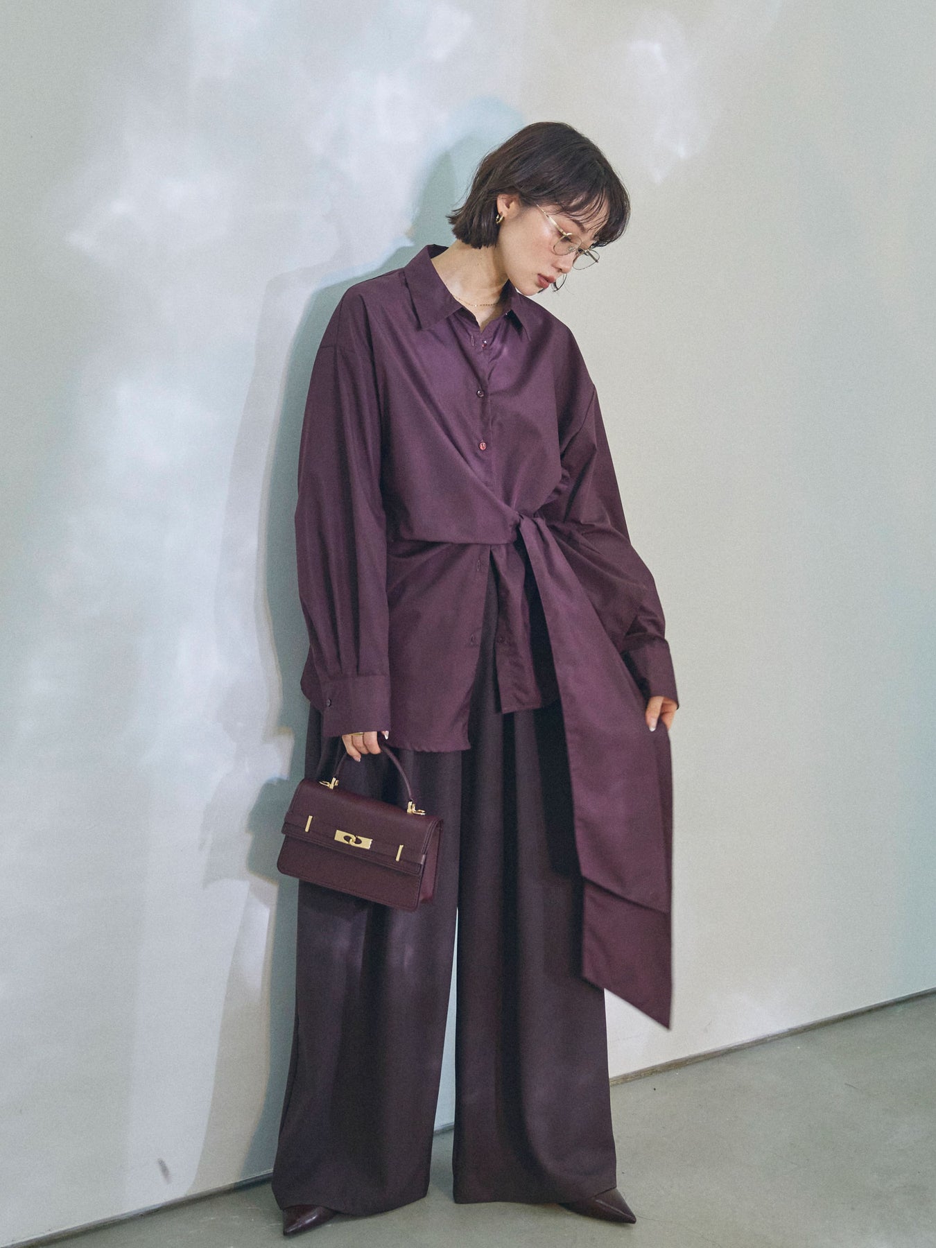 【Allure】[SET]ウエストアシメリボンシャツ+ベルトループデザインワイドパンツ(2set)