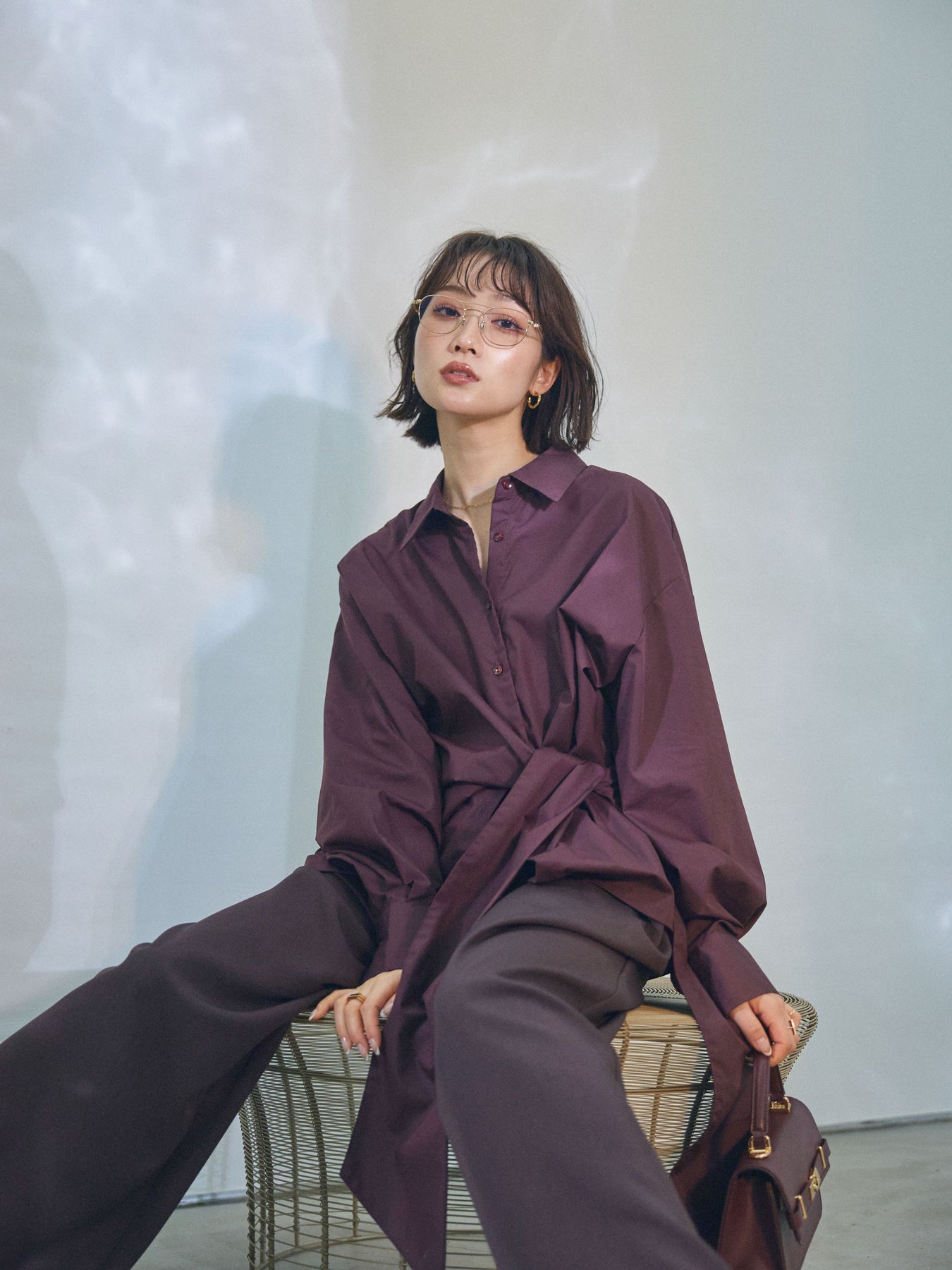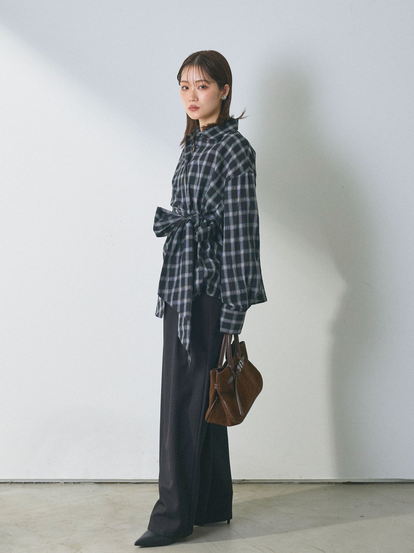 ウエストにあしらったアシンメトリーリボンが、着こなしに自然な動きを添えるデザインシャツ。 シンプルなシャツベースに、ひとひねり効かせたディテールを加えることで、スタイリングに程よい奥行きを生み出します。 フロントの重なりとリボン使いが立体感をつくり、ボトムスにインせずともバランスよくまとまるのがポイント。パンツ合わせではすっきりとした印象に、スカートと合わせれば柔らかなニュアンスも楽しめます。 一枚で存在感がありながら、着回しやすさも兼ね備えたアイテム。ベーシックなシャツに変化を加えたい方におすすめです。 ※ボトムス、キャミソール(インナー)以外の商品は一律でインナーは付属していません。