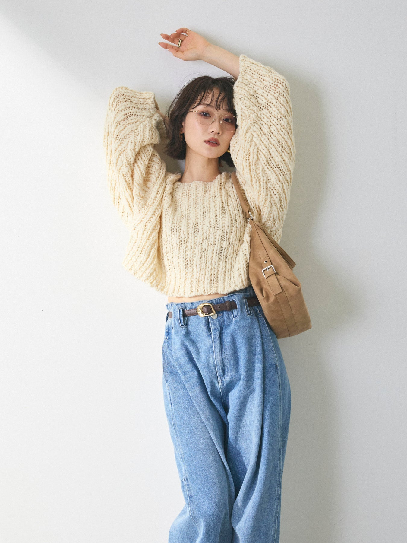 【Allure】[SET]クロップドチャンキースラブニットプルオーバー+ハイウエストベルトループデザインデニムパンツ(2set)