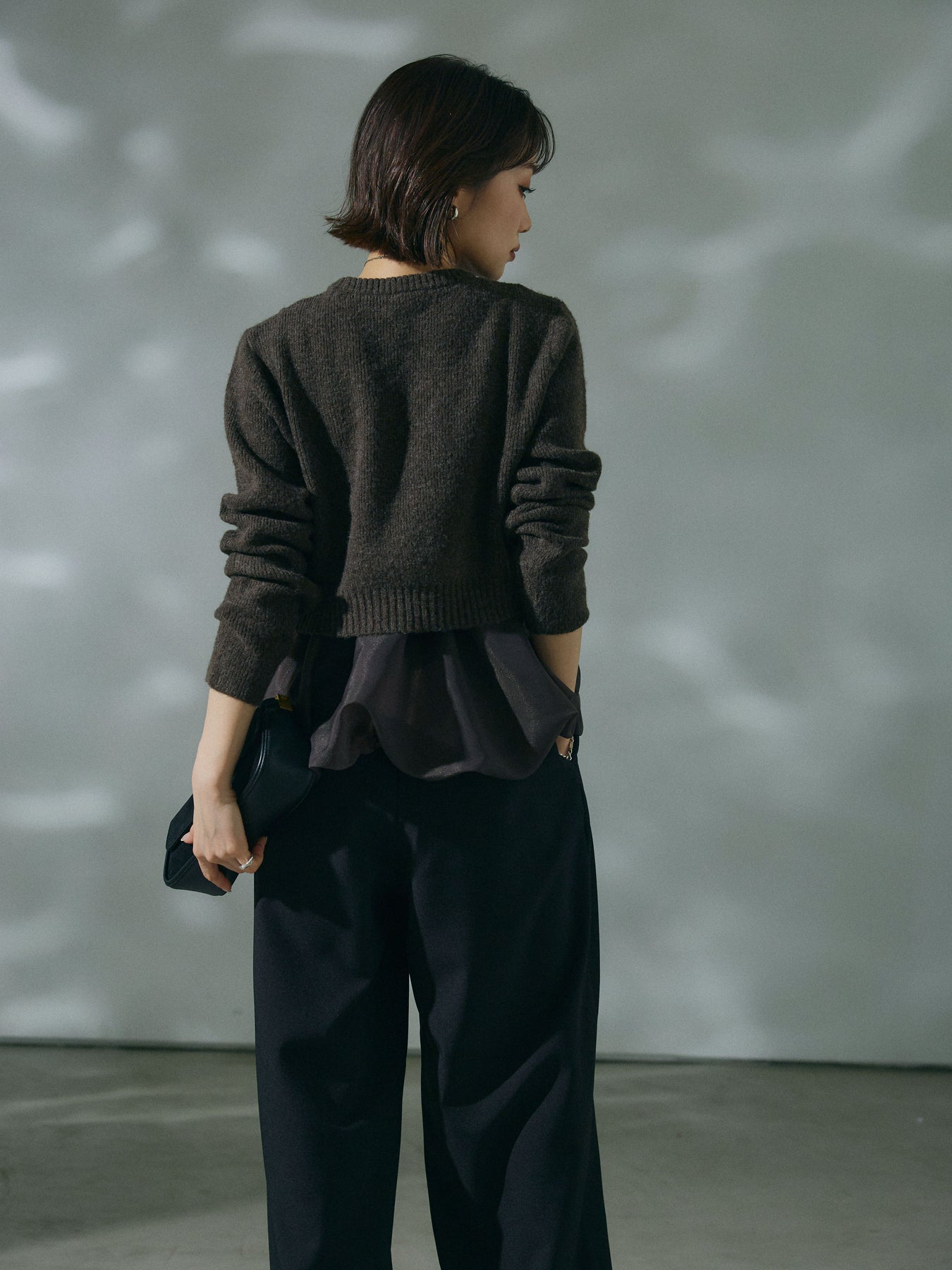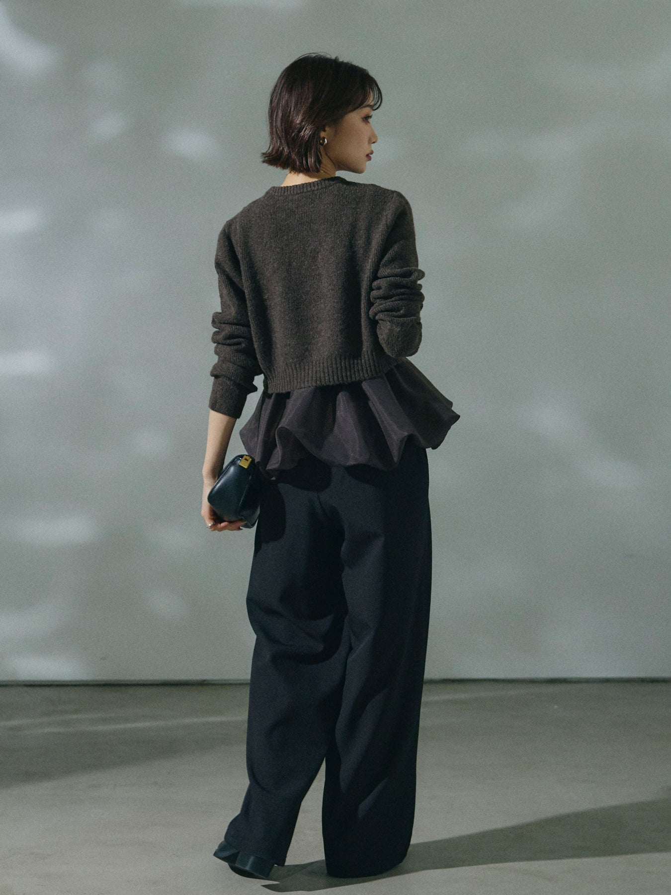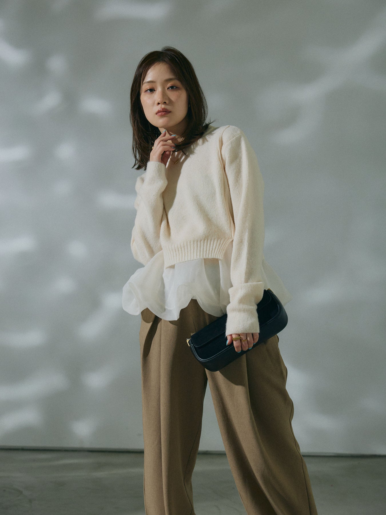 オーガンジー素材のバルーンキャミソールとニットを組み合わせた、華やかさのあるアンサンブルニット。立体感のあるキャミデザインがスタイリングに奥行きを与え、ニットと重ねるだけで着映えする一着です。それぞれ単品でも着用でき、レイヤード次第で幅広い着こなしが楽しめるのも魅力。デイリーからお出かけまで活躍します。