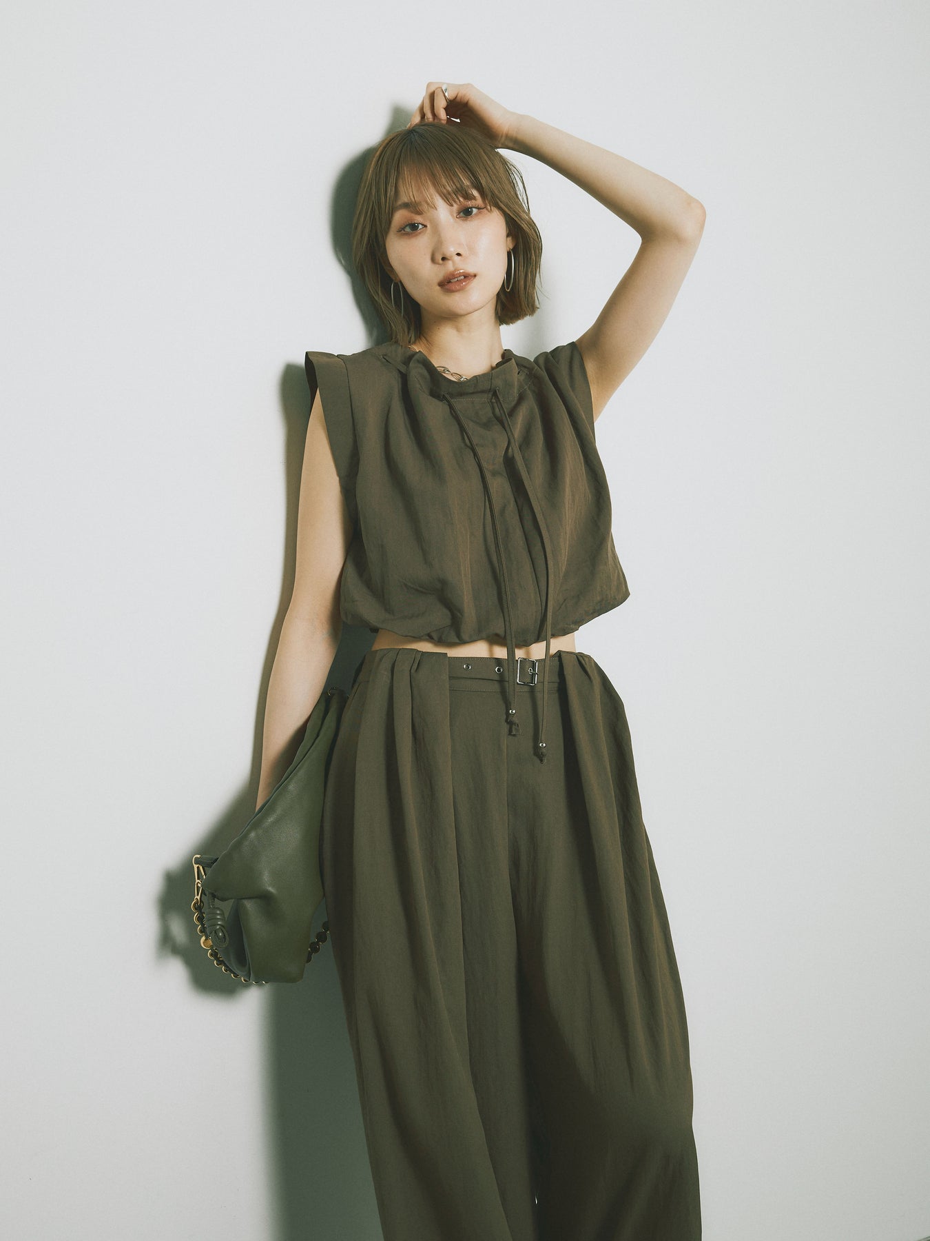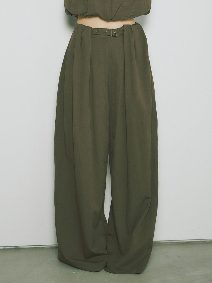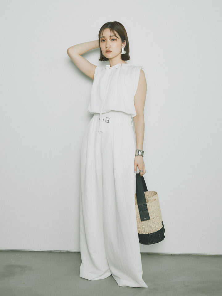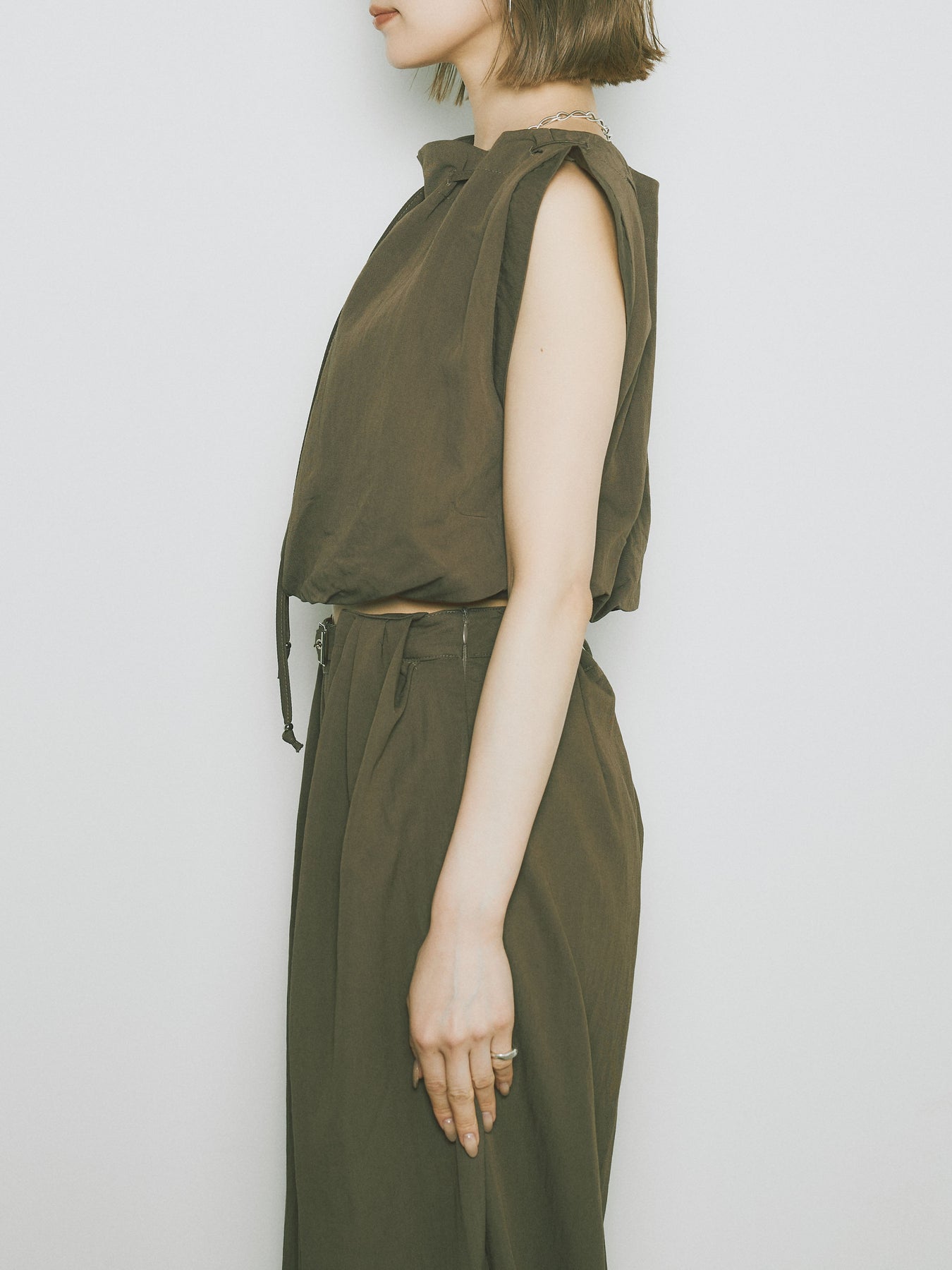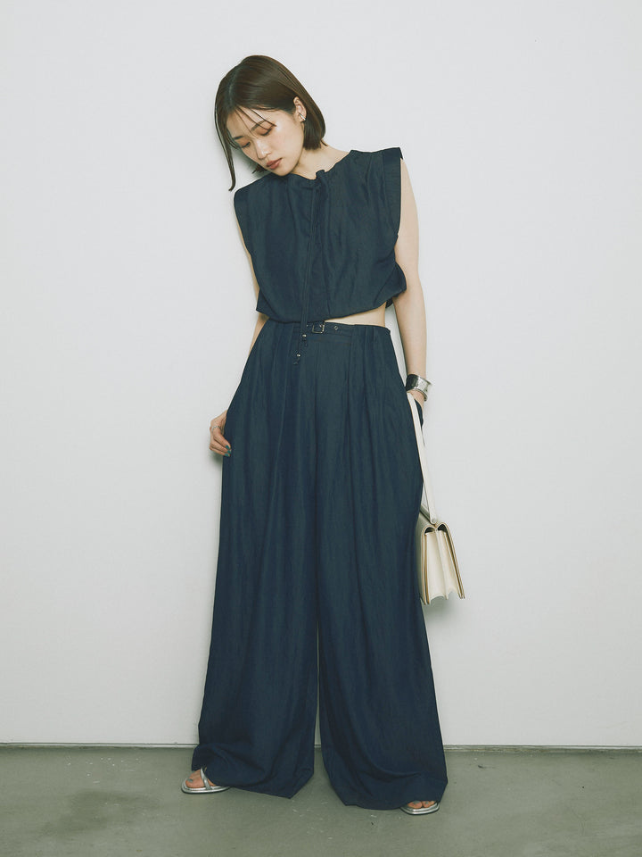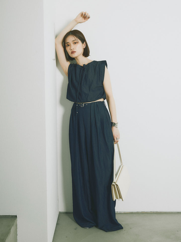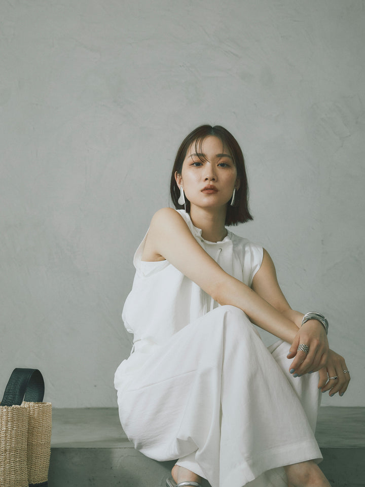 軽やかなテンセル素材で仕立てた、バルーンシルエットのトップスとパンツのセットアップ。トップスは肩紐付きのシンプルでエレガントなデザインで、リラックスしたシルエットを引き立てます。パンツはゆったりとしたバルーンシルエットで、動きやすさと快適さを兼ね備えています。セットアップとしてはもちろん、単品でも使える万能アイテムです。ナチュラルな色合いで、春夏にぴったりのスタイルを完成させます。 ※ボトムス、キャミソール(インナー)以外の商品は一律でインナーは付属していません。