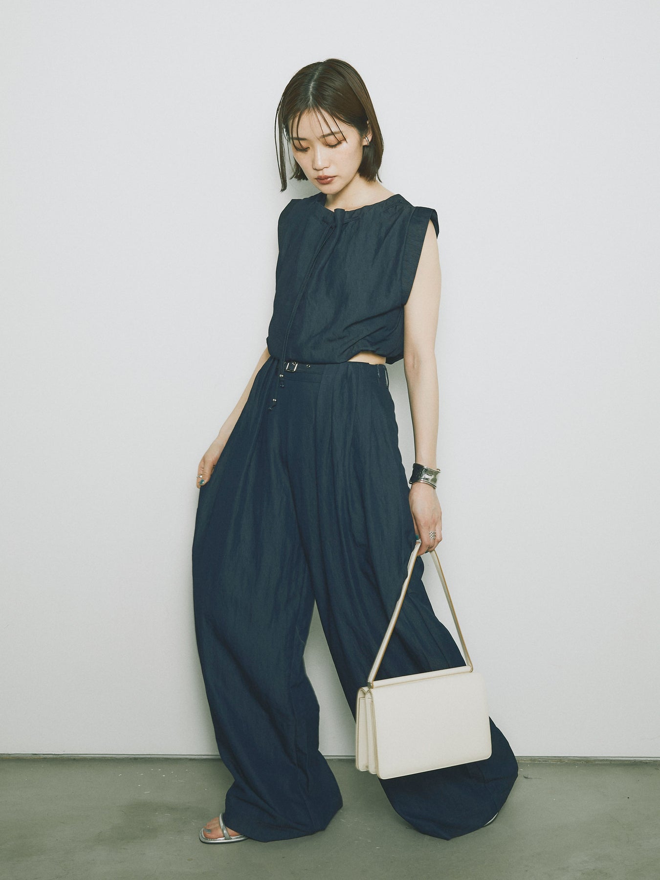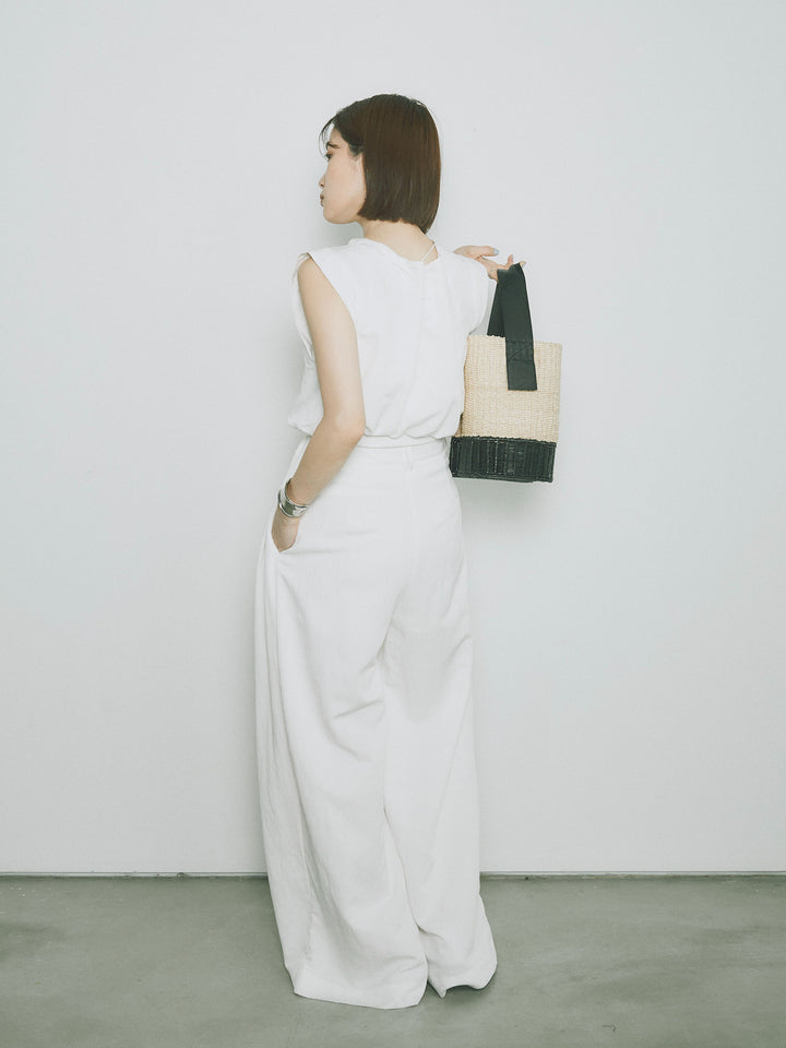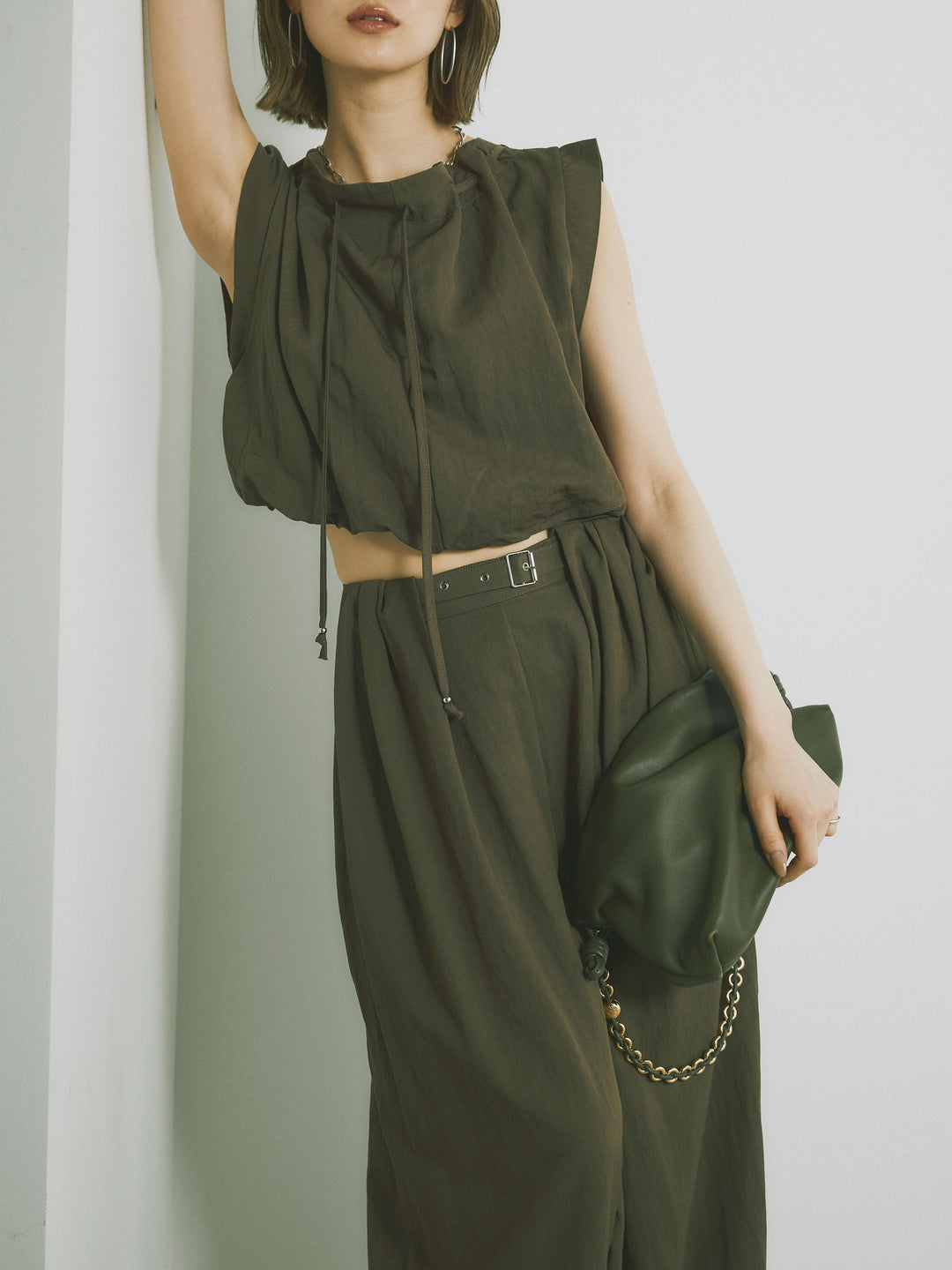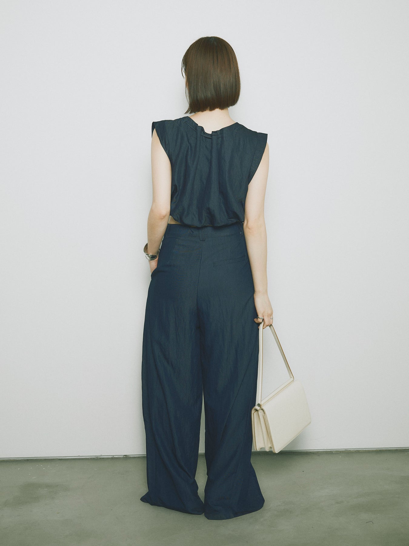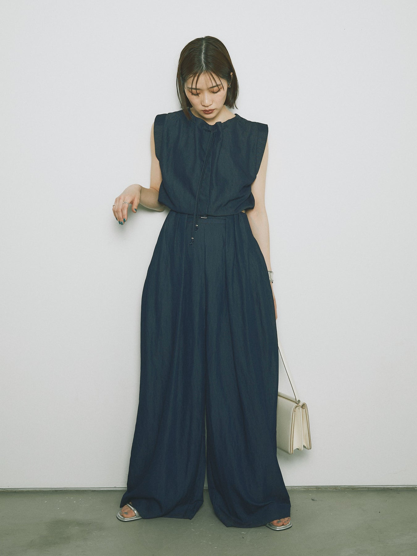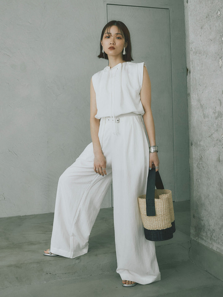 軽やかなテンセル素材で仕立てた、バルーンシルエットのトップスとパンツのセットアップ。トップスは肩紐付きのシンプルでエレガントなデザインで、リラックスしたシルエットを引き立てます。パンツはゆったりとしたバルーンシルエットで、動きやすさと快適さを兼ね備えています。セットアップとしてはもちろん、単品でも使える万能アイテムです。ナチュラルな色合いで、春夏にぴったりのスタイルを完成させます。 ※ボトムス、キャミソール(インナー)以外の商品は一律でインナーは付属していません。