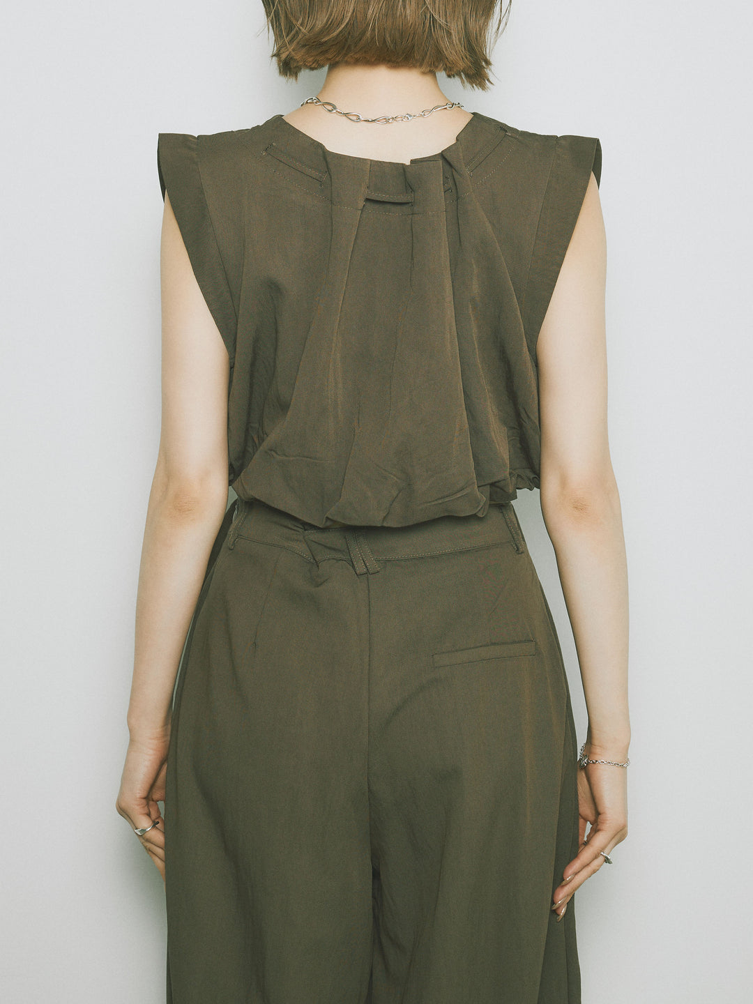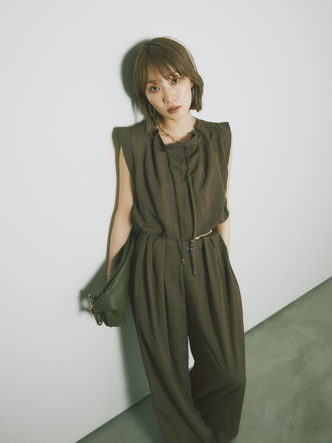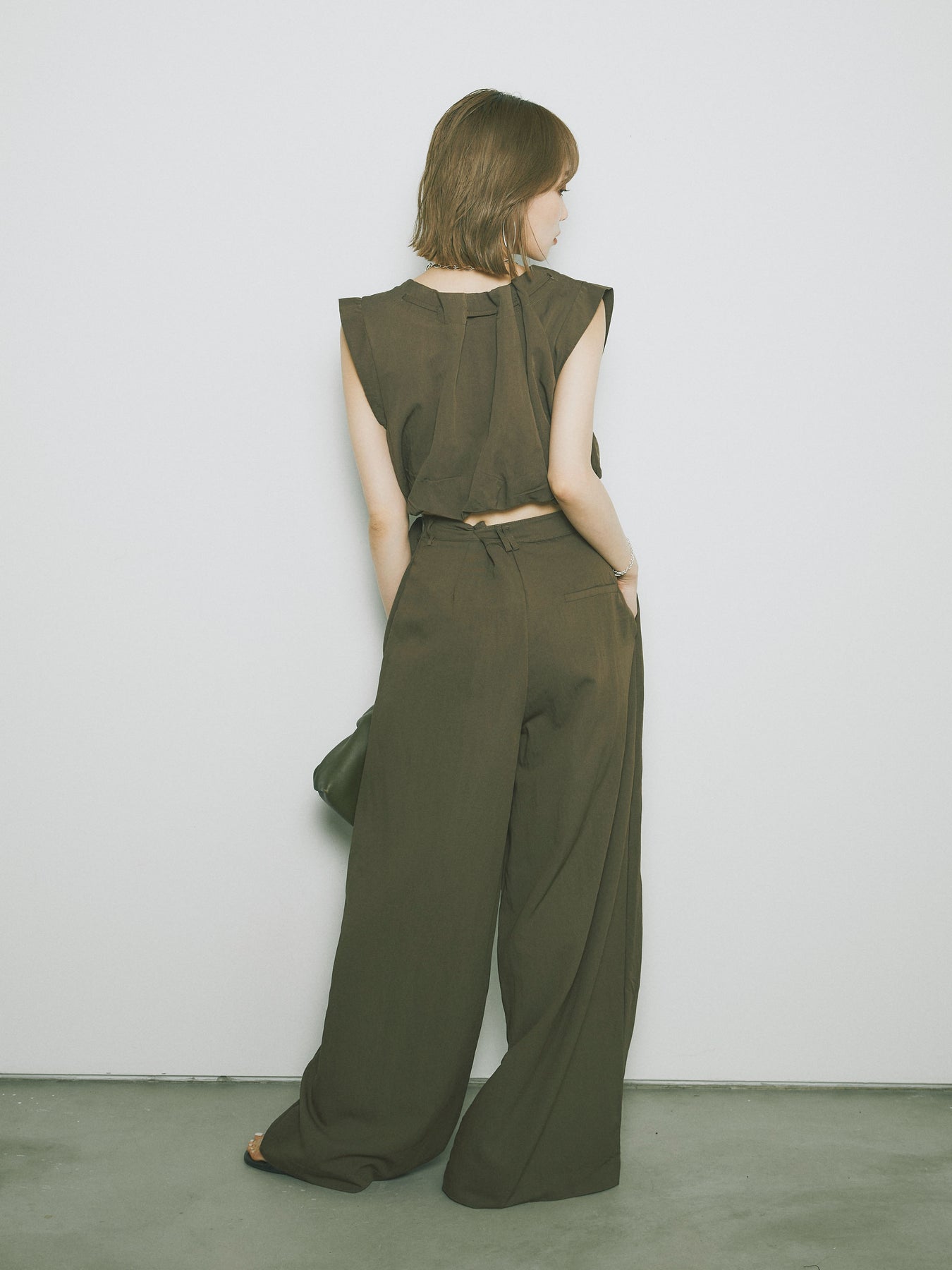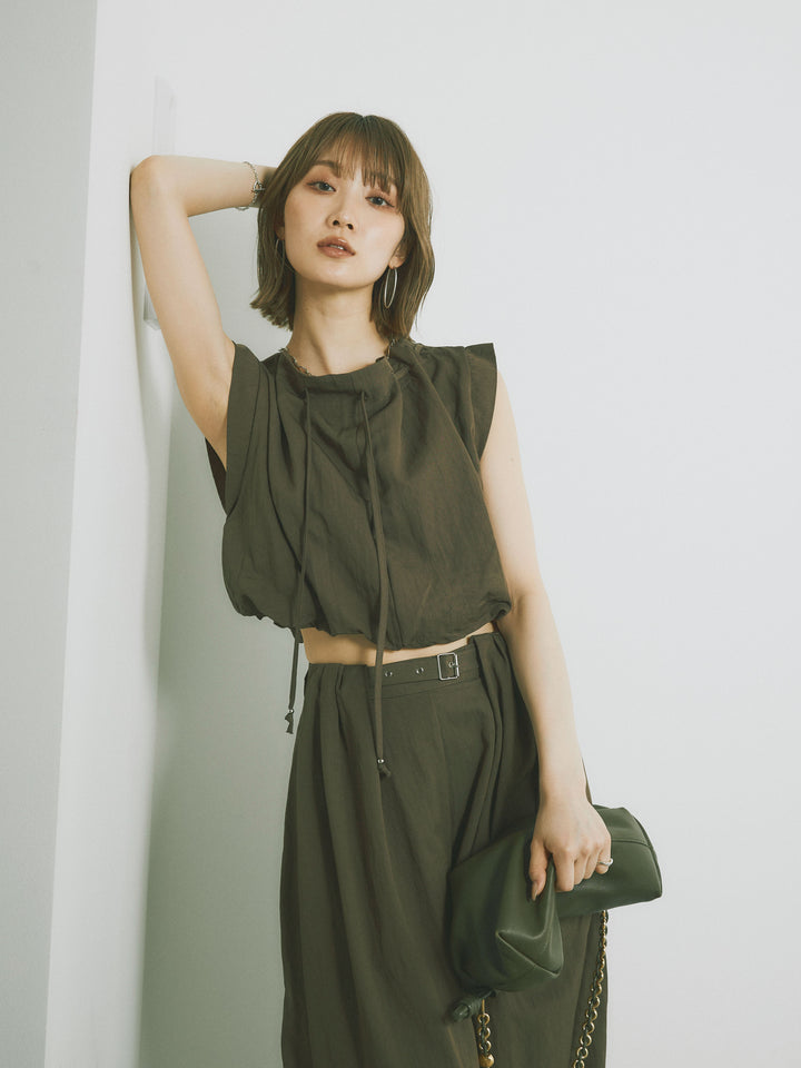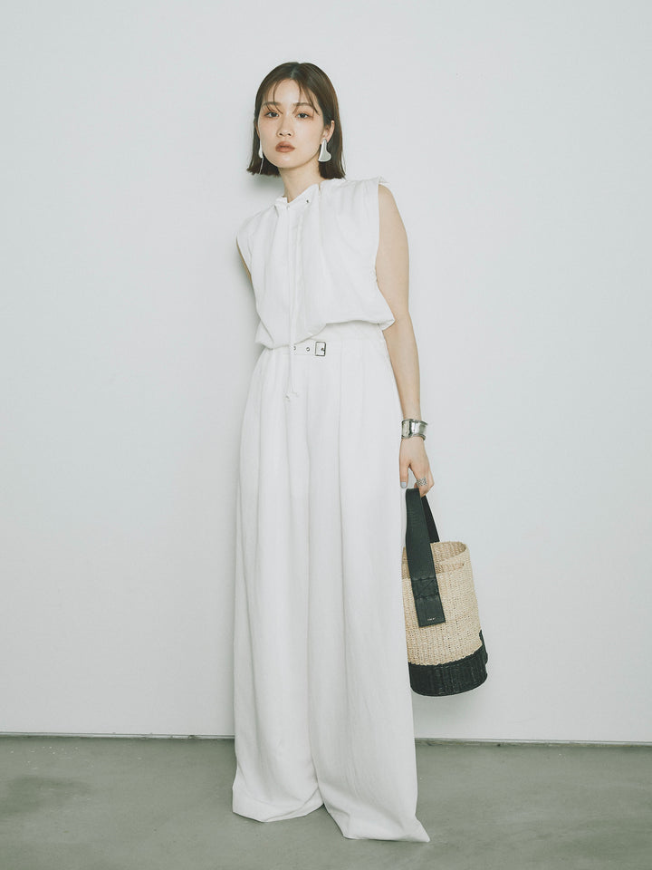 軽やかなテンセル素材で仕立てた、バルーンシルエットのトップスとパンツのセットアップ。トップスは肩紐付きのシンプルでエレガントなデザインで、リラックスしたシルエットを引き立てます。パンツはゆったりとしたバルーンシルエットで、動きやすさと快適さを兼ね備えています。セットアップとしてはもちろん、単品でも使える万能アイテムです。ナチュラルな色合いで、春夏にぴったりのスタイルを完成させます。 ※ボトムス、キャミソール(インナー)以外の商品は一律でインナーは付属していません。