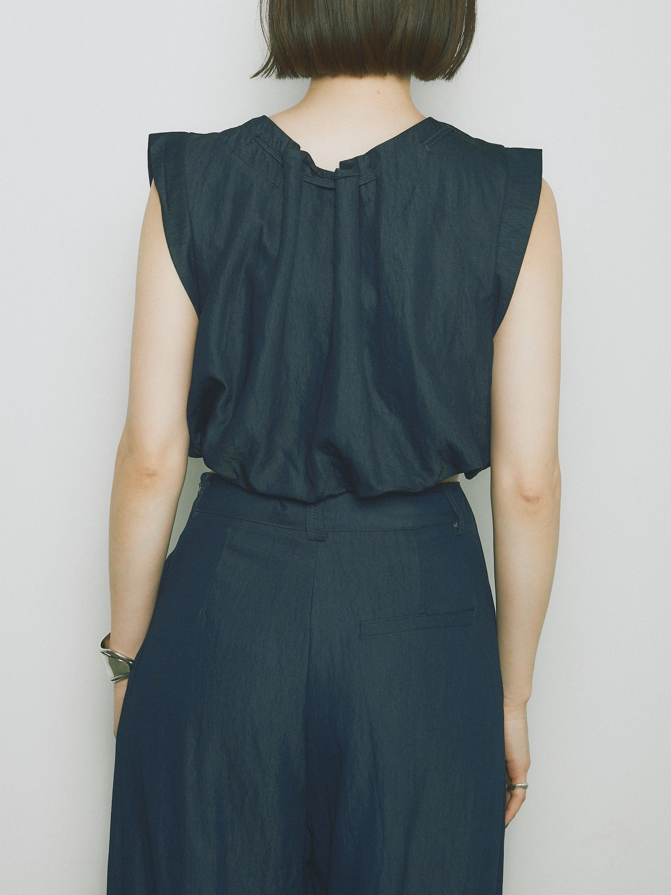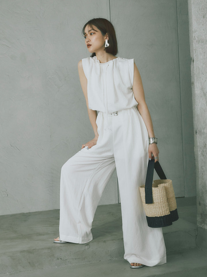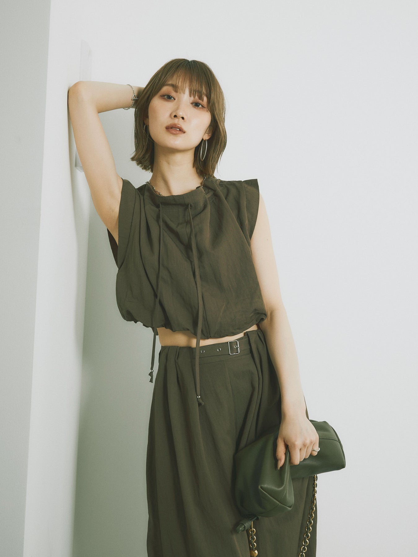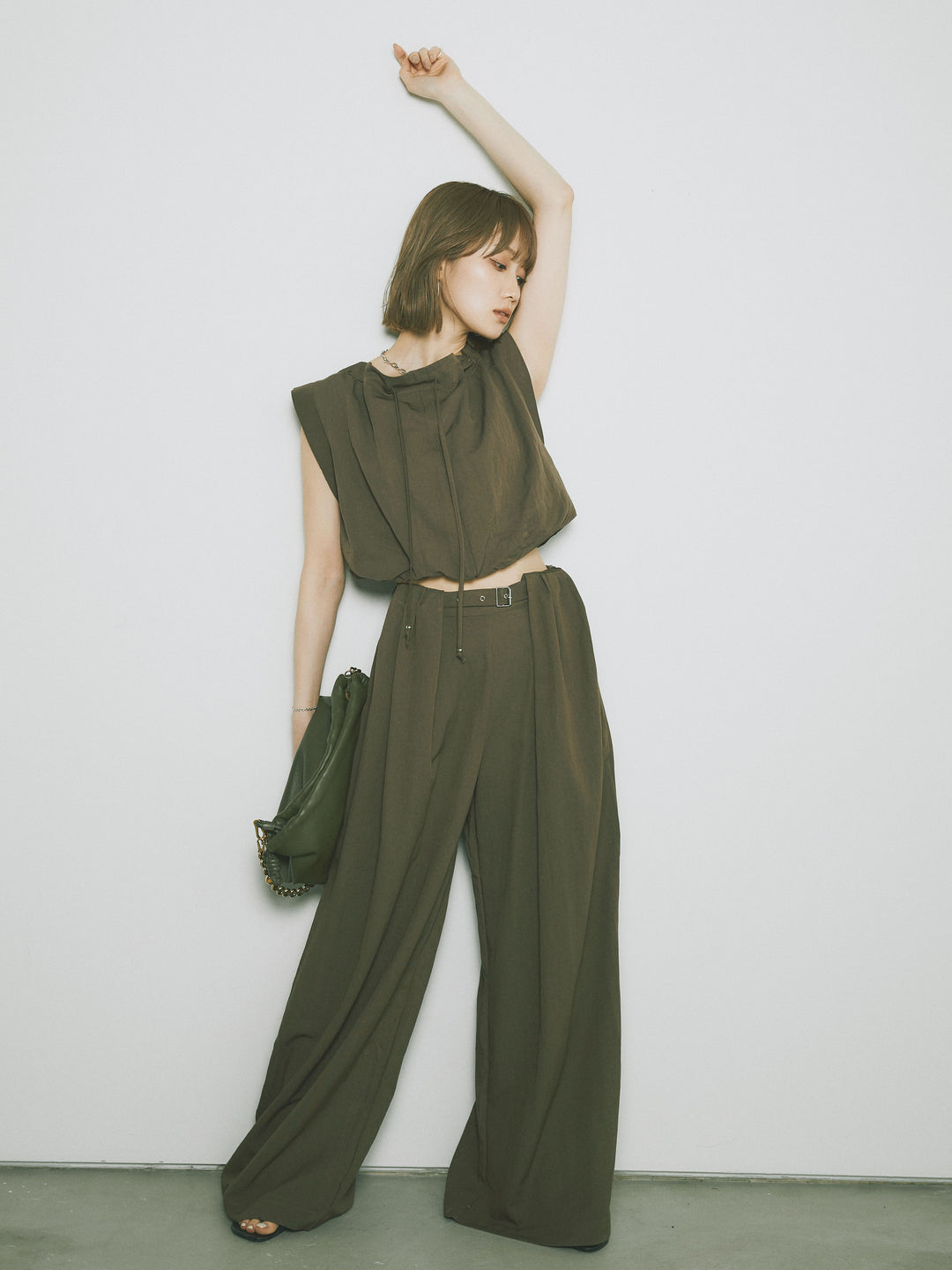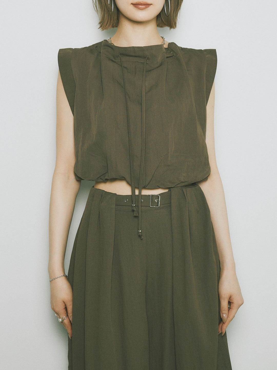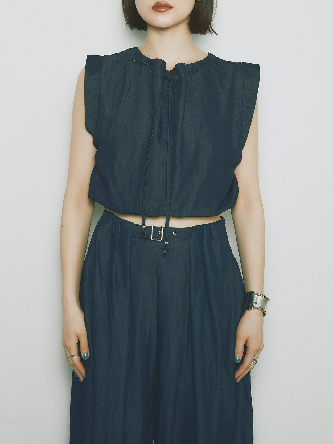 軽やかなテンセル素材で仕立てた、バルーンシルエットのトップスとパンツのセットアップ。トップスは肩紐付きのシンプルでエレガントなデザインで、リラックスしたシルエットを引き立てます。パンツはゆったりとしたバルーンシルエットで、動きやすさと快適さを兼ね備えています。セットアップとしてはもちろん、単品でも使える万能アイテムです。ナチュラルな色合いで、春夏にぴったりのスタイルを完成させます。 ※ボトムス、キャミソール(インナー)以外の商品は一律でインナーは付属していません。