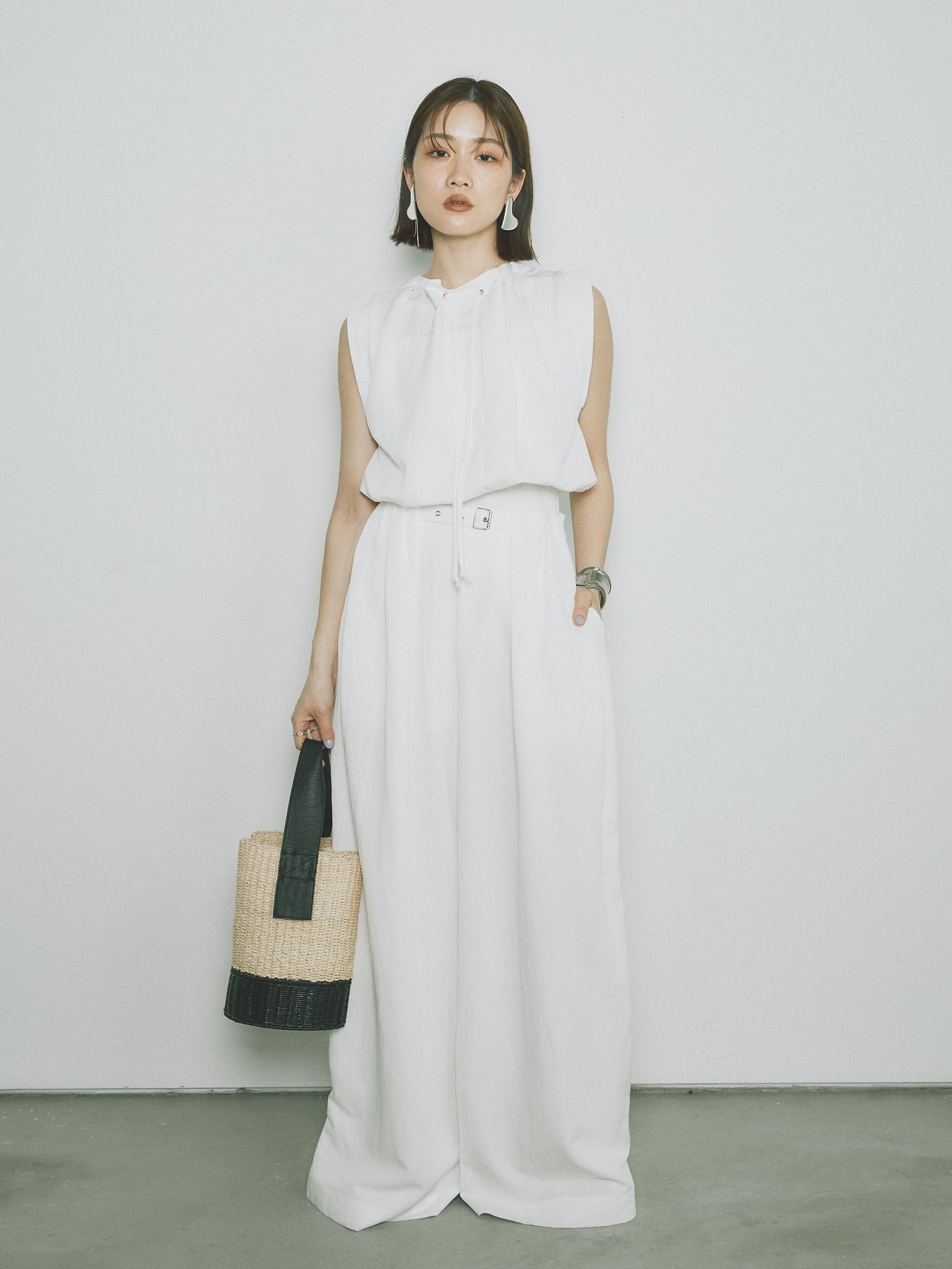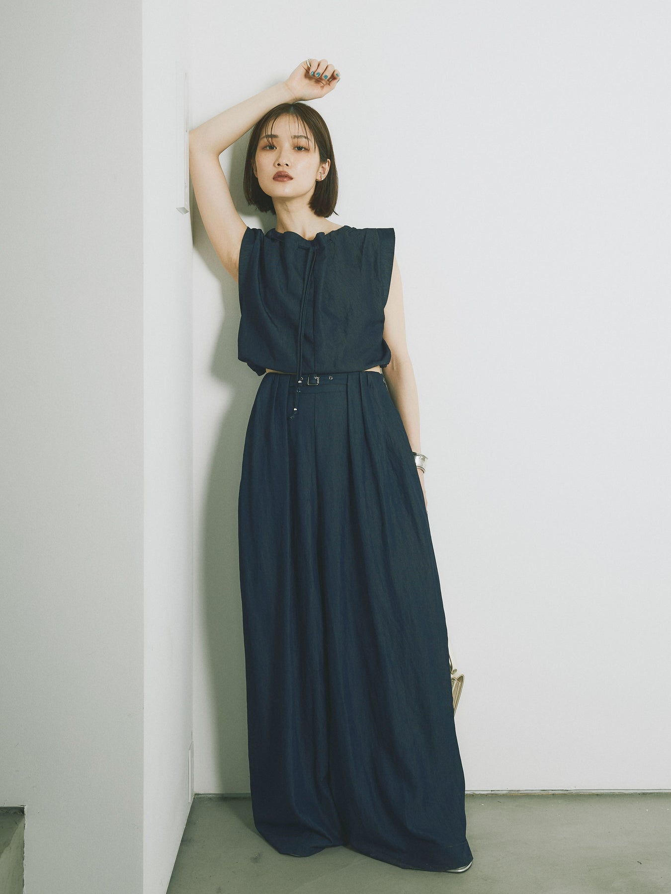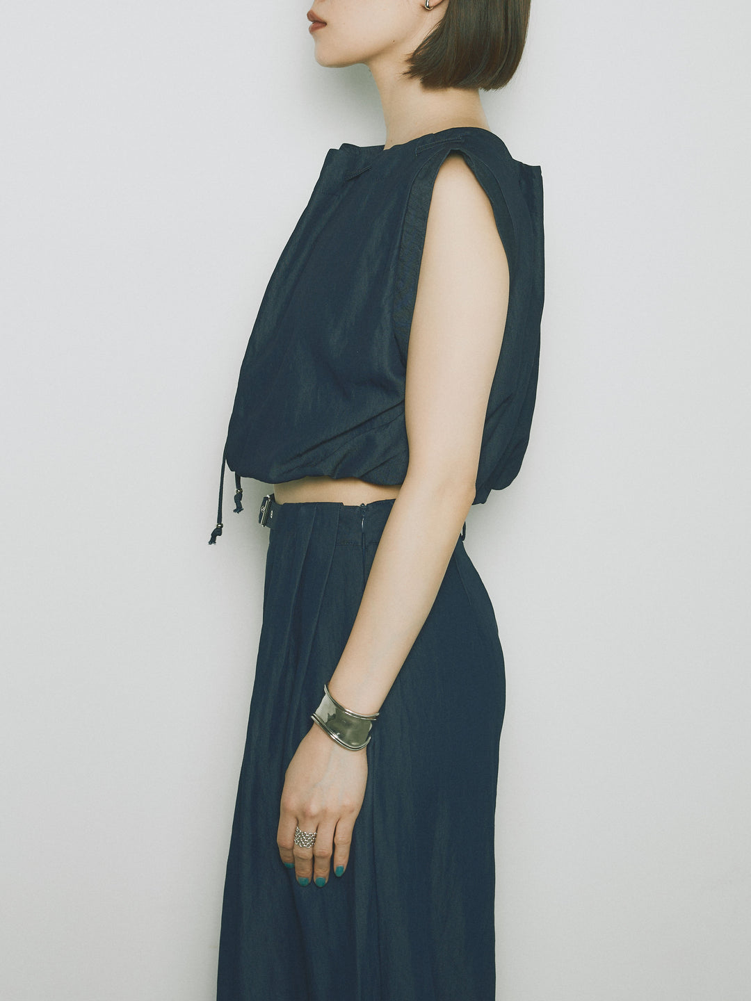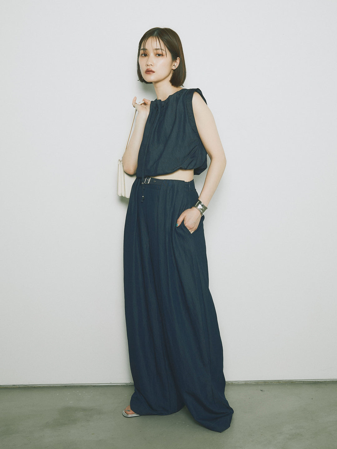 軽やかなテンセル素材で仕立てた、バルーンシルエットのトップスとパンツのセットアップ。トップスは肩紐付きのシンプルでエレガントなデザインで、リラックスしたシルエットを引き立てます。パンツはゆったりとしたバルーンシルエットで、動きやすさと快適さを兼ね備えています。セットアップとしてはもちろん、単品でも使える万能アイテムです。ナチュラルな色合いで、春夏にぴったりのスタイルを完成させます。 ※ボトムス、キャミソール(インナー)以外の商品は一律でインナーは付属していません。