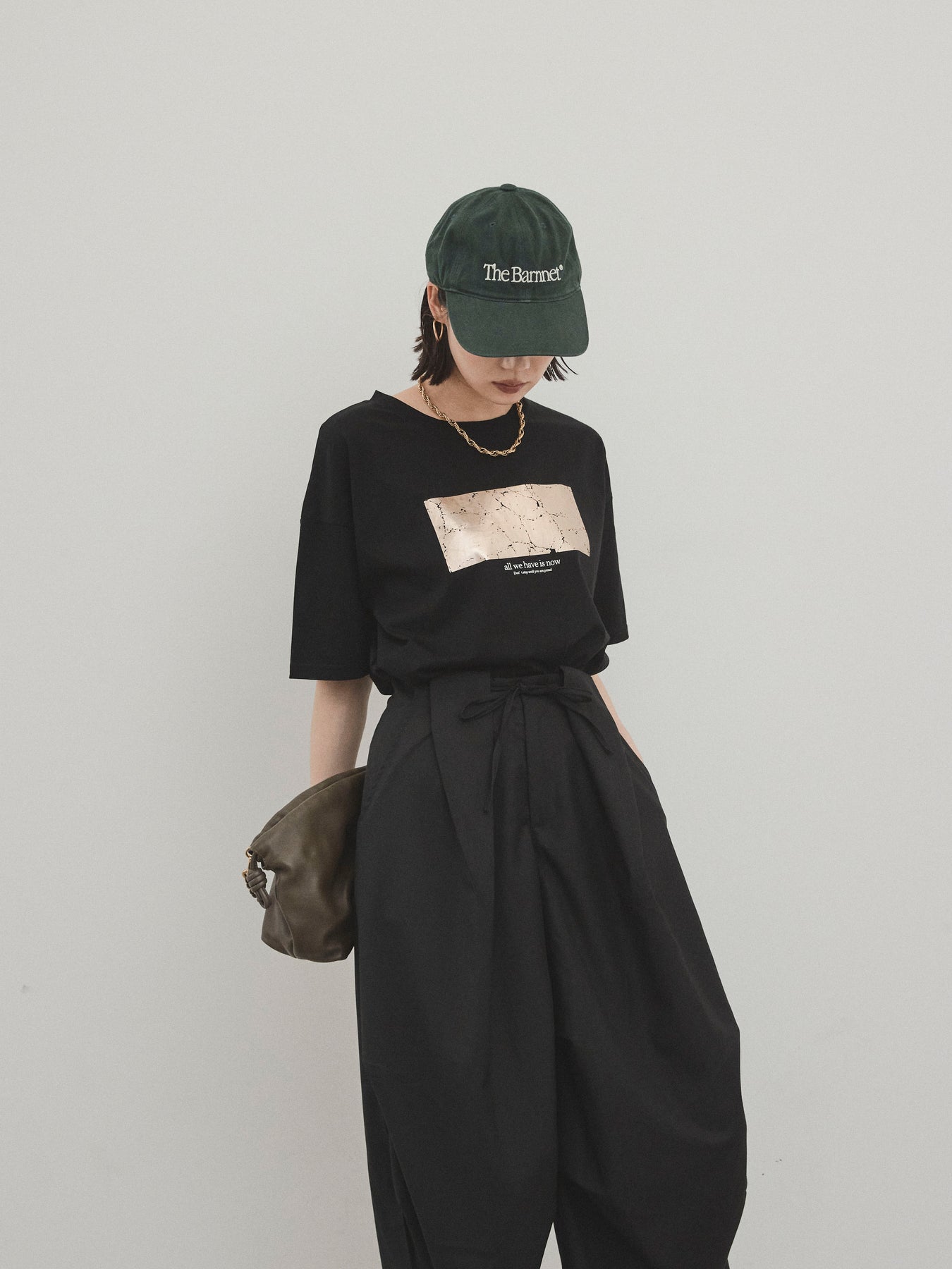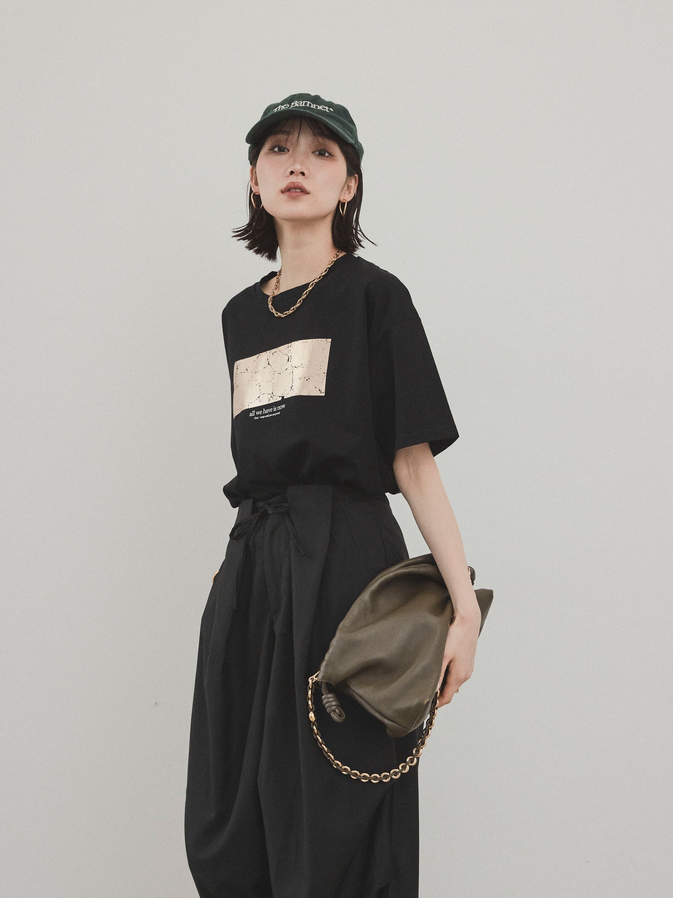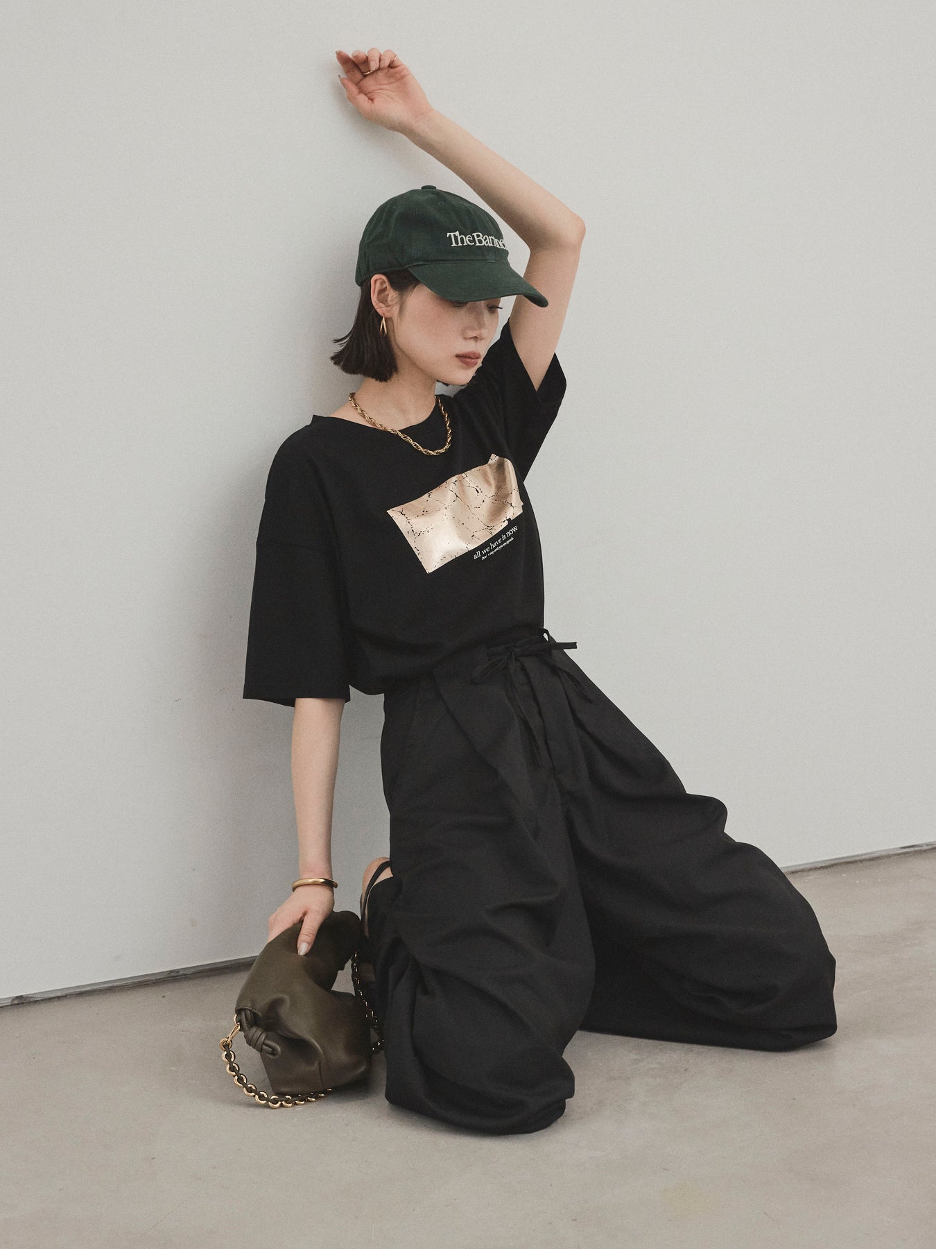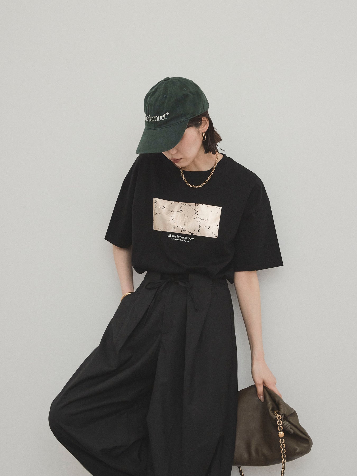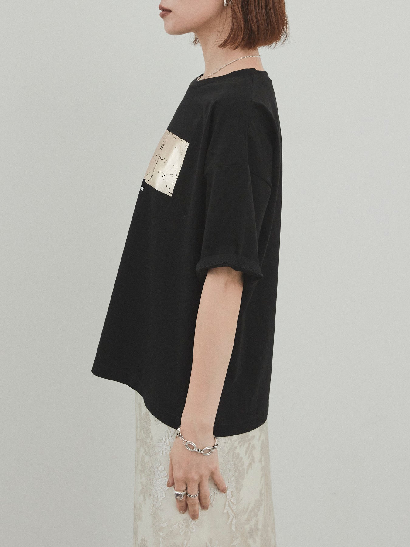 存在感のある箔プリントが目を惹く、大人のためのグラフィックTシャツ。 メッセージ性のあるロゴとマーブル調のアートが、シンプルながらも個性を引き立ててくれます。 さらっとしたドライタッチなコットン素材で、汗ばむ季節でも快適な着心地。 程よくゆとりのあるシルエットで、タックインもアウトも決まる万能な一枚です。 カジュアルなデニムや、レーススカートなど異素材ミックスコーデにも好相性。 デイリー使いはもちろん、ワンポイントでスタイリングに差がつくアイテムです。