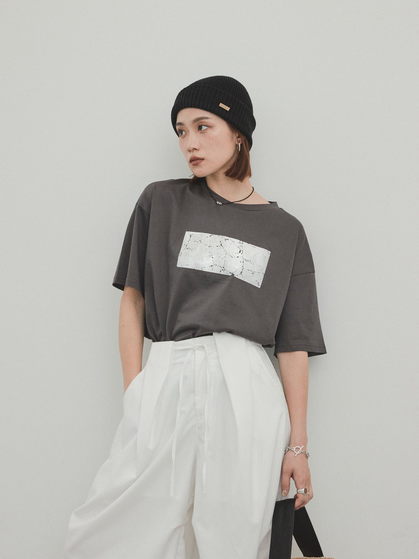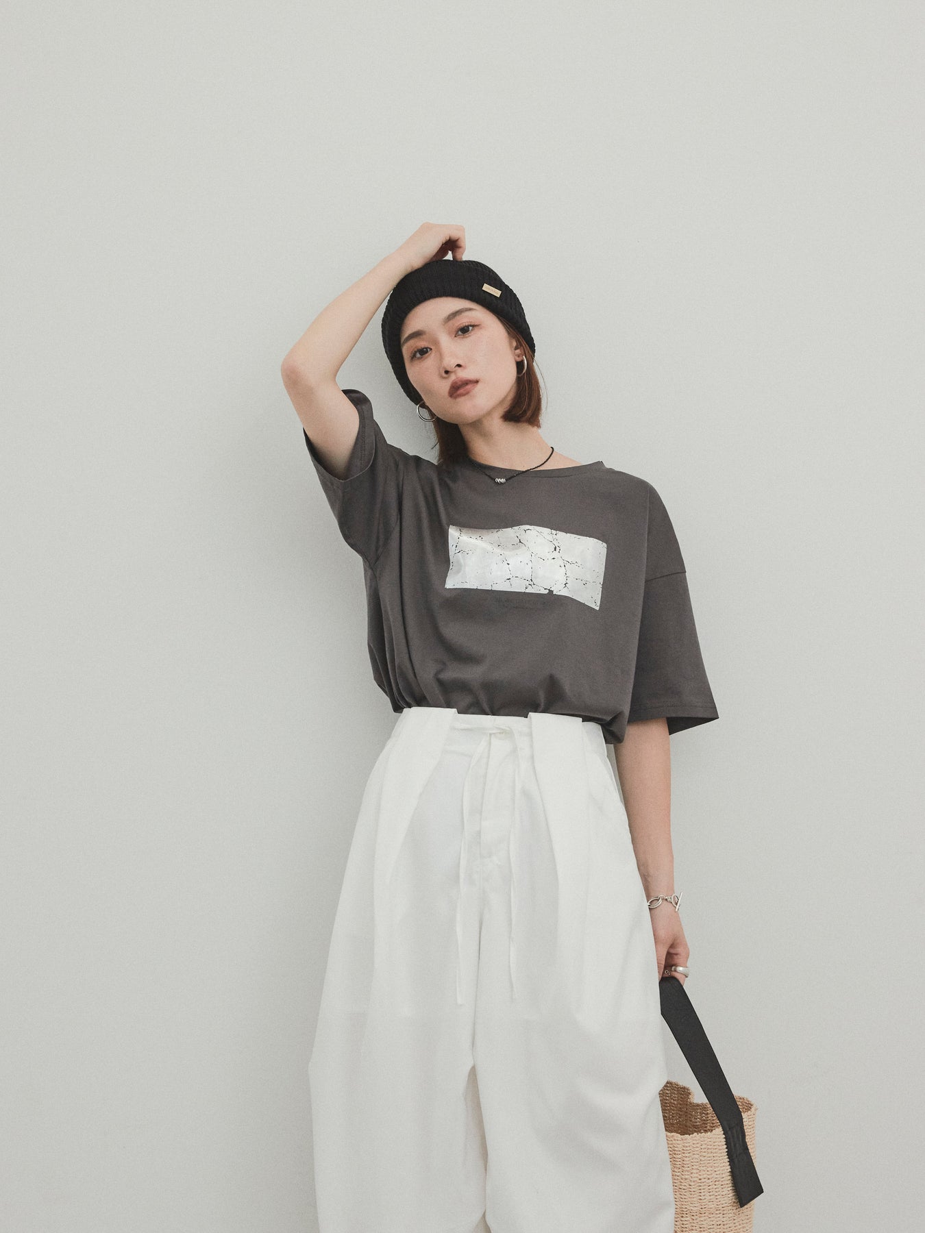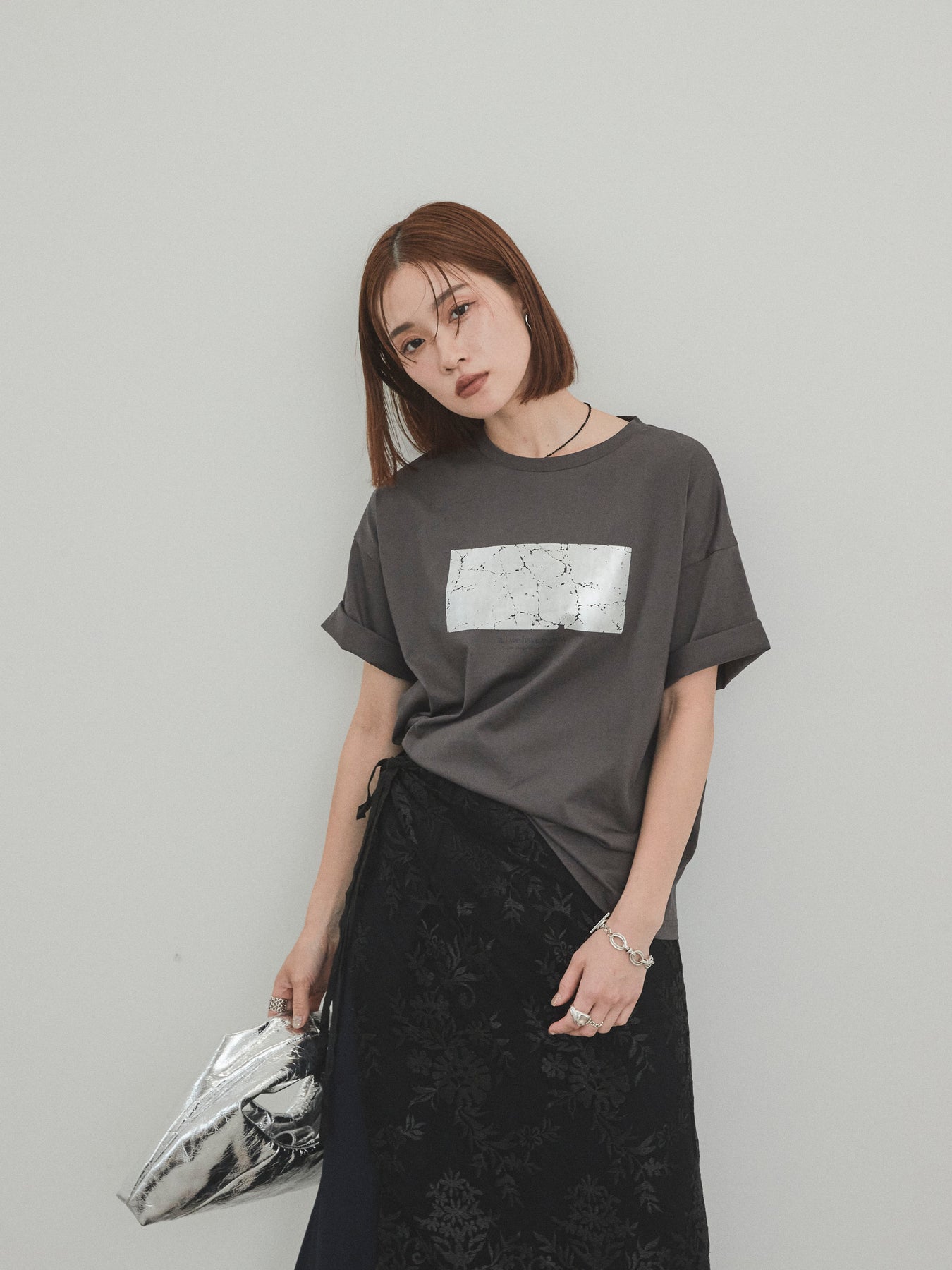 存在感のある箔プリントが目を惹く、大人のためのグラフィックTシャツ。 メッセージ性のあるロゴとマーブル調のアートが、シンプルながらも個性を引き立ててくれます。 さらっとしたドライタッチなコットン素材で、汗ばむ季節でも快適な着心地。 程よくゆとりのあるシルエットで、タックインもアウトも決まる万能な一枚です。 カジュアルなデニムや、レーススカートなど異素材ミックスコーデにも好相性。 デイリー使いはもちろん、ワンポイントでスタイリングに差がつくアイテムです。