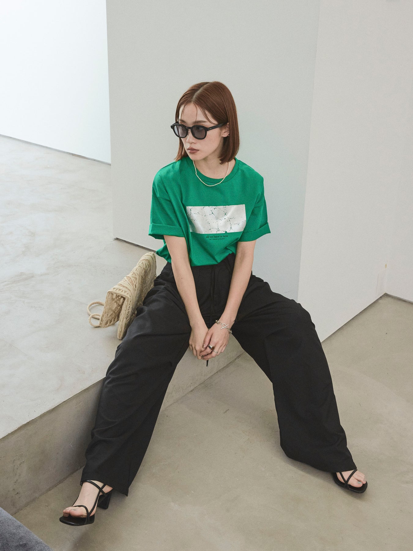 存在感のある箔プリントが目を惹く、大人のためのグラフィックTシャツ。 メッセージ性のあるロゴとマーブル調のアートが、シンプルながらも個性を引き立ててくれます。 さらっとしたドライタッチなコットン素材で、汗ばむ季節でも快適な着心地。 程よくゆとりのあるシルエットで、タックインもアウトも決まる万能な一枚です。 カジュアルなデニムや、レーススカートなど異素材ミックスコーデにも好相性。 デイリー使いはもちろん、ワンポイントでスタイリングに差がつくアイテムです。