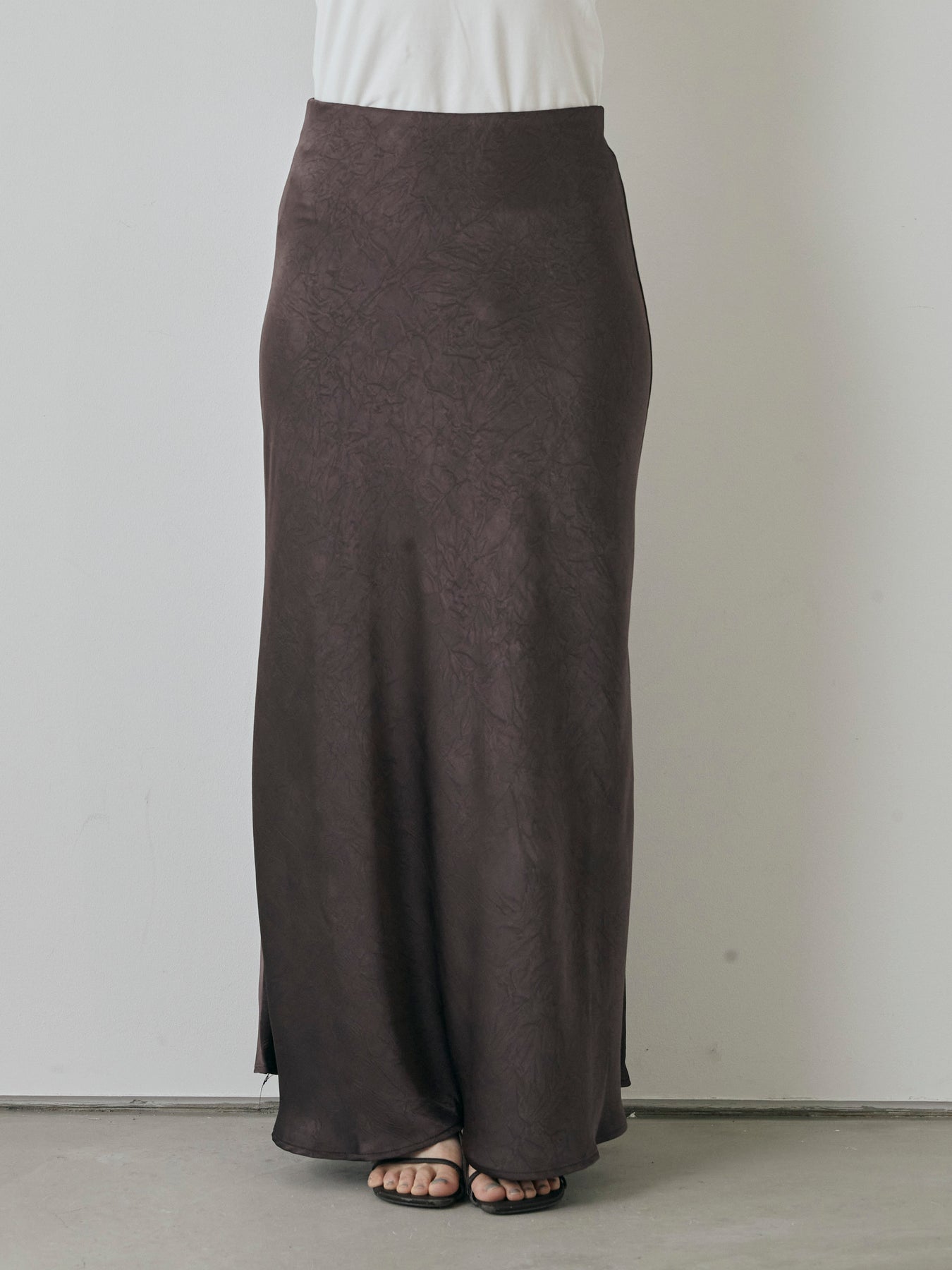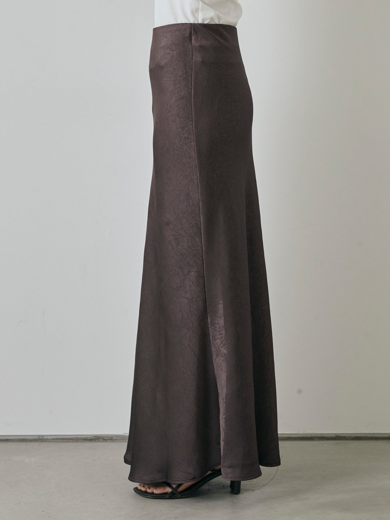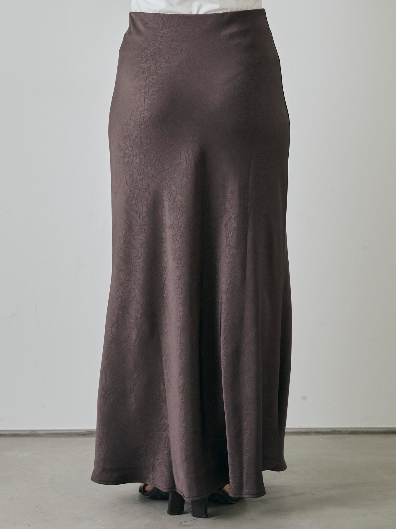 さりげない光沢感とワッシャー加工の表情が魅力の、大人のためのサテンナロースカート。 上品な艶感のある素材に、表面のシボ感が加わることで、シンプルながら奥行きのある印象に仕上がっています。 腰まわりはすっきりと、裾にかけてややフレアに広がる美しいシルエットが女性らしさを引き立て、スタイルアップ効果も抜群。 ストレッチ性のある裏地付きで、動きやすさと安心感も兼ね備えています。 Tシャツやシャツと合わせてカジュアルダウンするのはもちろん、ノースリーブやブラウスでキレイめに仕上げるのもおすすめ。 デイリーからちょっとしたお出かけまで、幅広く活躍する万能スカートです。