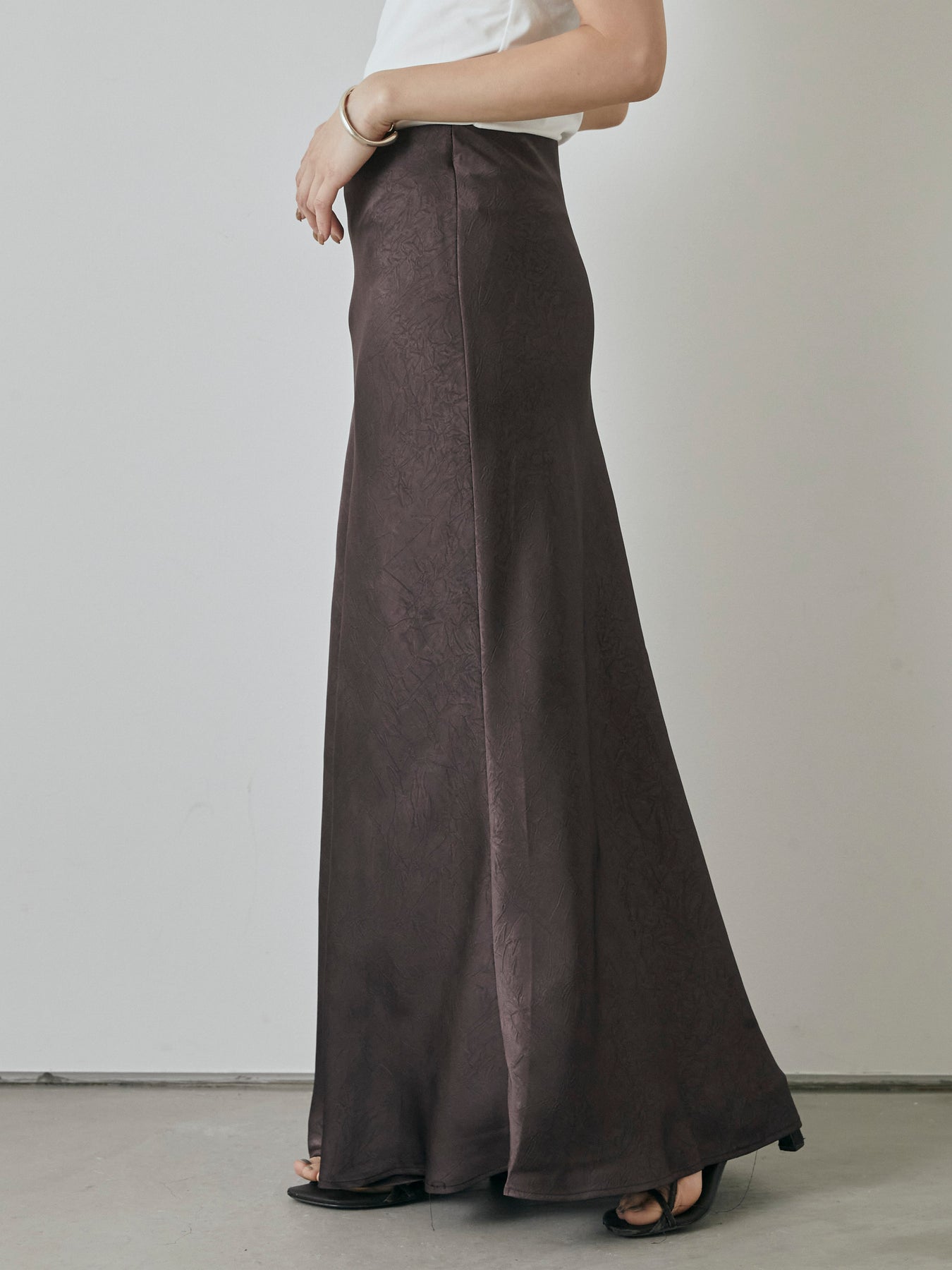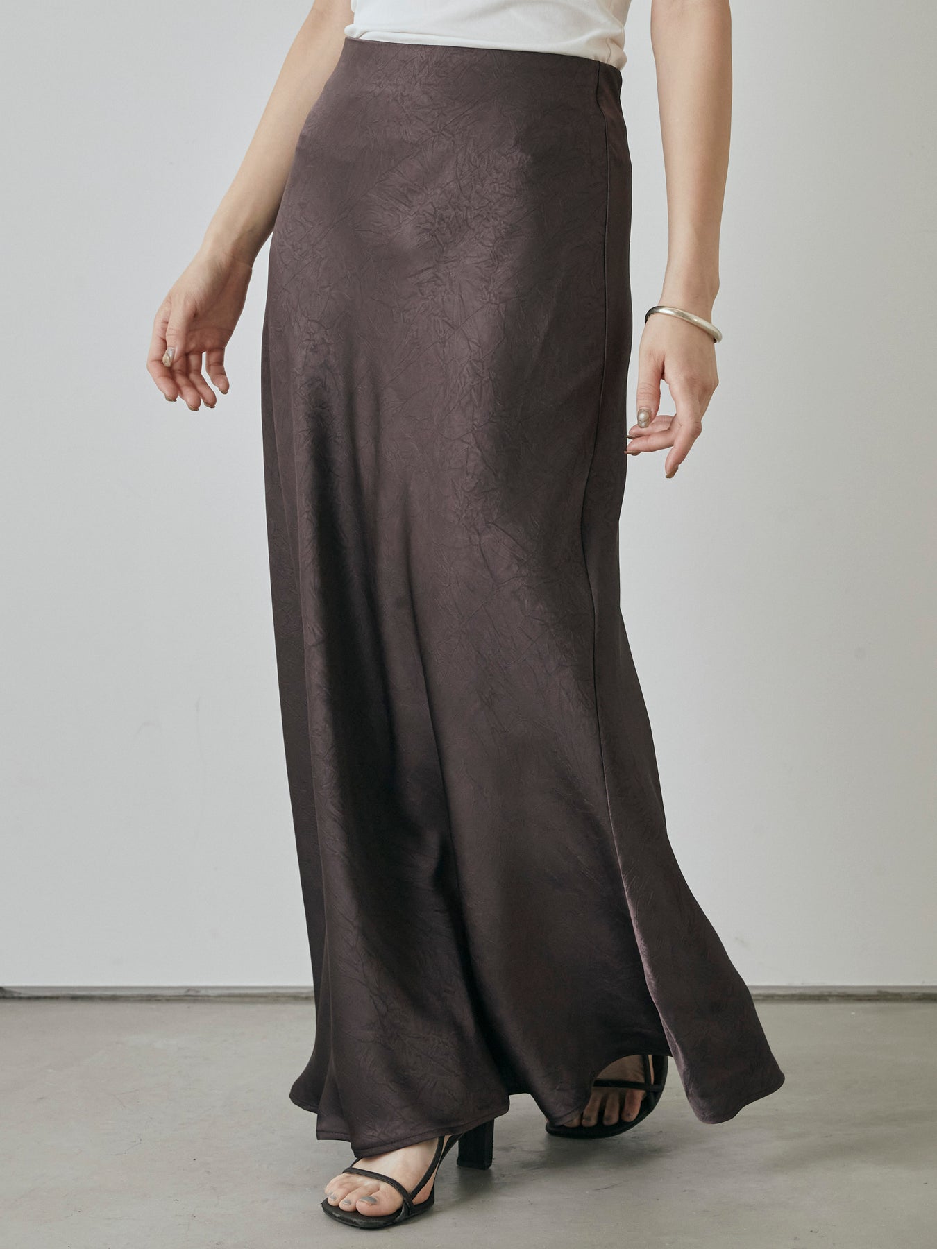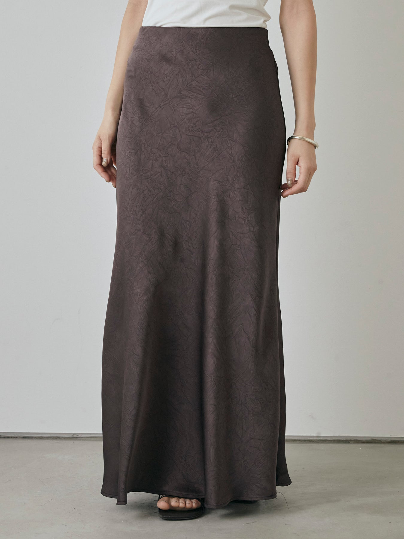 さりげない光沢感とワッシャー加工の表情が魅力の、大人のためのサテンナロースカート。 上品な艶感のある素材に、表面のシボ感が加わることで、シンプルながら奥行きのある印象に仕上がっています。 腰まわりはすっきりと、裾にかけてややフレアに広がる美しいシルエットが女性らしさを引き立て、スタイルアップ効果も抜群。 ストレッチ性のある裏地付きで、動きやすさと安心感も兼ね備えています。 Tシャツやシャツと合わせてカジュアルダウンするのはもちろん、ノースリーブやブラウスでキレイめに仕上げるのもおすすめ。 デイリーからちょっとしたお出かけまで、幅広く活躍する万能スカートです。