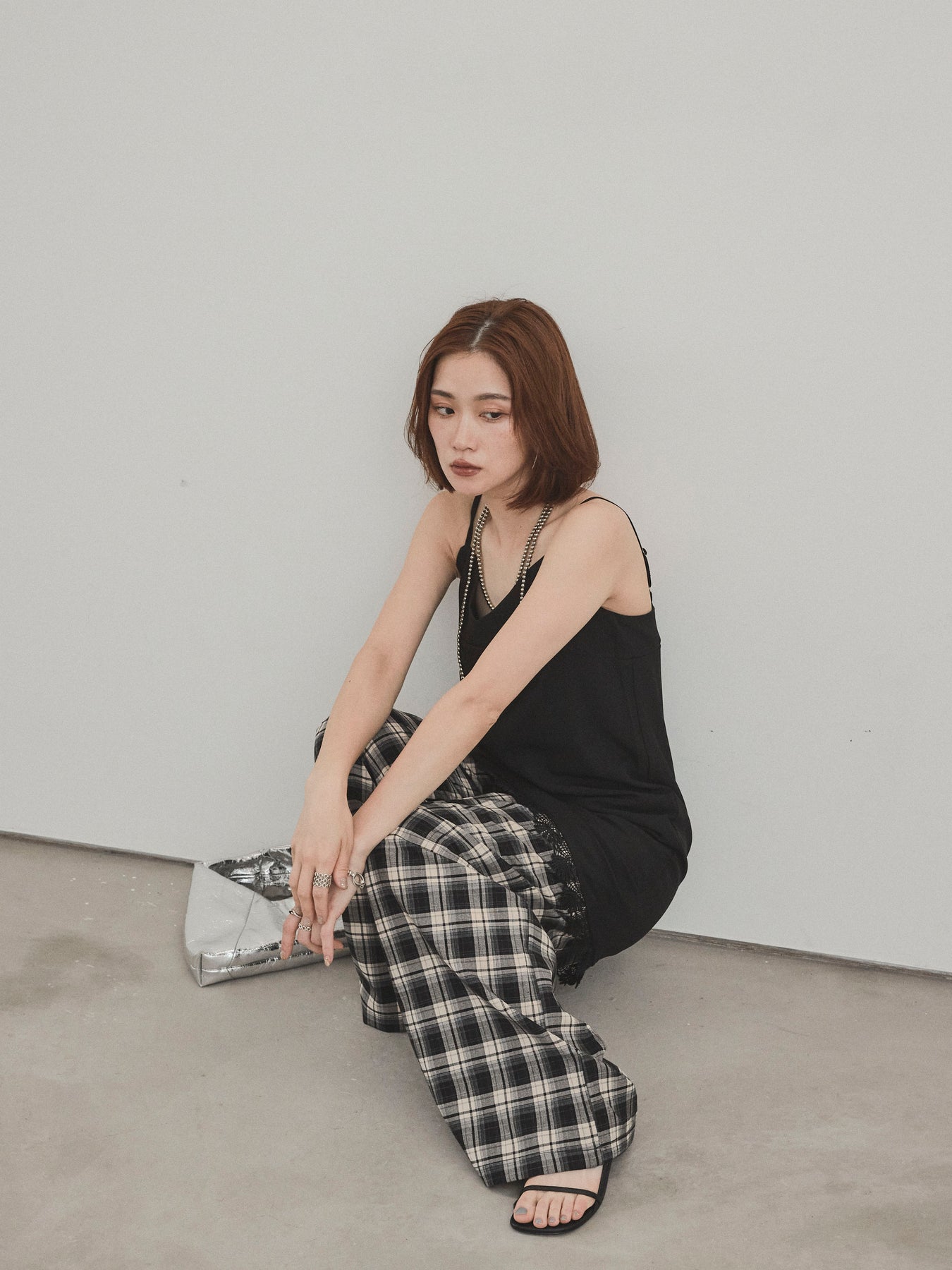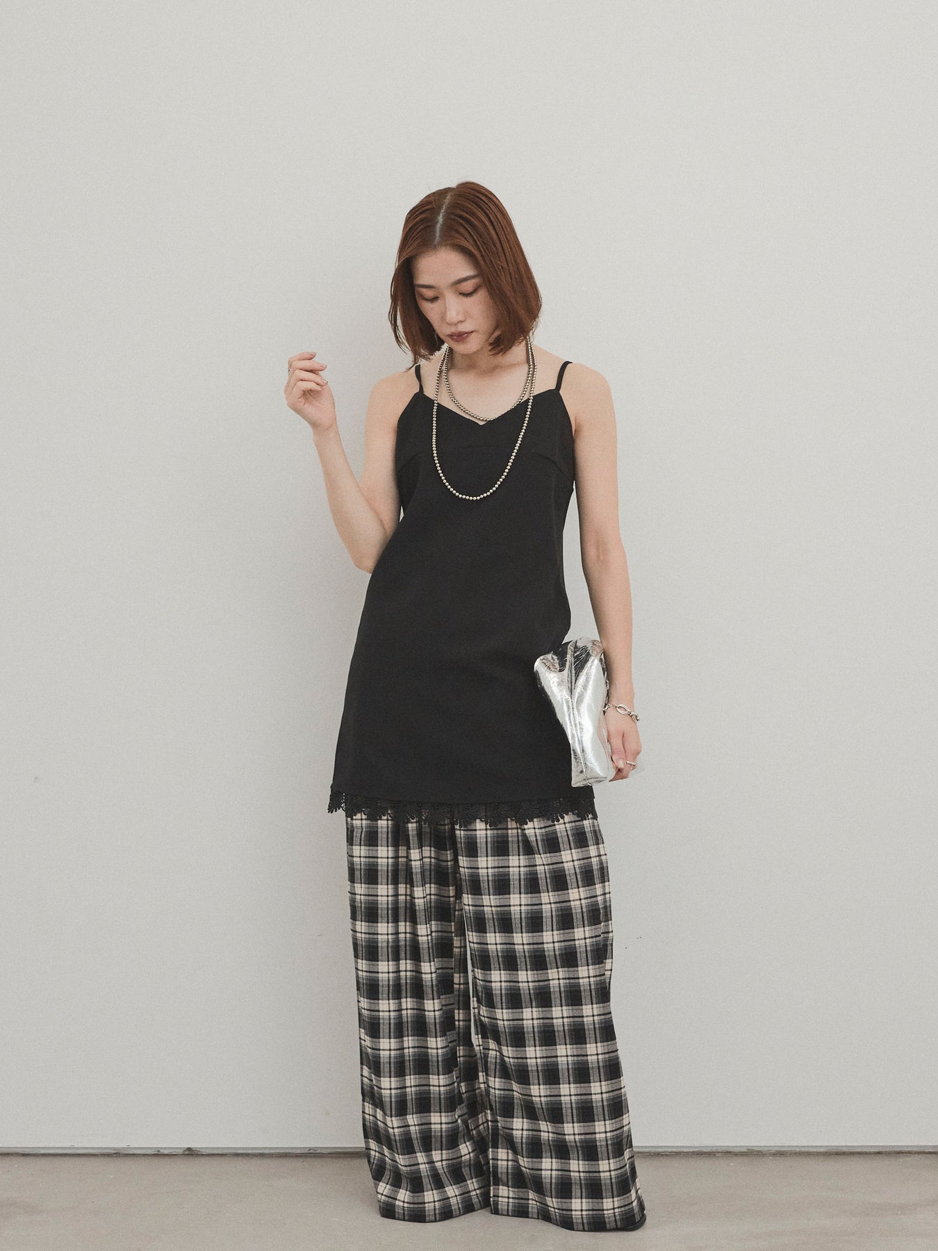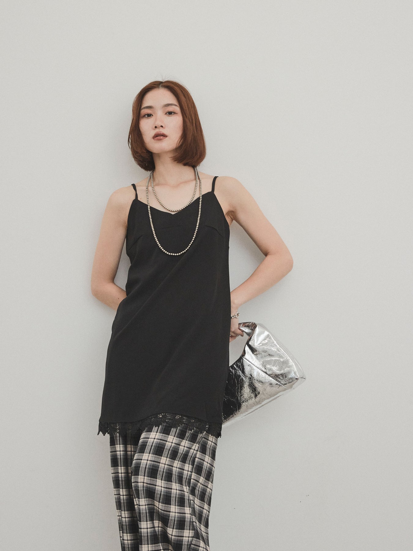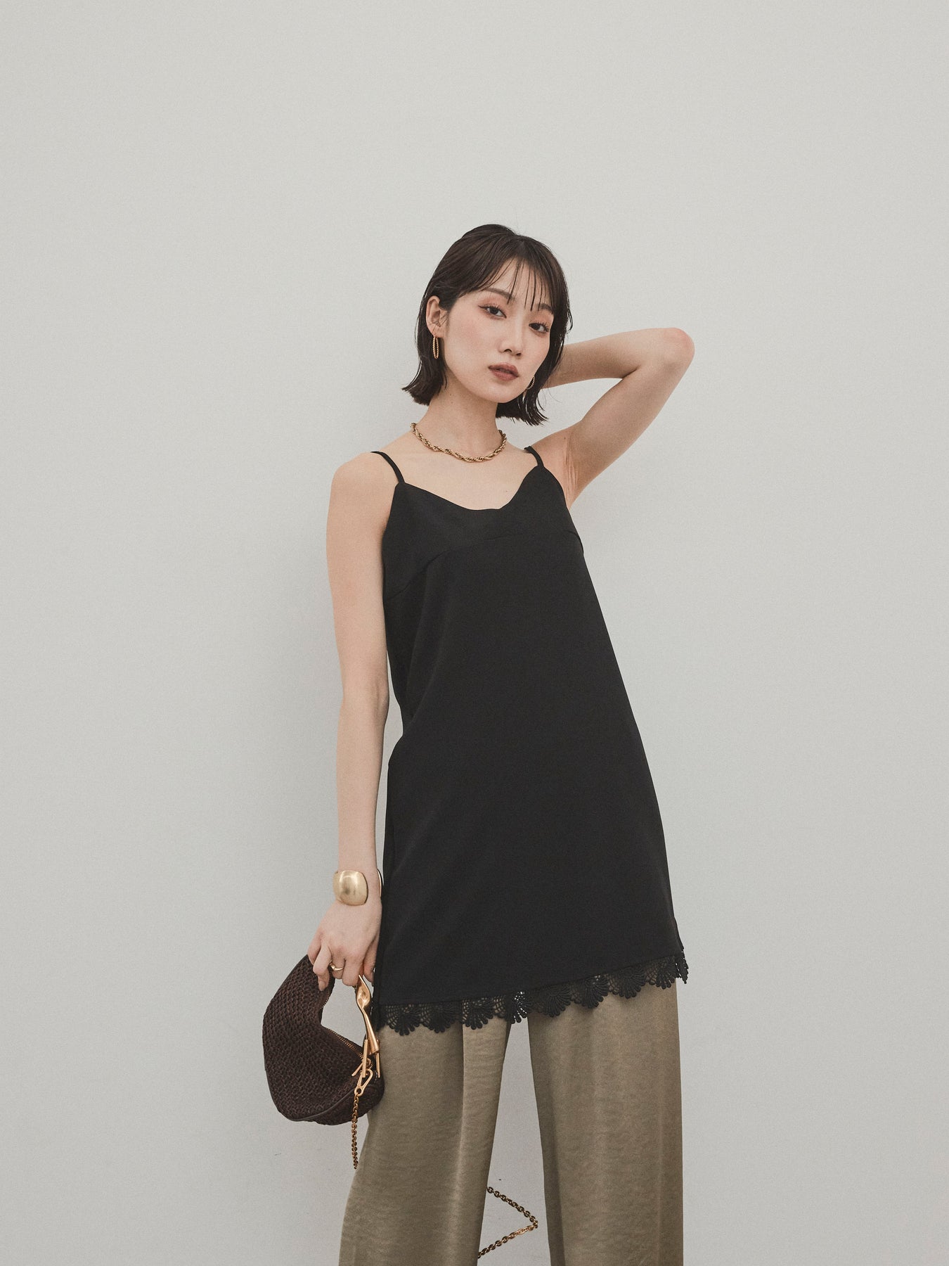 裾にあしらわれた繊細なレースが目を惹く、フェミニンムード漂うキャミミニワンピース。 落ち感のある滑らかな素材で仕立てられ、すとんとしたシルエットが大人の余裕を感じさせます。 華奢なストラップとデコルテラインを綺麗に見せるカッティングが、抜け感を演出しつつ上品な印象に。 裾のレースがさりげなくアクセントになり、レイヤードスタイルにも映えるデザインです。 パンツやデニムとのレイヤードはもちろん、シアートップスやカーディガンとの組み合わせもおすすめ。 ロングシーズン活躍する、ワードローブに加えたい一着です。