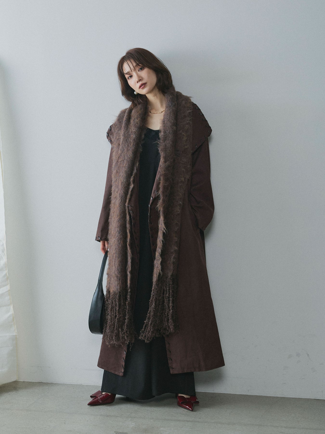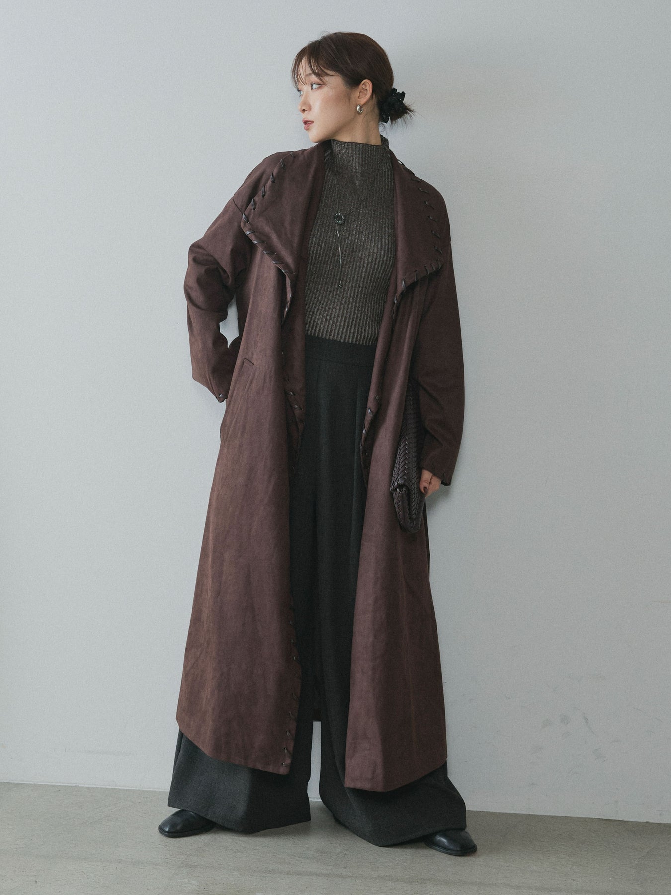 柔らかな風合いと上品なマット感が魅力のスウェード調素材を使用したロングコート。全体に施されたハンドステッチが、クラフト感と温かみを添え、羽織るだけでスタイルのアクセントに。程よい厚みと軽やかな着心地で、秋から冬にかけてロングシーズン活躍。ウエストベルト付きでシルエットの変化も楽しめ、カジュアルからきれいめまで幅広い着こなしにマッチします。