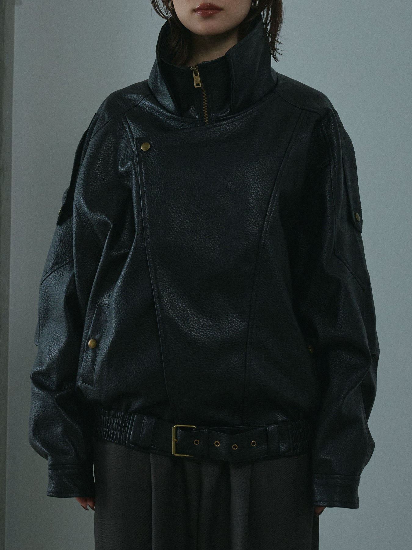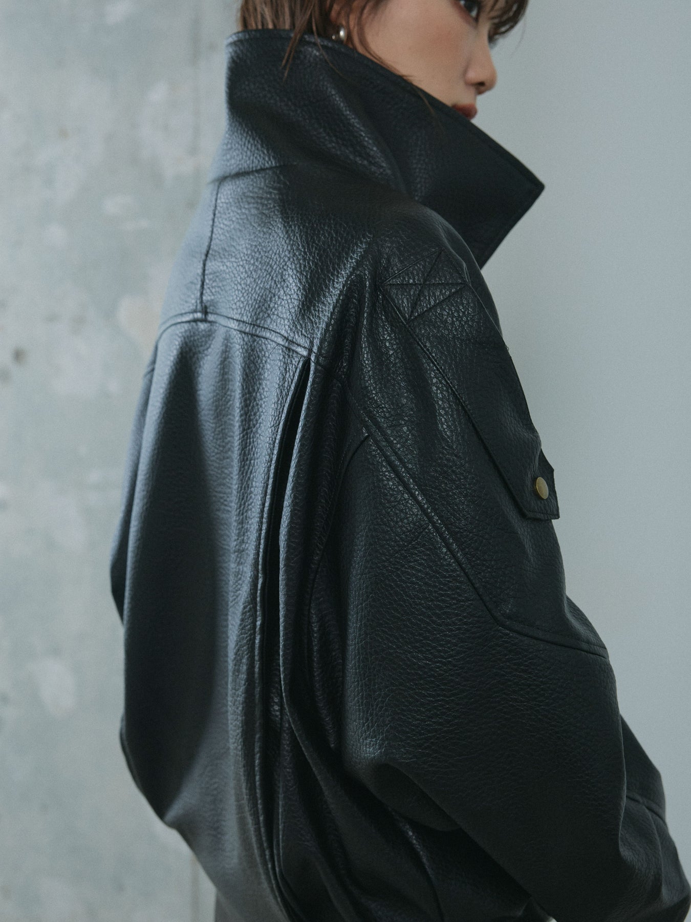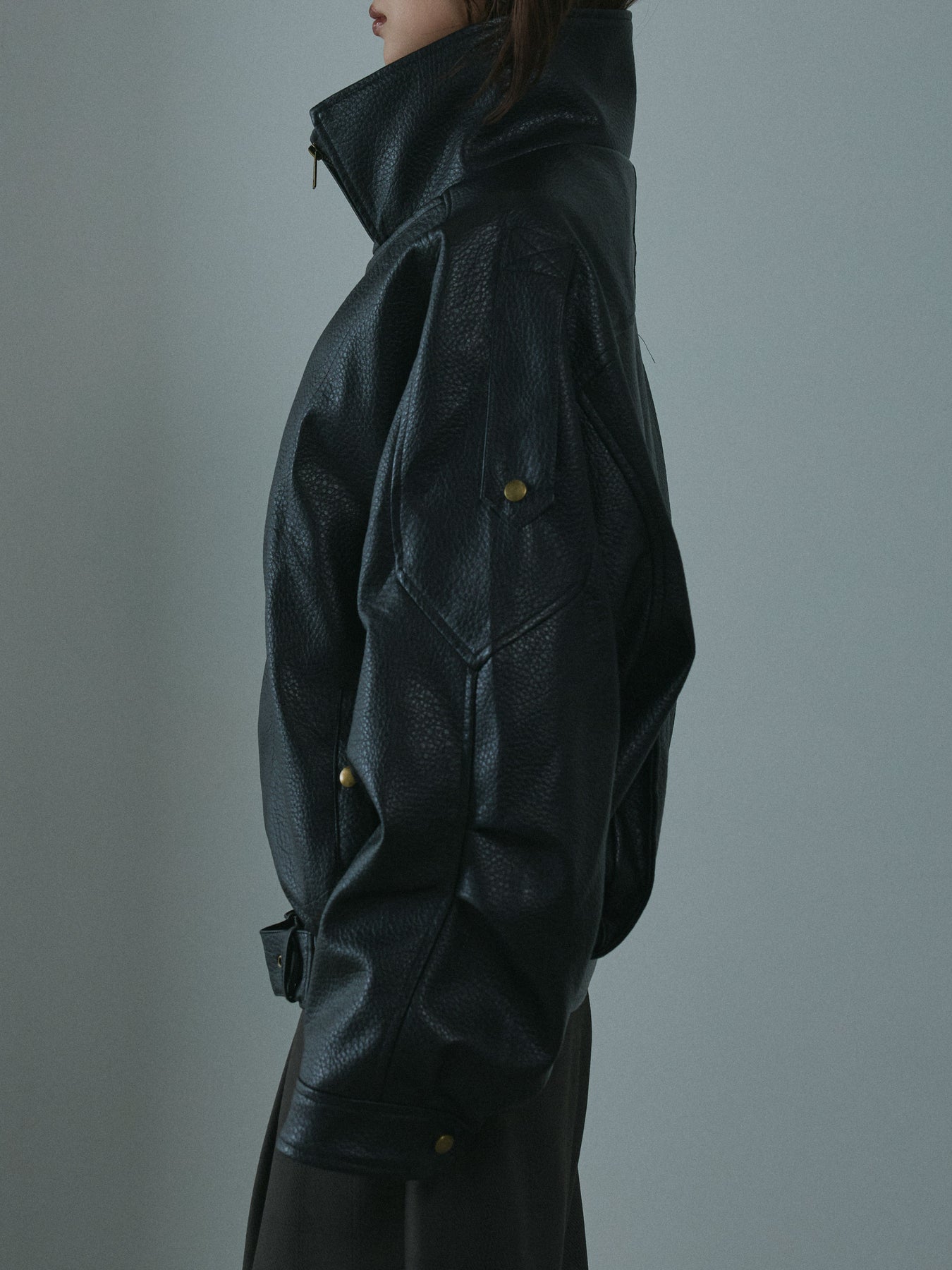 程よい艶感と重厚感のあるフェイクレザーを使用したスタンドカラーブルゾン。 ややオーバーサイズなシルエットで、羽織るだけでモードな雰囲気を演出します。 柔らかく馴染むフェイクレザー素材が、メンズライクな印象の中にも女性らしさを引き立てる一着。 首元までしっかり閉められるスタンドカラー仕様で、防寒性とデザイン性を両立。 裾や袖口のベルトディテールがアクセントとなり、シンプルなスタイリングに深みを加えます。 デイリーから特別な日のコーディネートまで幅広く活躍するアイテムです。 ※ボトムス、キャミソール(インナー)以外の商品は一律でインナーは付属していません。