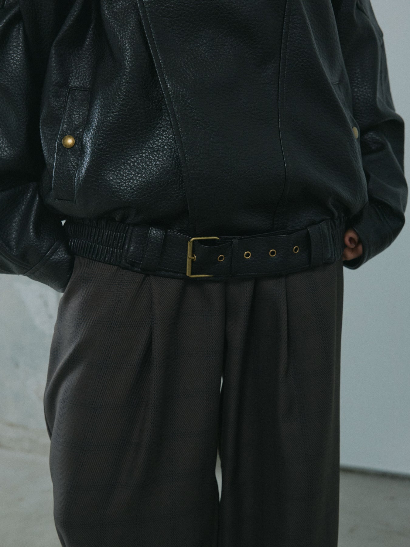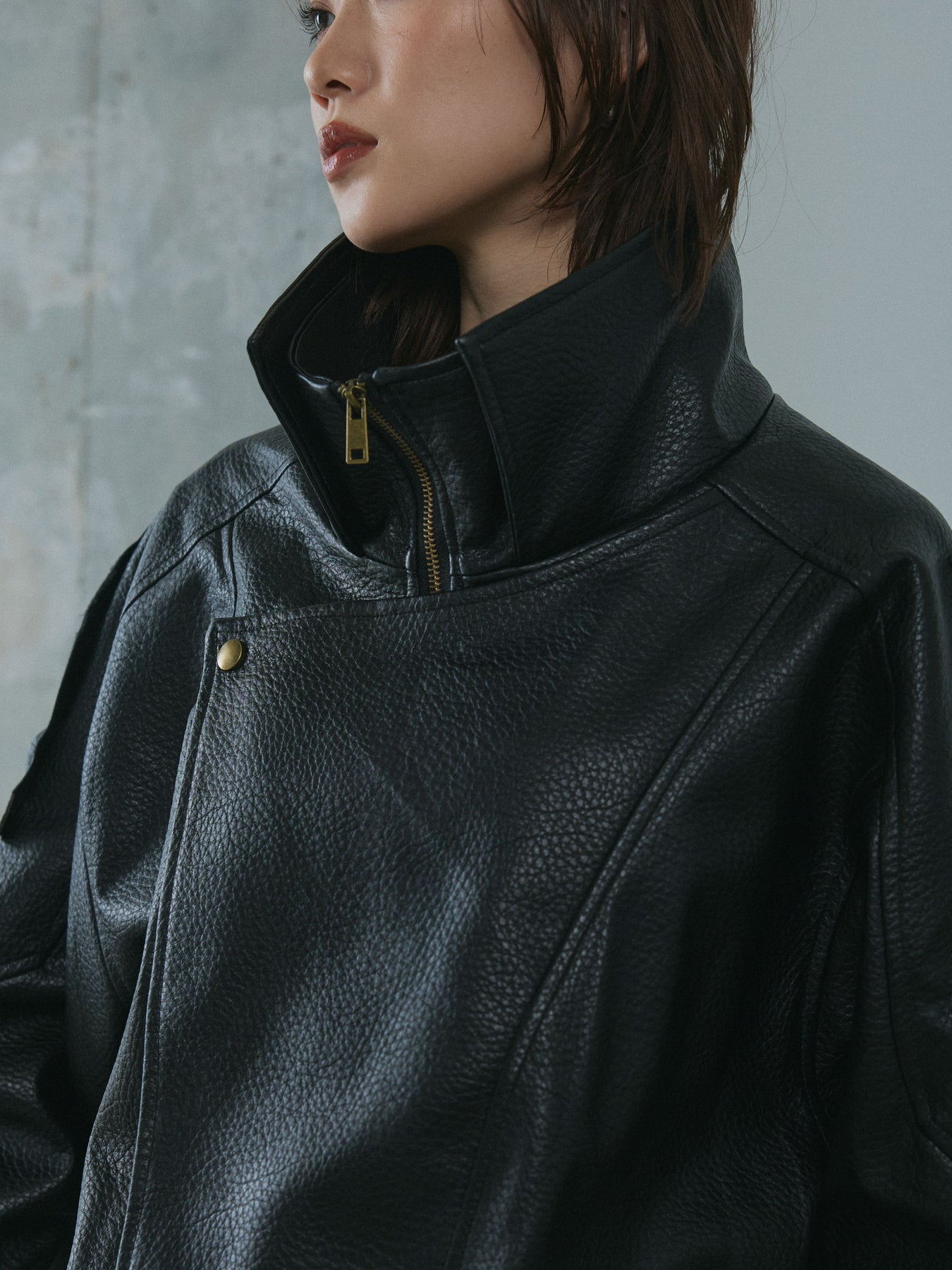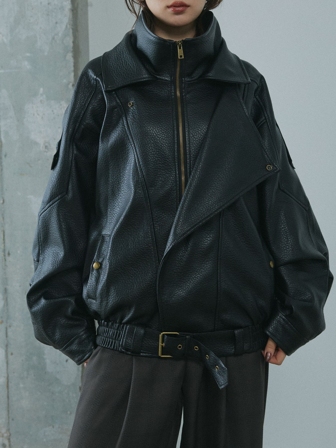 程よい艶感と重厚感のあるフェイクレザーを使用したスタンドカラーブルゾン。 ややオーバーサイズなシルエットで、羽織るだけでモードな雰囲気を演出します。 柔らかく馴染むフェイクレザー素材が、メンズライクな印象の中にも女性らしさを引き立てる一着。 首元までしっかり閉められるスタンドカラー仕様で、防寒性とデザイン性を両立。 裾や袖口のベルトディテールがアクセントとなり、シンプルなスタイリングに深みを加えます。 デイリーから特別な日のコーディネートまで幅広く活躍するアイテムです。 ※ボトムス、キャミソール(インナー)以外の商品は一律でインナーは付属していません。