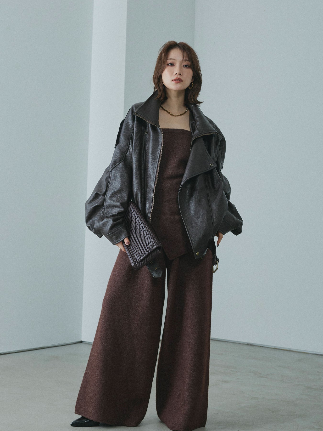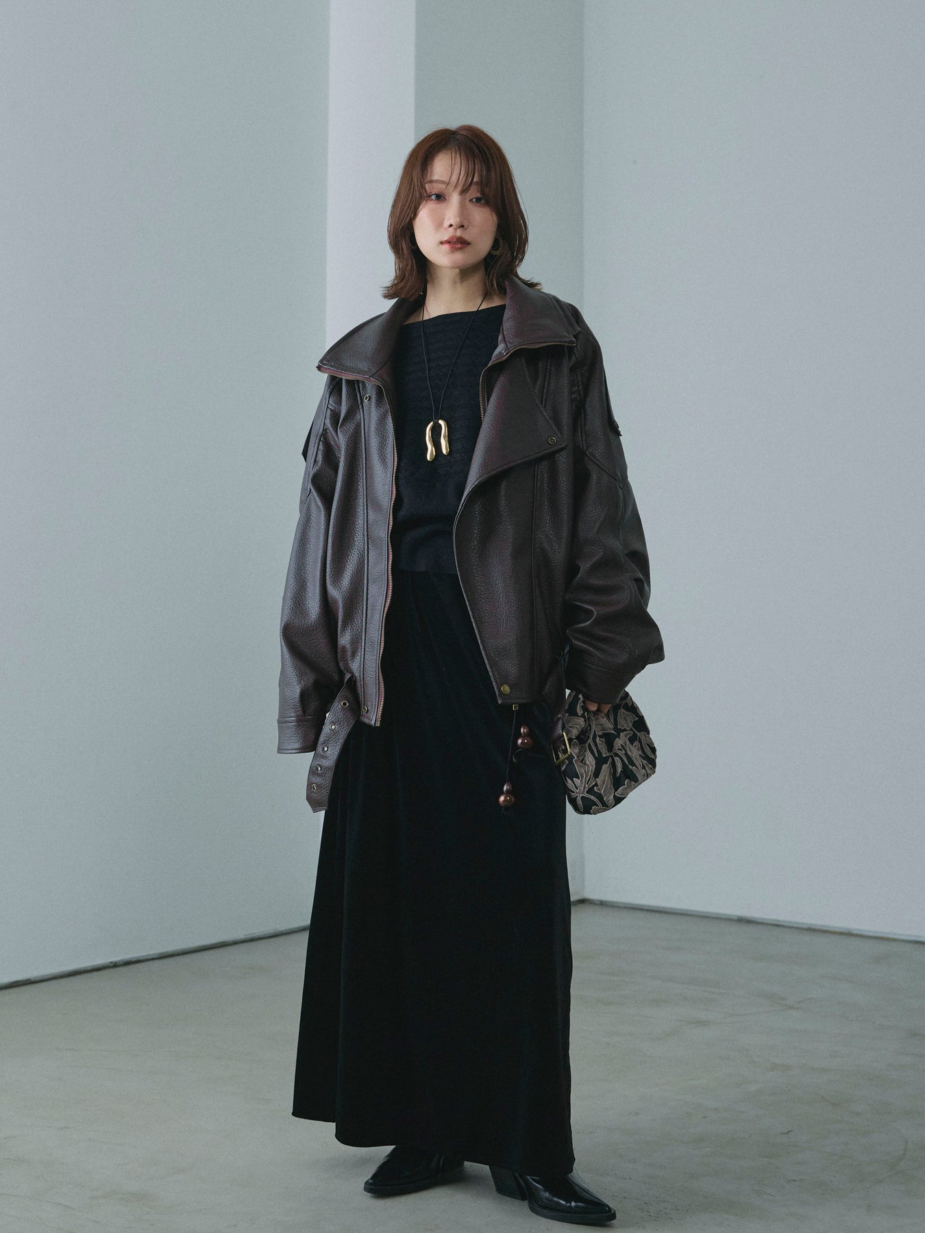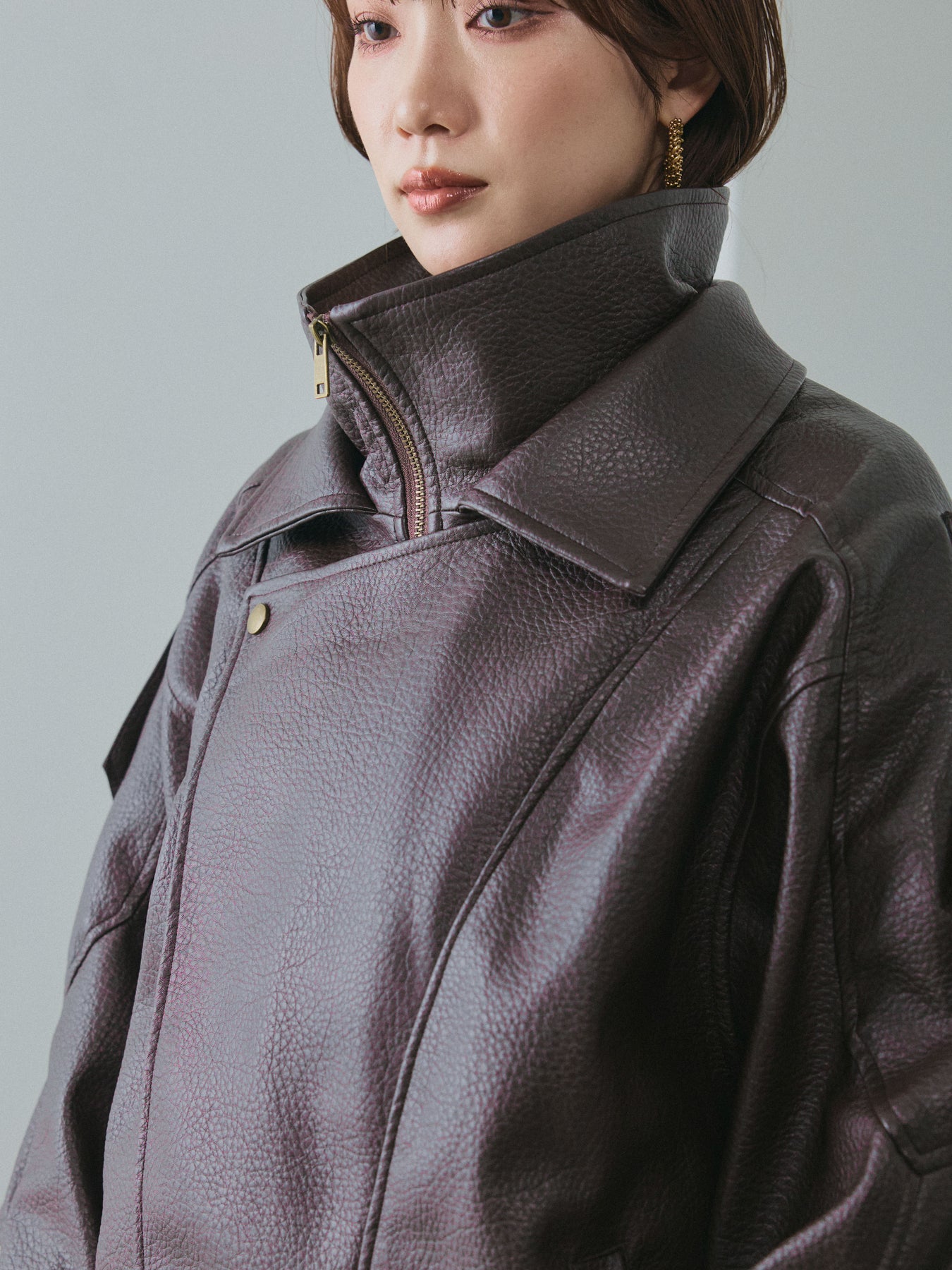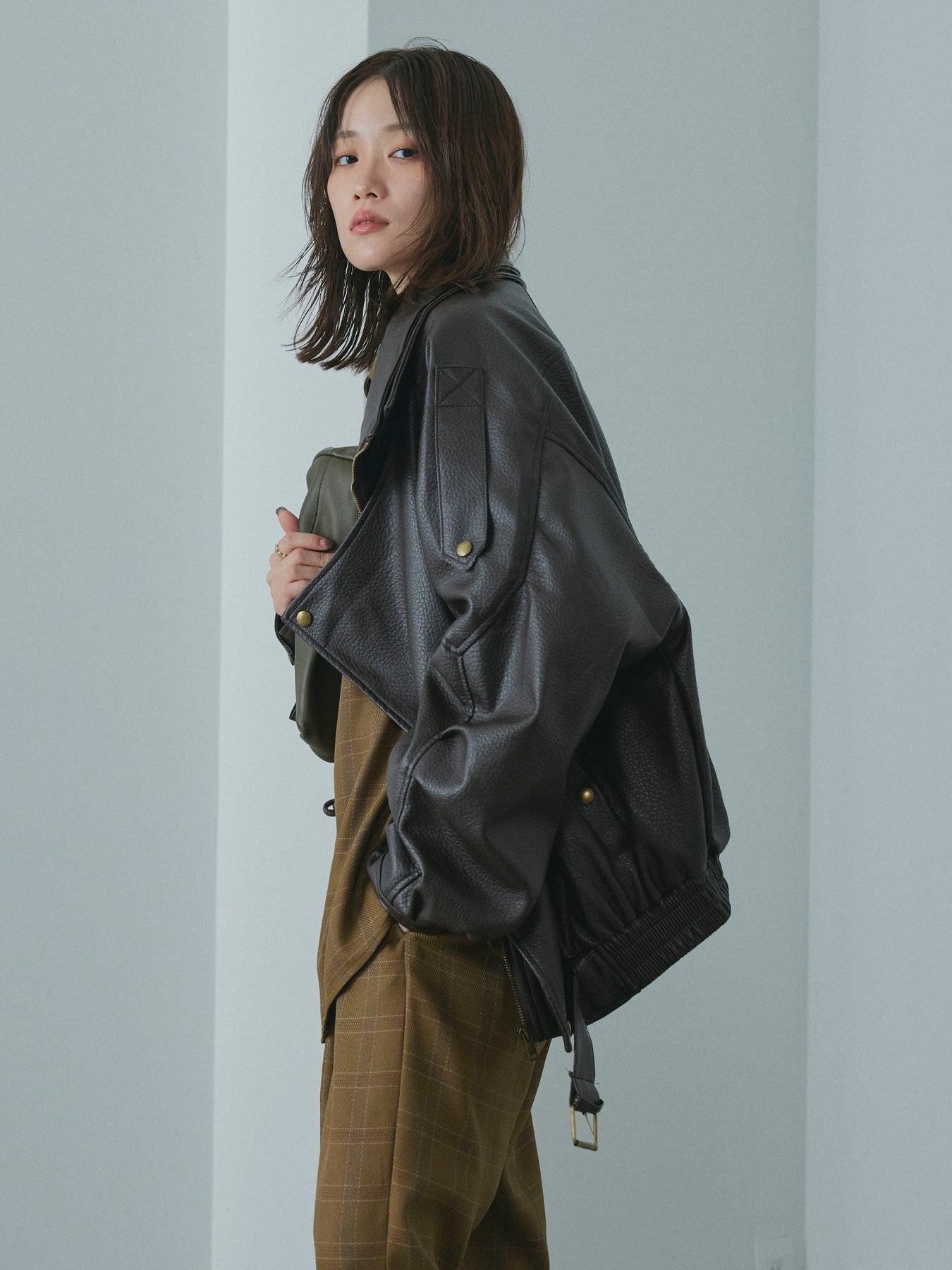 程よい艶感と重厚感のあるフェイクレザーを使用したスタンドカラーブルゾン。 ややオーバーサイズなシルエットで、羽織るだけでモードな雰囲気を演出します。 柔らかく馴染むフェイクレザー素材が、メンズライクな印象の中にも女性らしさを引き立てる一着。 首元までしっかり閉められるスタンドカラー仕様で、防寒性とデザイン性を両立。 裾や袖口のベルトディテールがアクセントとなり、シンプルなスタイリングに深みを加えます。 デイリーから特別な日のコーディネートまで幅広く活躍するアイテムです。 ※ボトムス、キャミソール(インナー)以外の商品は一律でインナーは付属していません。
