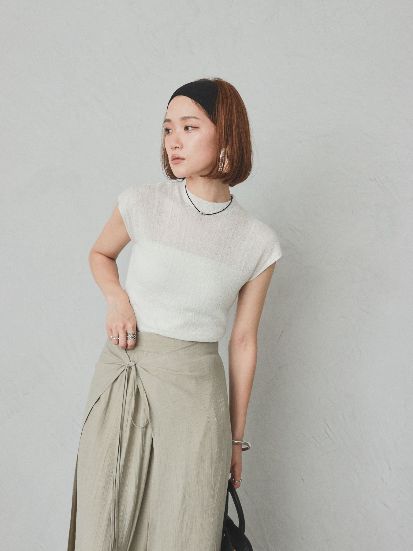 ほどよい透け感が涼しげな印象を与える、フレンチスリーブのシアーニットトップス。柔らかく伸縮性のある素材で、軽やかな着心地が魅力の一枚です。コンパクトながらもボディラインを拾いすぎない絶妙なシルエットで、どんなボトムともバランス良く着こなせます。シンプルながらもニュアンスのある表情があり、インナーとのレイヤードを楽しめるのもポイント。デイリーからオフィスカジュアルまで幅広く活躍する、着回し力抜群のアイテムです。 ※ボトムス、キャミソール(インナー)以外の商品は一律でインナーは付属していません。